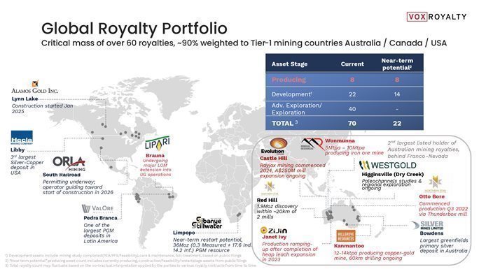 Kyle Floyd, Chief Executive Officer, stated: “Vox has delivered another strong quarter marked by positive cash flow, an increase in comparative quarter royalty receipts, the accretive acquisition of a producing copper-gold royalty at Kanmantoo, inclusion in the Russell 2000® and Russell 3000® indexes, and considerable organic asset developments. The growth potential embedded in our diversified and growing portfolio are underscored by continued operator developments across key royalty-linked projects. These developments include; a major expansion at Binduli North, initial construction earthworks at Sulphur Springs, and a development decision at Horseshoe Lights. We expect revenue and operating income to increase in the second half of the year, primarily driven by production increases across many of our gold royalty assets and a modest commodity price increase effect on the Wonmunna iron ore royalty. Alongside our embedded growth, the business maintains over $13 million in cash and receivables at quarter-end. Vox is well positioned to execute on its disciplined growth strategy with a pipeline of royalty acquisition opportunities that continues to build very positively.”