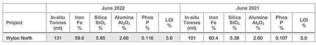 Table 1 – Wyloo North Mineral Resource within Greater Western Hub (June 2022)