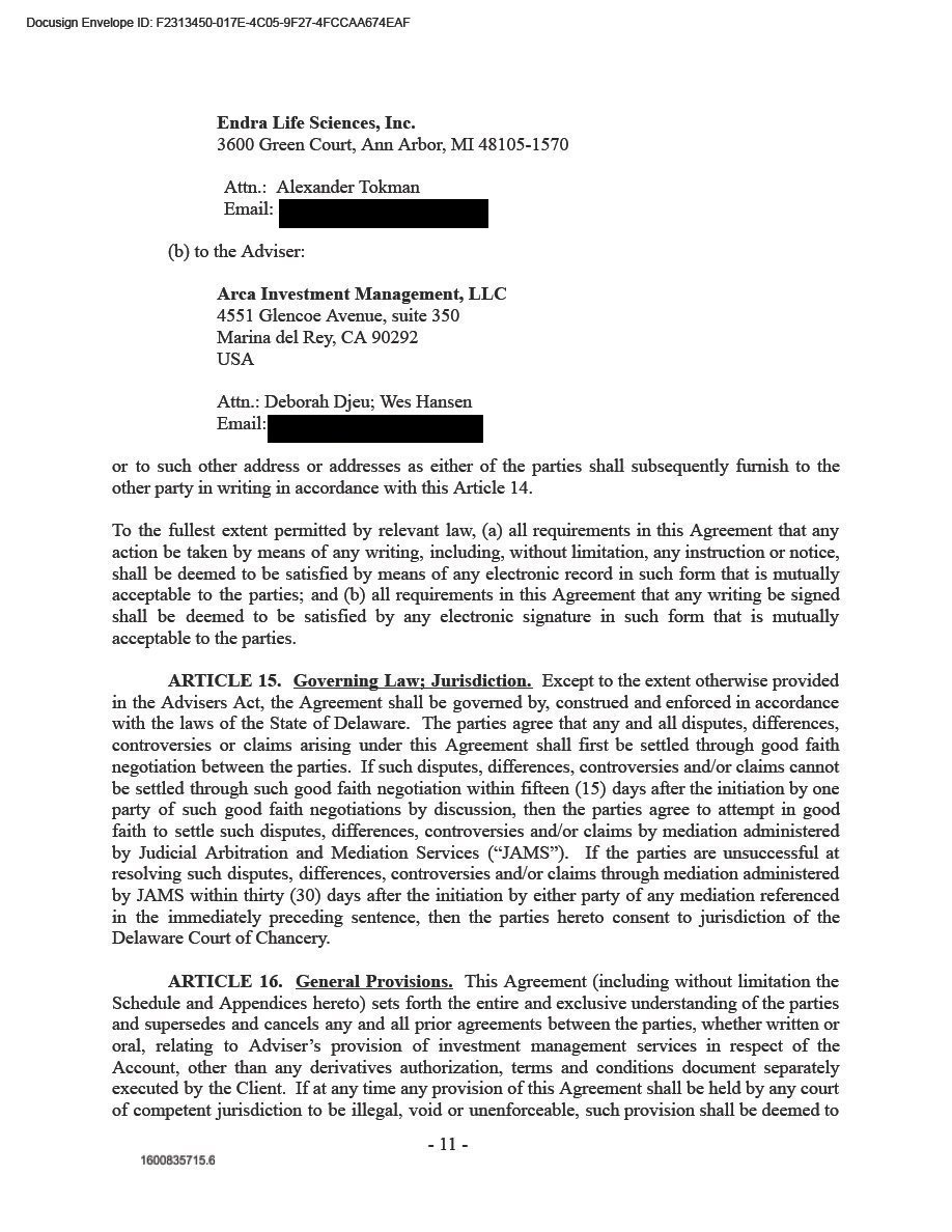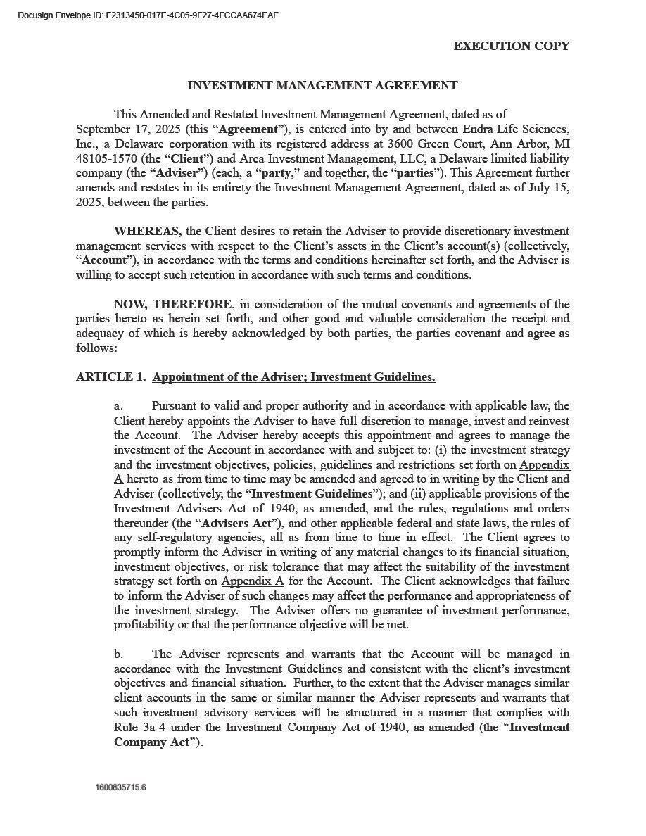 “Establishing a digital asset treasury is a logical extension of our capital allocation strategy,” said Alexander Tokman, CEO of ENDRA Life Sciences. “By coupling high‑conviction exposure to digital assets with a variety of DeFi-native yield enhancement techniques, we aim to generate durable yield, manage risk and open new avenues for value creation. Arca is a proven leader in the cryptocurrency asset management and development space and we look forward to adding Jeff to our Digital Asset Advisory Board. We expect that he will be instrumental in helping guide ENDRA into the future of digital finance.”