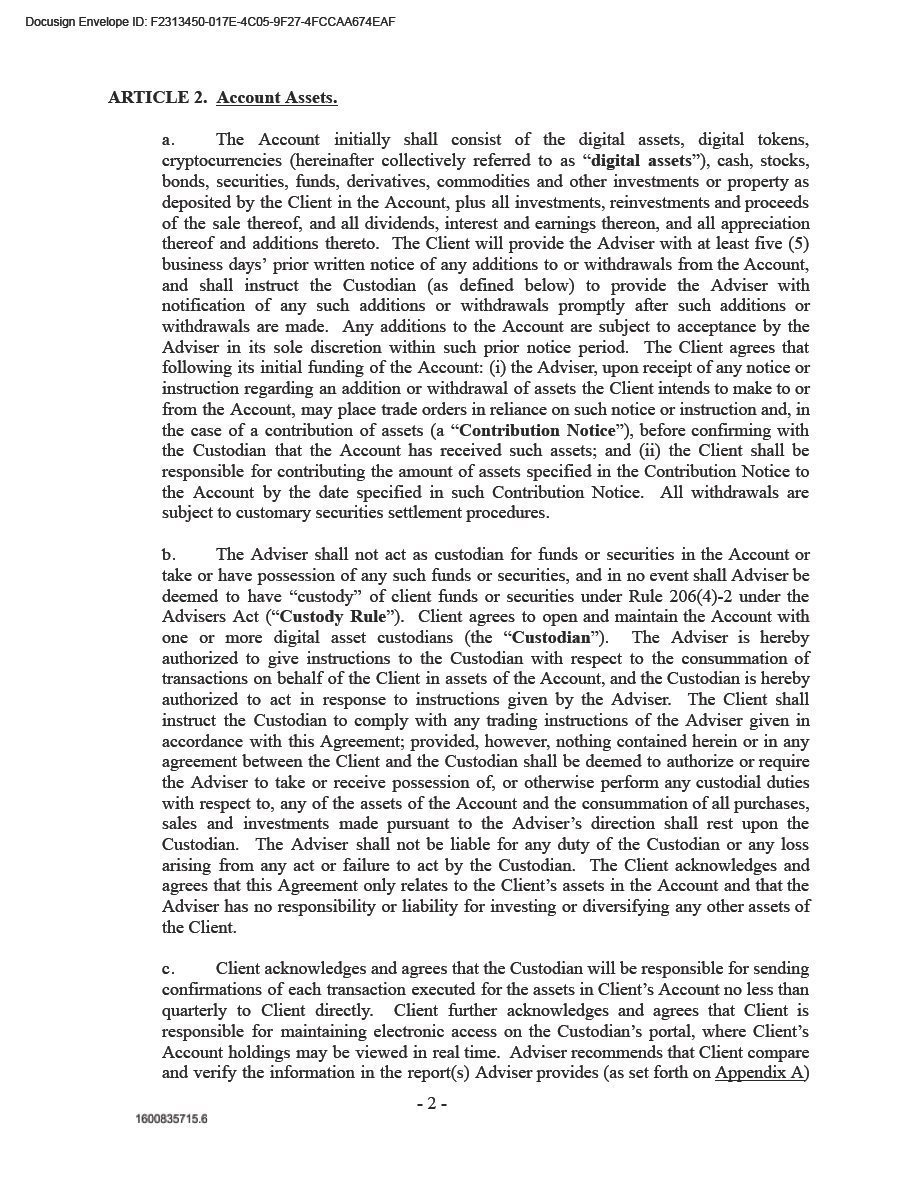 The foregoing description of the Custody Agreement does not purport to be complete and is qualified in its entirety by the full text of such document, which is incorporated by reference herein as Exhibit 10.4.