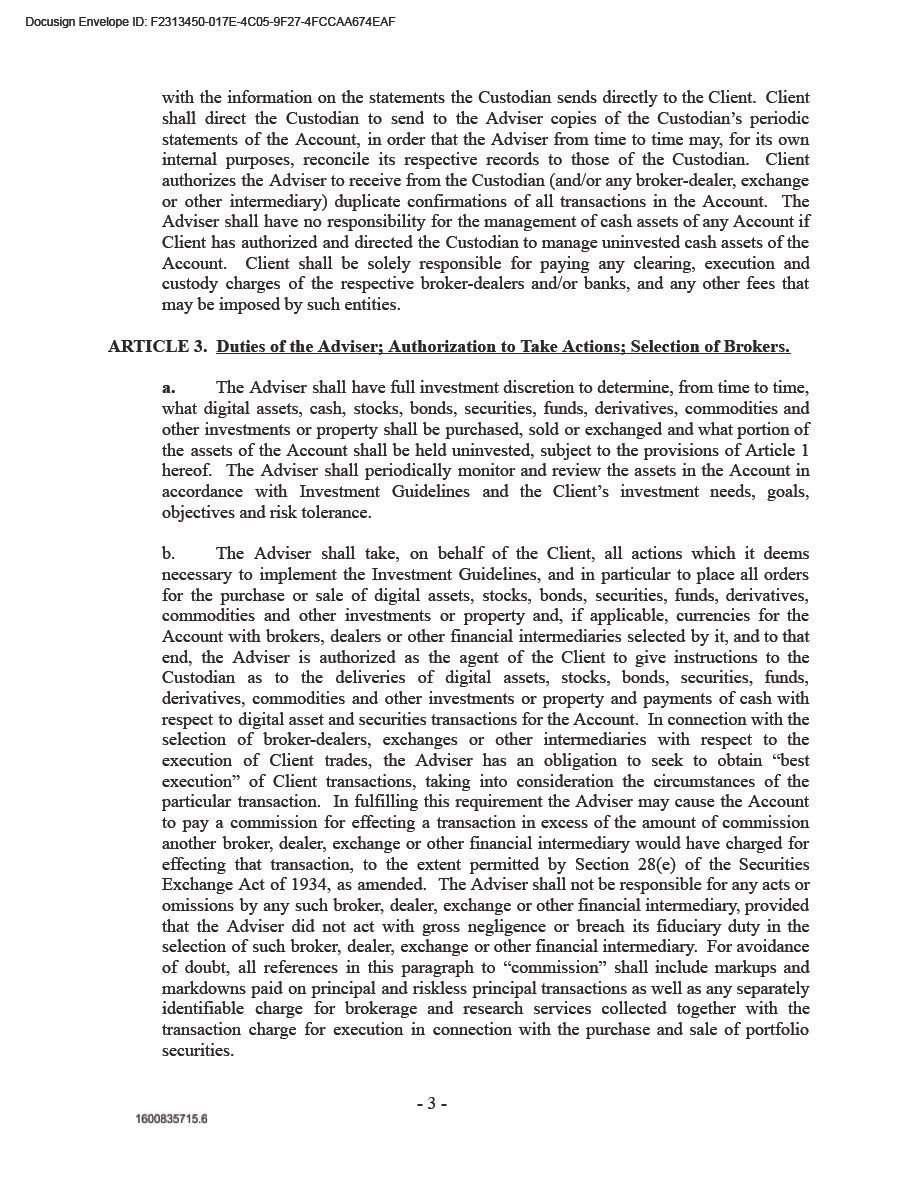 In connection with the Company’s DAT strategy, the Company entered into an Amended and Restated Investment Management Agreement (the “Investment Management Agreement”) with Arca Investment Management, LLC, a limited liability company (“Arca”), pursuant to which the Company engaged Arca to provide asset management services in accordance with the investment strategy and investment objectives, policies, guidelines and restrictions as agreed to from time to time by the Company and Arca.