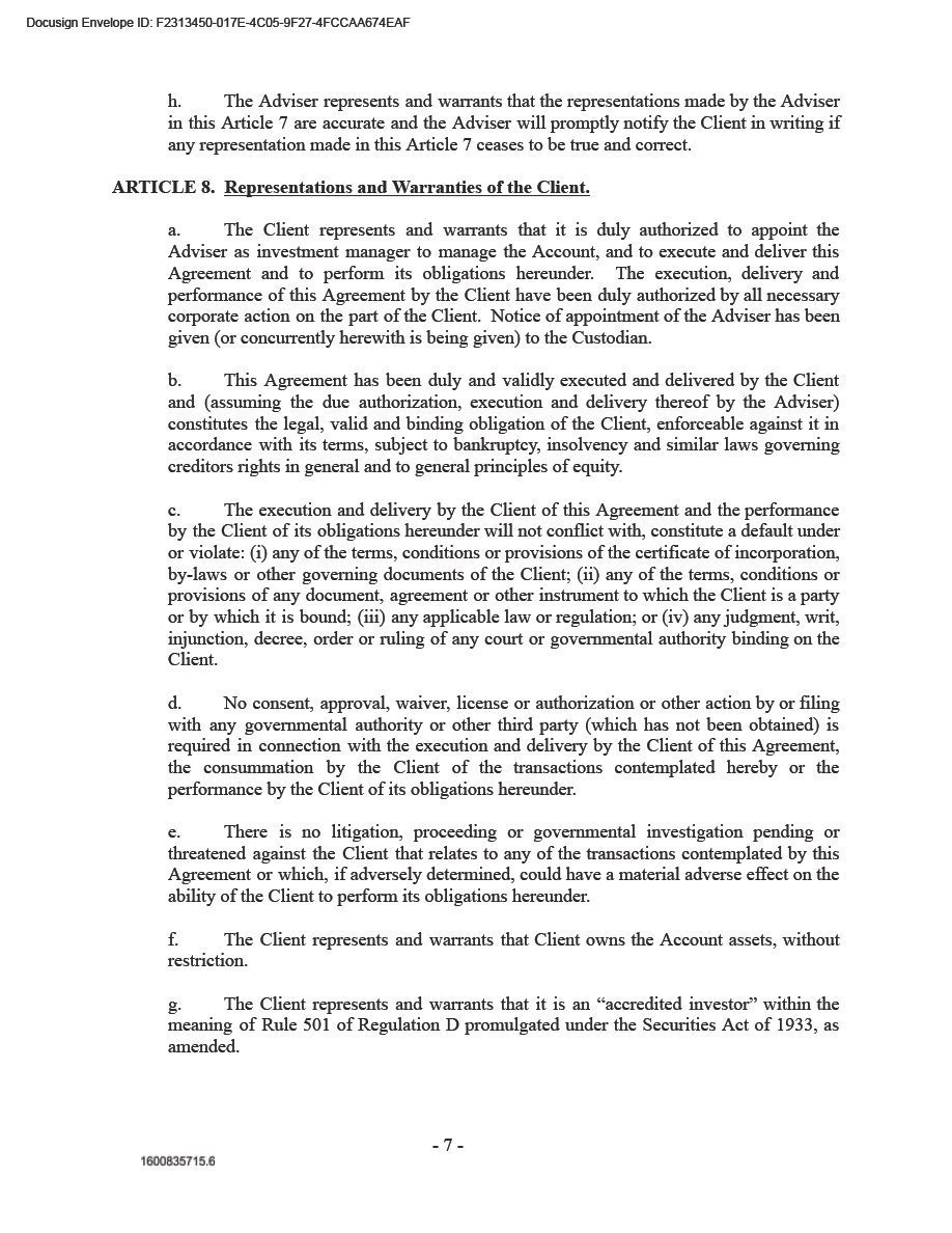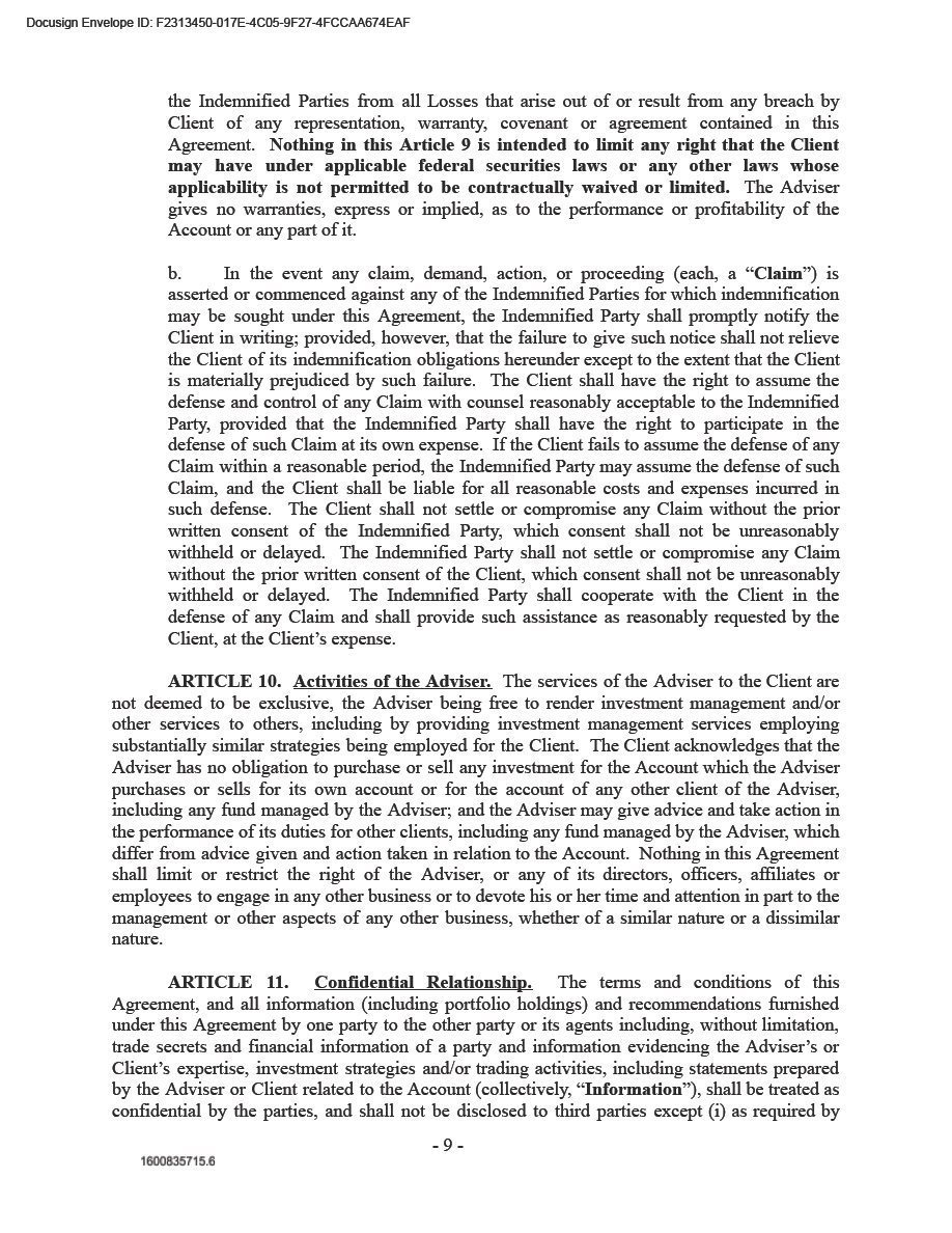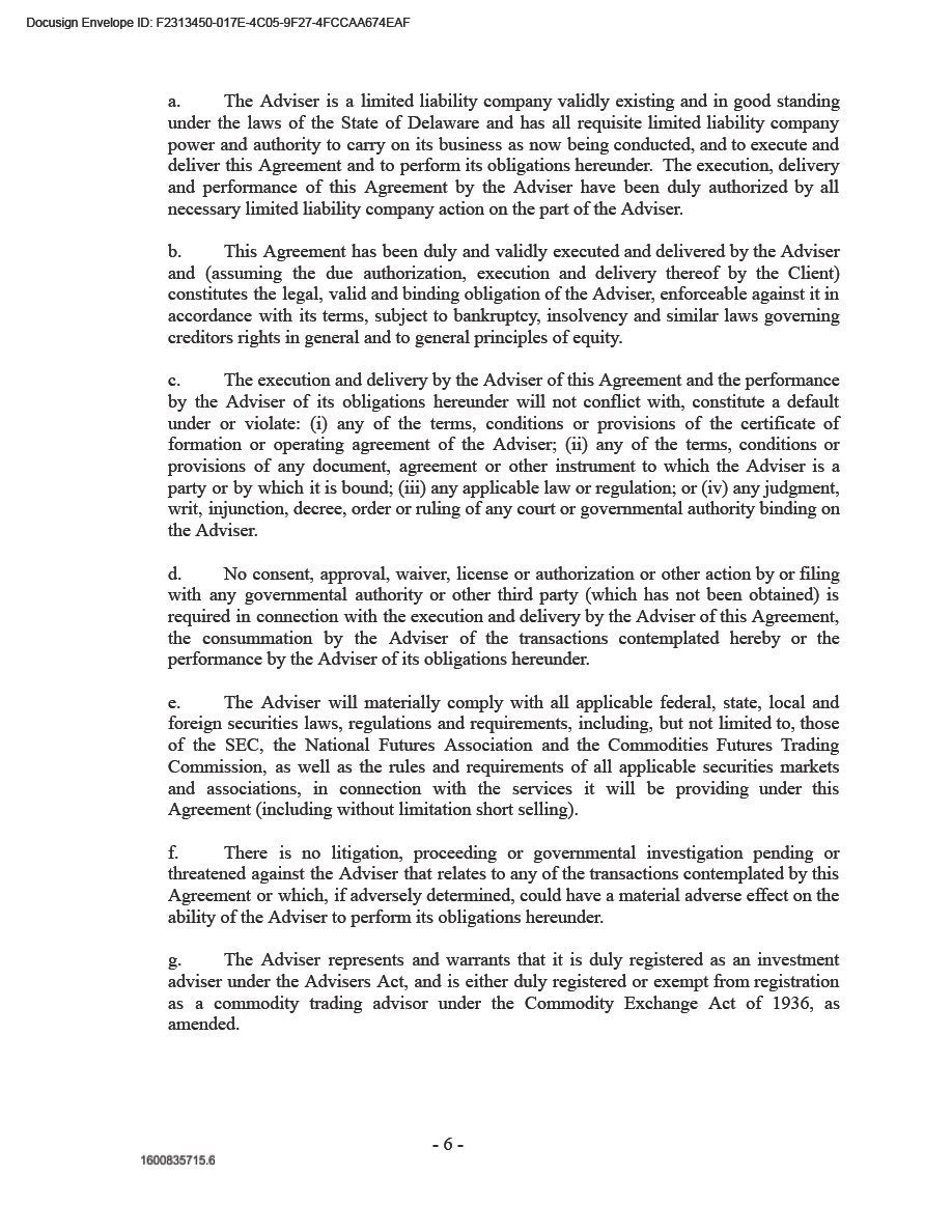 The foregoing descriptions of the Investment Management Agreement and the Advisory Warrants do not purport to be complete and are qualified in their entirety by the full text of such documents, which are filed herewith as Exhibits 10.3 and 4.4, respectively.