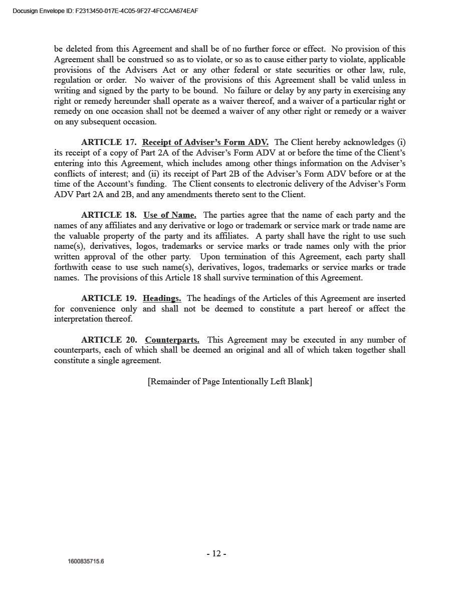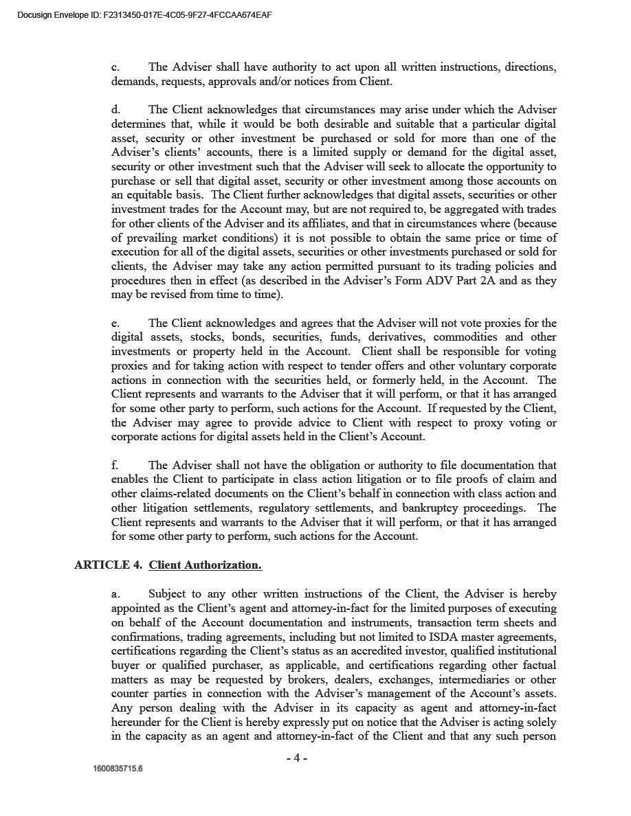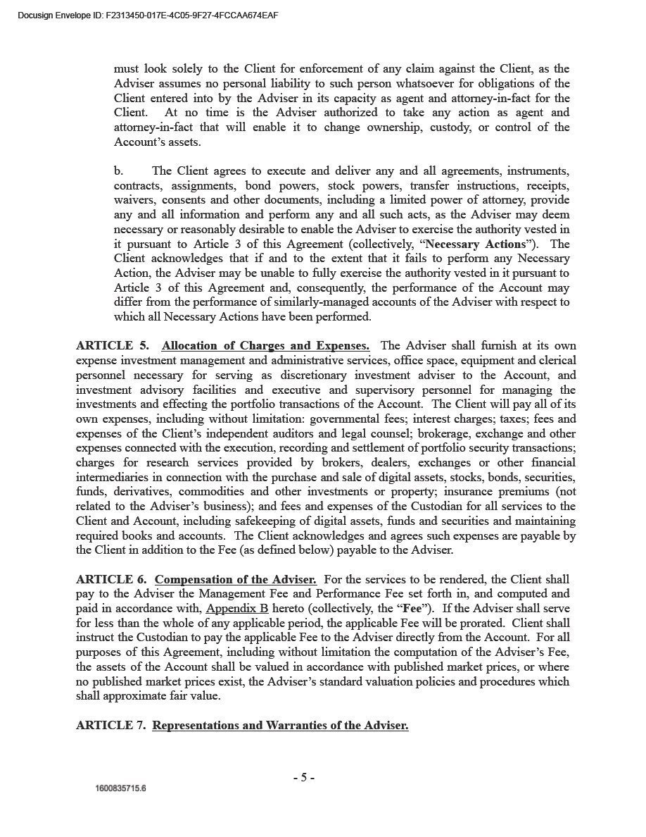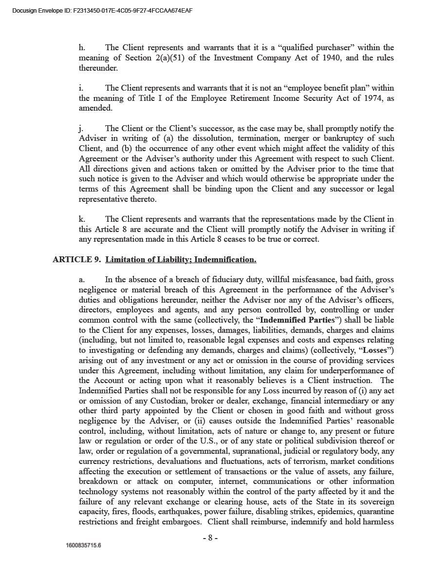 The foregoing descriptions of the Investment Management Agreement and the Advisory Warrants do not purport to be complete and are qualified in their entirety by the full text of such documents, which are filed herewith as Exhibits 10.3 and 4.4, respectively.