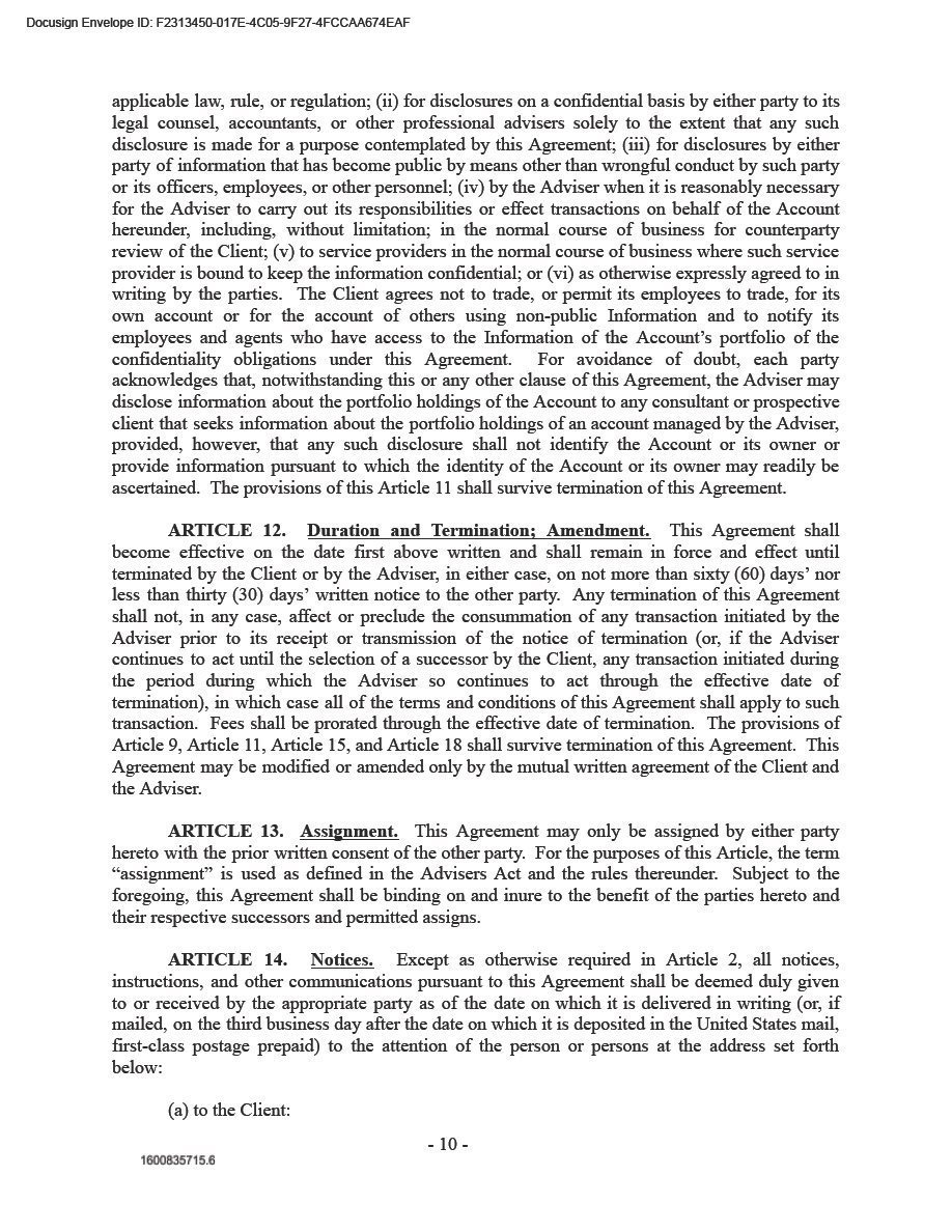 The Investment Management Agreement may be terminated by either the Company or Arca upon not more than sixty (60) days’ but not less than thirty (30) days’ written notice to the other party.