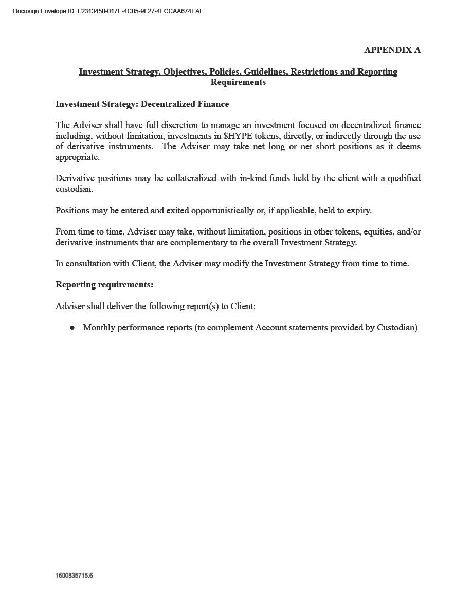 The assets subject to the Investment Management Agreement will initially consist of approximately $3.5 million of proceeds from the Offering. Arca will have discretion to manage funds allocated to the Company’s DAT strategy, focusing on decentralized finance, including, without limitation, by purchasing $HYPE, the native digital asset of the Hyperliquid network, directly or indirectly through the use of derivative instruments.
