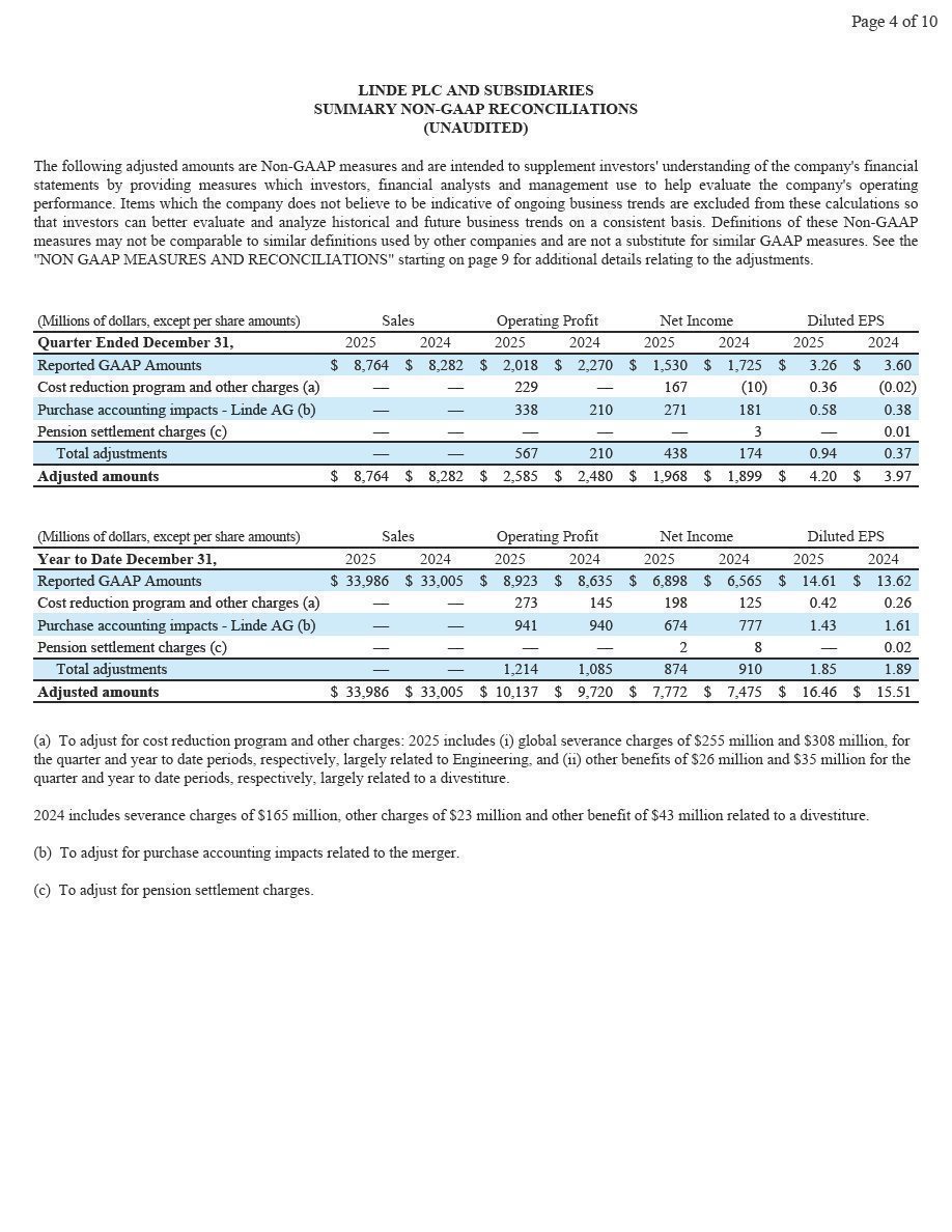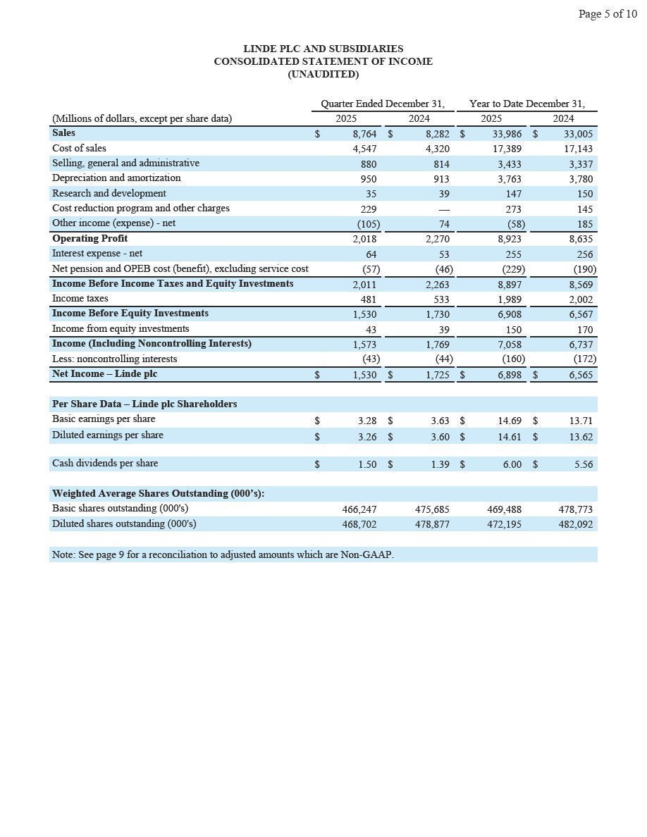 2026年2月5日、リンデ・ピーエルシーは、2025年12月31日をもって終了した四半期および通期の業績に関するプレスリリースを発表した。リンデ・ピーエルシーのプレスリリース写しは、別紙99.1として添付され、本項目2.02に参照により組み込まれる。