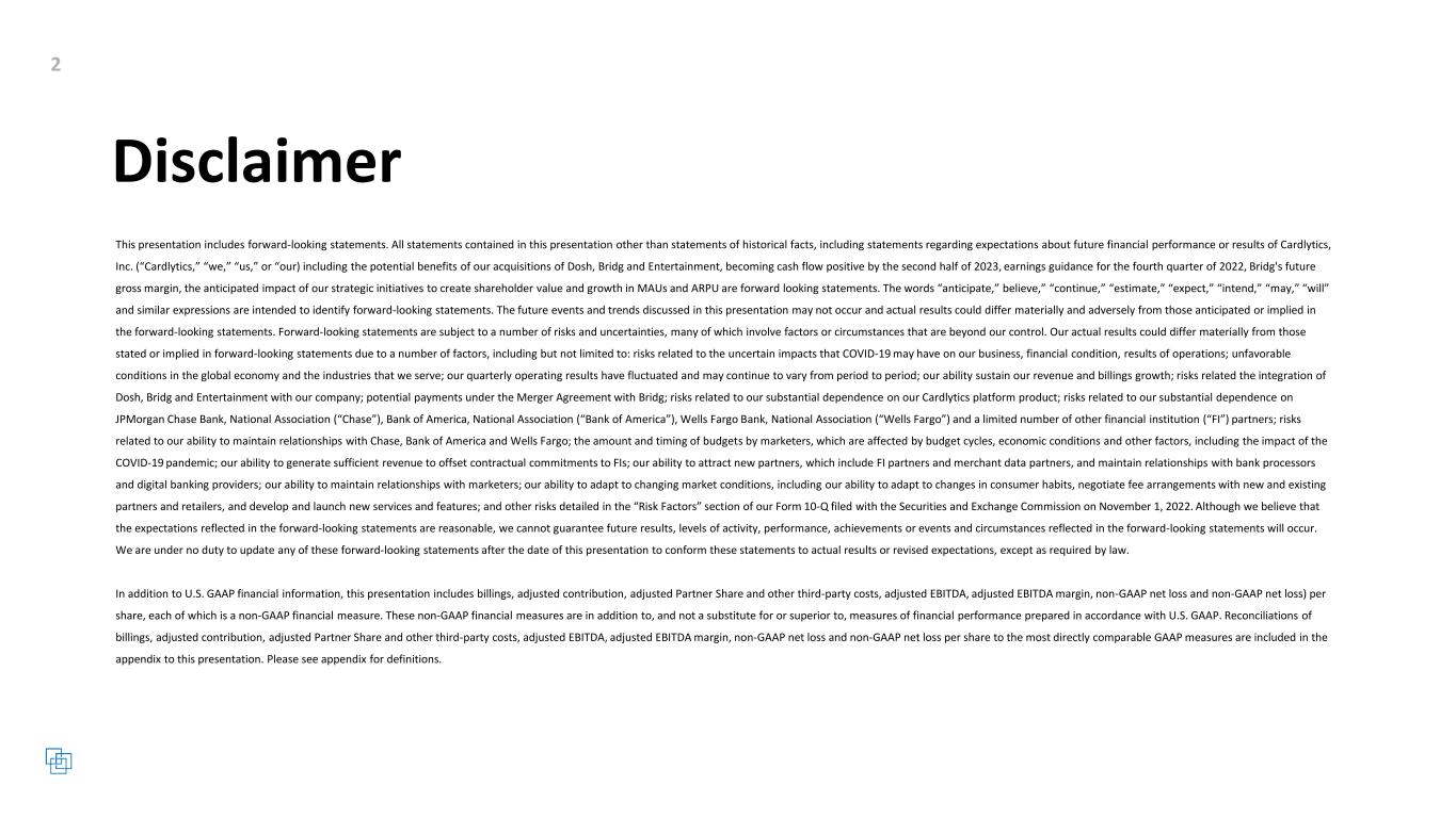 当社の実際の業績は、以下を含むがこれに限定されない様々な要因により、将来予想に関する記述で述べられまたは暗示されたものと大きく異なる可能性があります。COVID-19が当社の事業、財務状況および業績に与える不確実な影響に関するリスク、世界経済および当社がサービスを提供する業界の好ましくない状況、当社の四半期業績は変動しており、今後も変動する可能性がある、当社の収益の伸びおよび請求額を維持する能力、Dosh、Bridgおよびエンターテインメントと当社の統合に関するリスク、Bridgとの合併契約に基づく支払の可能性、COVID-19が当社に与える可能性のある影響に関するリスク、COVID-19が当社に与える可能性のある影響に関するリスク、当社が提供するCardlyticsプラットフォームに対する依存度の高さに関するリスク、Bridgと当社の合併契約に基づき当社が受ける可能性のある支払、当社が提供するサービスの質に関するリスク、当社が提供するサービスの質に関するリスク、当社が提供するサービスの質が当社に与えるリスクCardlyticsプラットフォームへの実質的な依存に関するリスク、JPMorgan Chase Bank, National Association(以下「Chase」)、Bank of America, National Association(以下「Bank of America」)、Wells Fargo Bank, National Association(以下「Wells Fargo」)とその他限られた金融機関(「FI」)のパートナーへの実質的依存に関するリスク、Chase、Wells Fargo、Bank of Americaとの関係維持能力に関するリスク。予算サイクル、経済状況及びCOVID-19の大流行の影響を含むその他の要因によって影響を受けるマーケティング担当者による予算の額及び時期、金融機関との契約上のコミットメントを相殺するのに十分な収益を上げる当社の能力、金融機関パートナーを含む新規パートナーを獲得し、銀行プロセッサー及びデジタルバンキングプロバイダとの関係を維持する当社の能力、マーケティング担当者との関係を維持する当社の能力、マーケティング担当者との関係を維持する当社の能力。消費者習慣の変化への適応、新規および既存のパートナーや小売業者との手数料交渉、新しいサービスや機能の開発および立ち上げなどの市場環境の変化に適応する当社の能力、ならびに2022年11月1日に証券取引委員会に提出された当社のフォーム10-Qおよびその後の定期報告書の「リスク要因」セクションに詳細に記載されたその他のリスク。過去の業績は必ずしも将来の業績を示唆するものではありません。