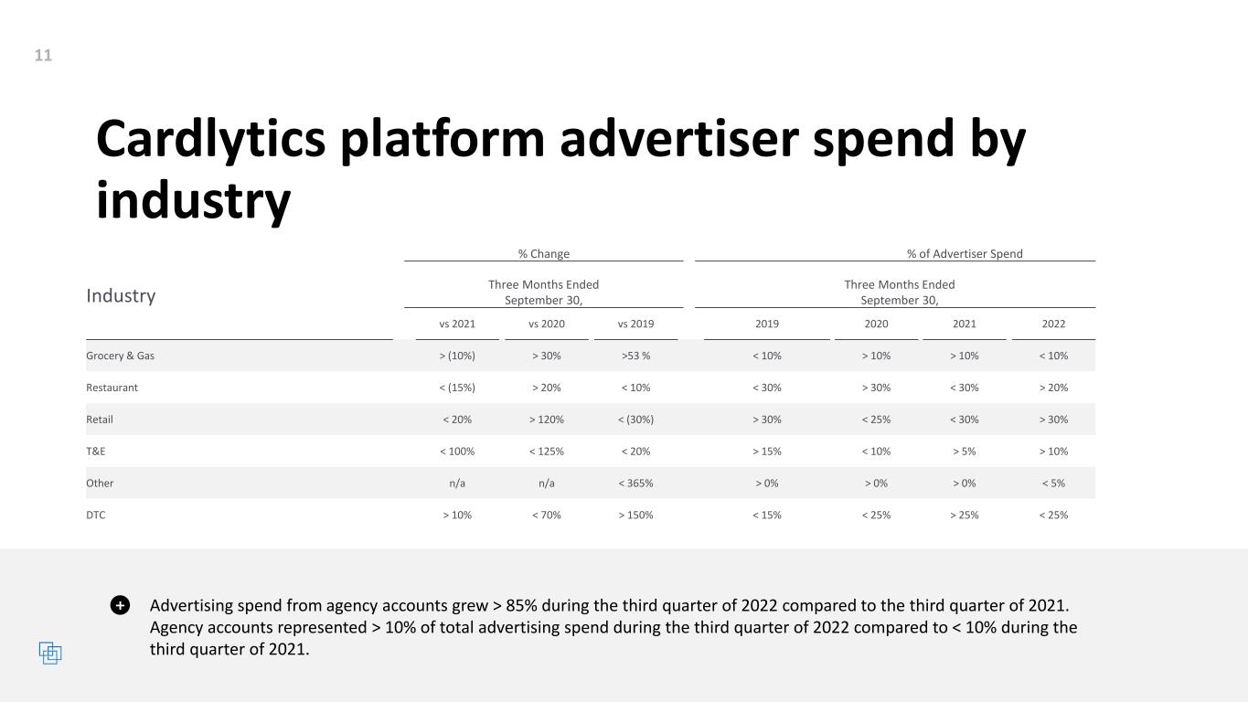 ジョージア州アトランタ - 2022年11月1日 - デジタル広告プラットフォームのCardlytics, Inc. (NASDAQ: CDLX) は本日、2022年9月30日に終了した第3四半期の決算を発表しました。補足情報は、Cardlyticsのウェブサイトの投資家向けセクション(http://ir.cardlytics.com/)に掲載されています。