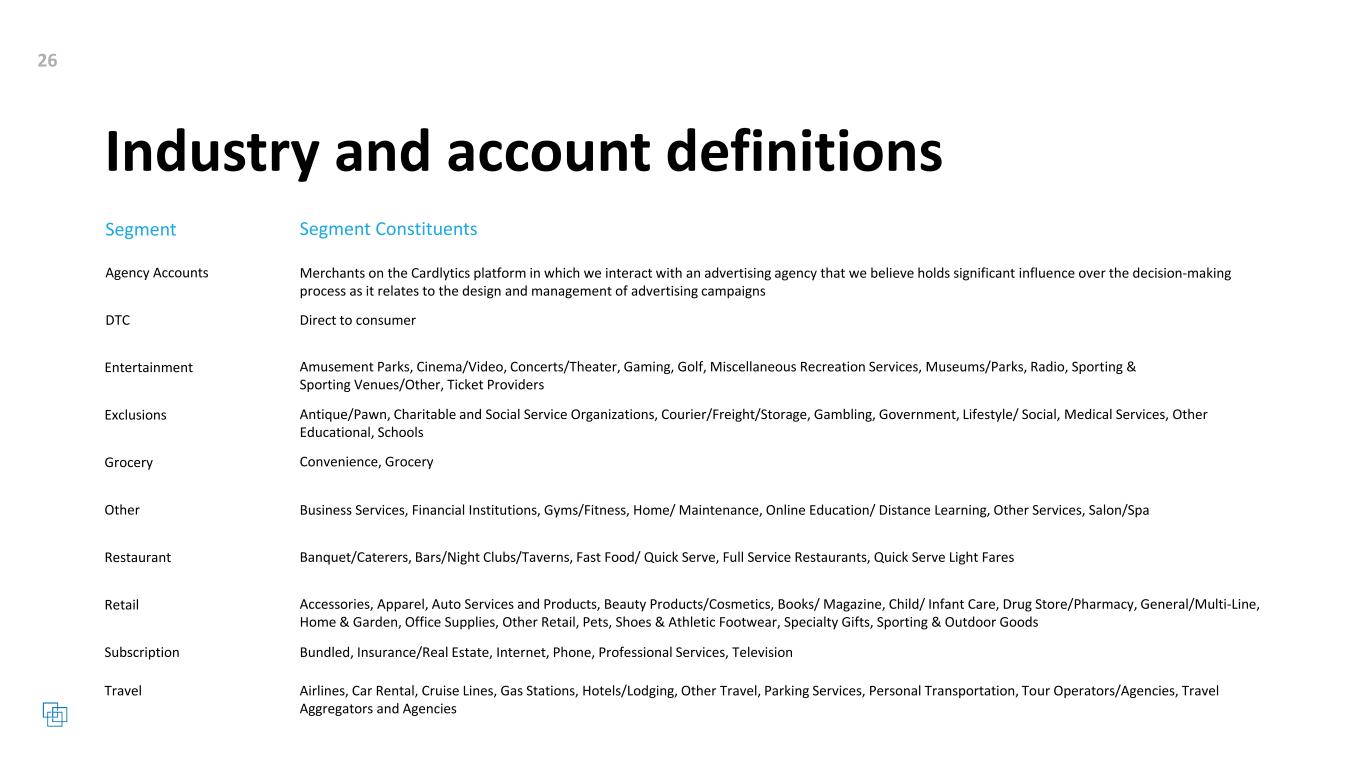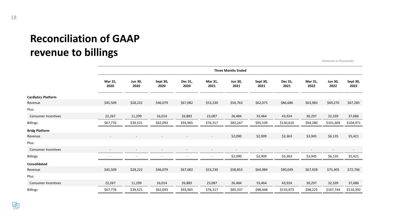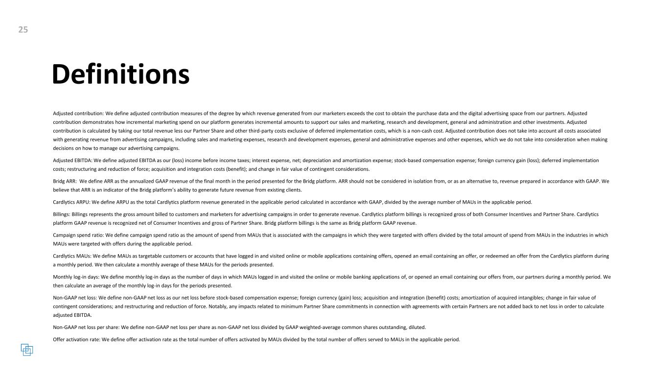 MAUは、月間の期間中にCardlyticsのプラットフォームからログインしてオファーを含むオンラインまたはモバイルアプリケーションを訪問した、オファーを含む電子メールを開いた、またはオファーを利用したターゲットとなる顧客またはアカウントと定義しています。そして、これらのMAUの提示期間の月平均を計算します。当社は、GAAPに従って計算された該当期間の総収入を該当期間の平均MAU数で割ったものをARPUと定義しています。ARRは、ブリッドプラットフォームの表示期間の最終月のGAAPベースの売上を年率換算したものと定義しています。ARRは、GAAPに準拠して作成された収益と切り離して考えるべきではありませんし、GAAPに準拠して作成された収益の代わりとなるものでもありません。ARRは、Bridgプラットフォームが既存の顧客から将来の収益を生み出す能力を示す指標であると考えています。