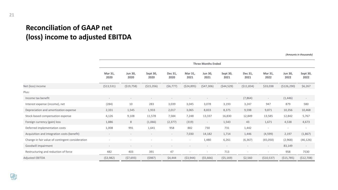 -非GAAP指標である調整後EBITDAは、2021年第3四半期の(520万ドル)の損失に対し、(1270万ドル)の損失となりました。