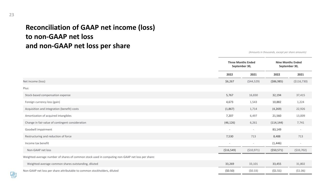 -2021年第3四半期の3330万株の完全希薄化加重平均普通株式に基づく非GAAPベースの純損失(1100万ドル)、希薄化後1株当たり(0.33ドル)に対し、1650万ドルの純利益を達成しました。