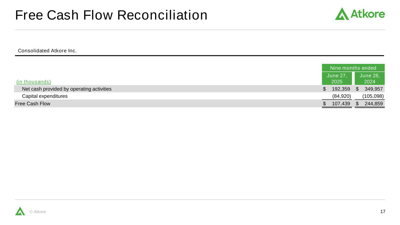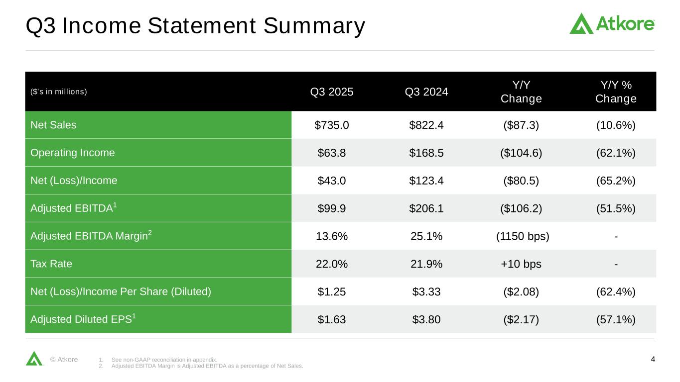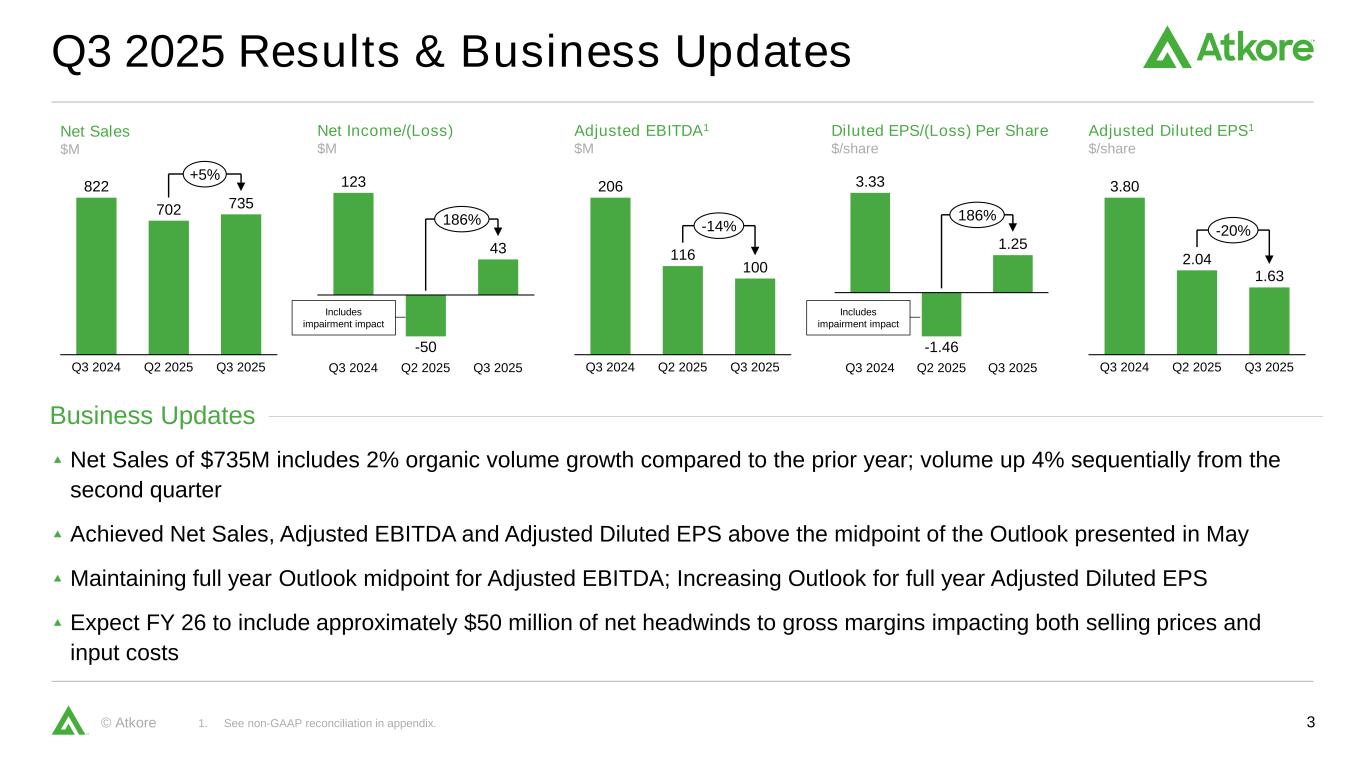 イリノイ州ハーベイ- 2025年8月5日(BUSINESS WIRE)-アトコア・インク(以下「当社」または「アトコア」)(NYSE: ATKR)は、2025年6月27日を期末とする2025年度第3四半期の業績を発表しました。