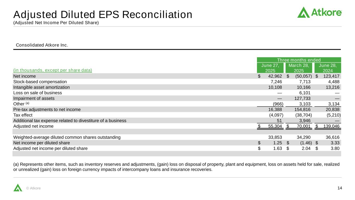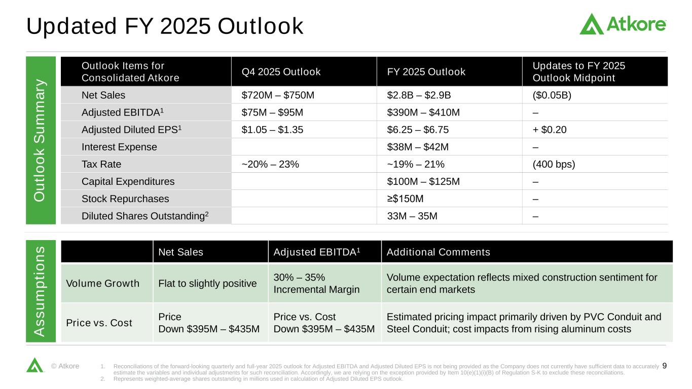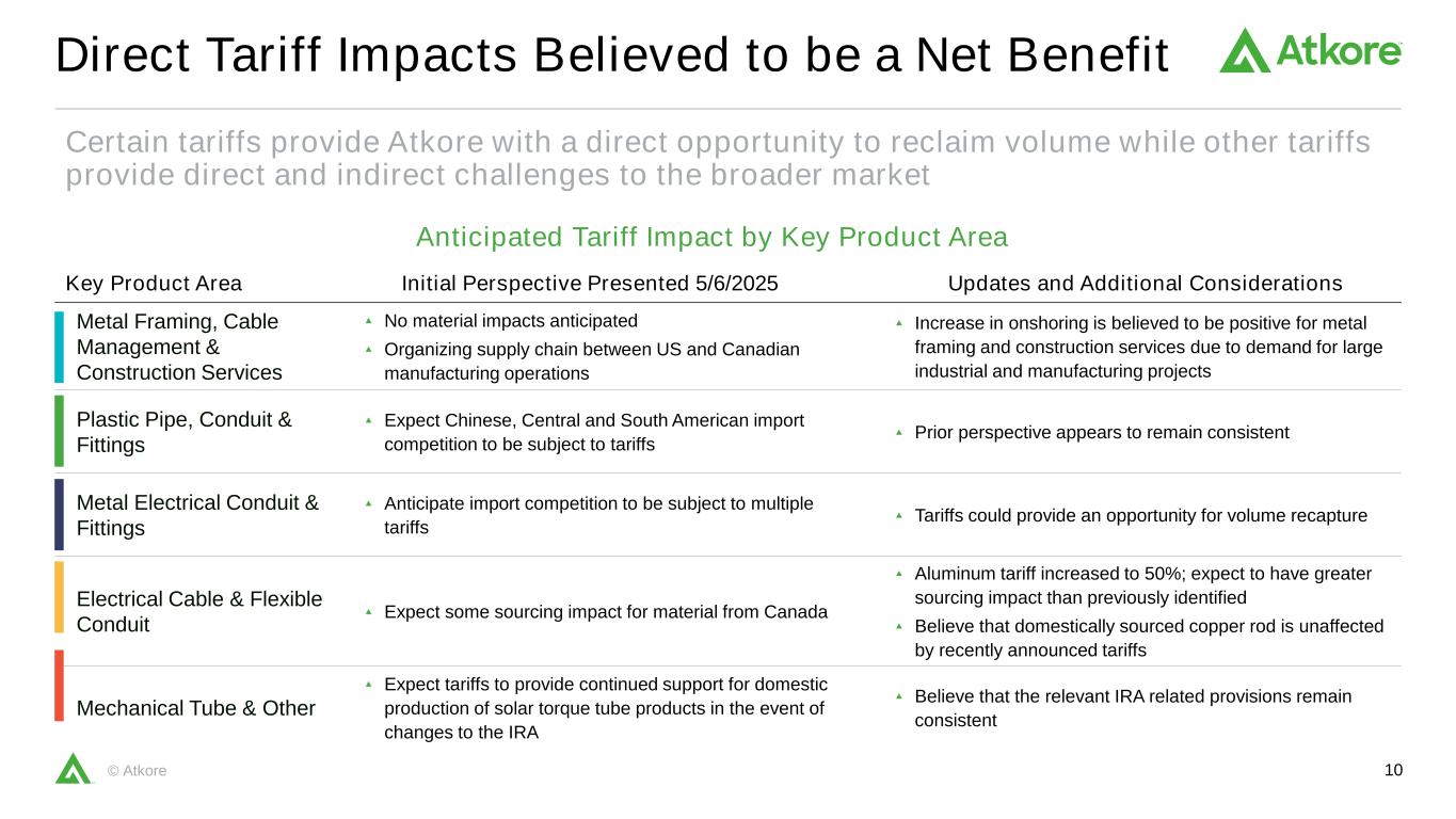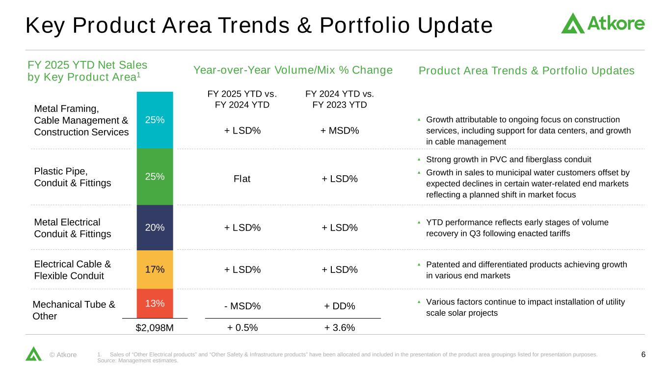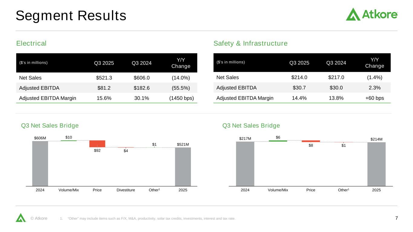 「Atkoreの社長兼最高経営責任者(CEO)であるビル・ウォルツは、「Atkoreは今期も好調な業績を達成し、売上高、調整後EBITDA、調整後EPSを5月の決算発表時に提示した範囲の上限に達しました。「既存事業売上高は前年同期比2%増となり、生産性の改善も順調に進みました。