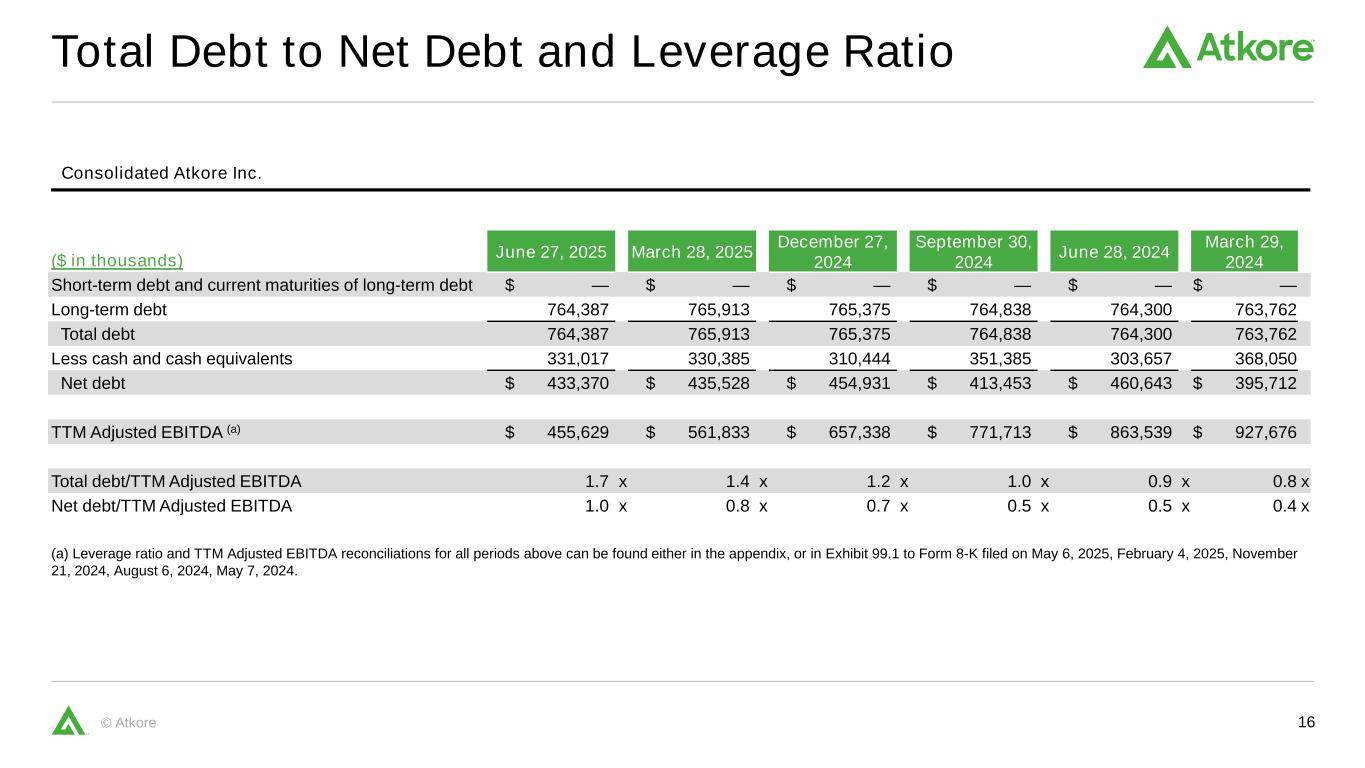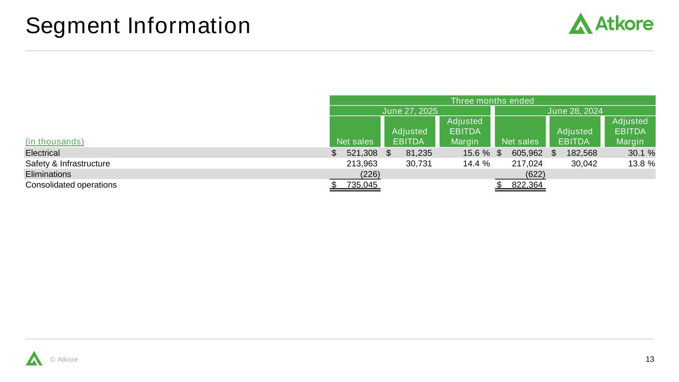 調整後EBITDAは、2024年6月28日に終了した3ヵ月間の3,000万ドルに対し、2025年6月27日に終了した3ヵ月間は0.7百万ドル(2.3%)増加し、3,070万ドルとなった。調整後EBITDAマージンは2024年6月28日に終了した3ヶ月間の13.8%に対し、2025年6月27日に終了した3ヶ月間は14.4%に増加した。調整後EBITDAおよび調整後EBITDAマージンの増加は、主に北米における建設事業、ケーブルマネジメントおよび金属フレーム製品に関連した増加によるものです。