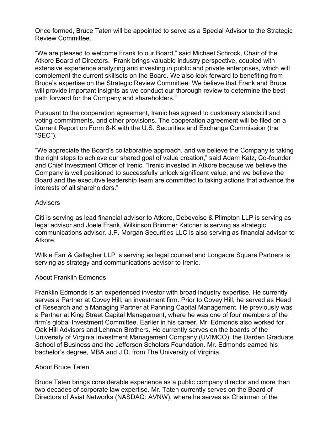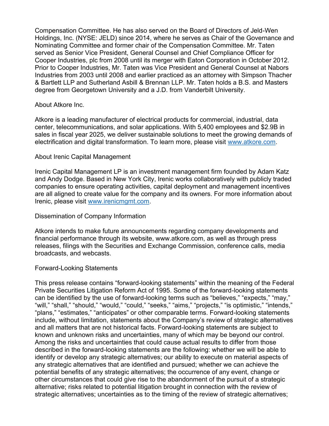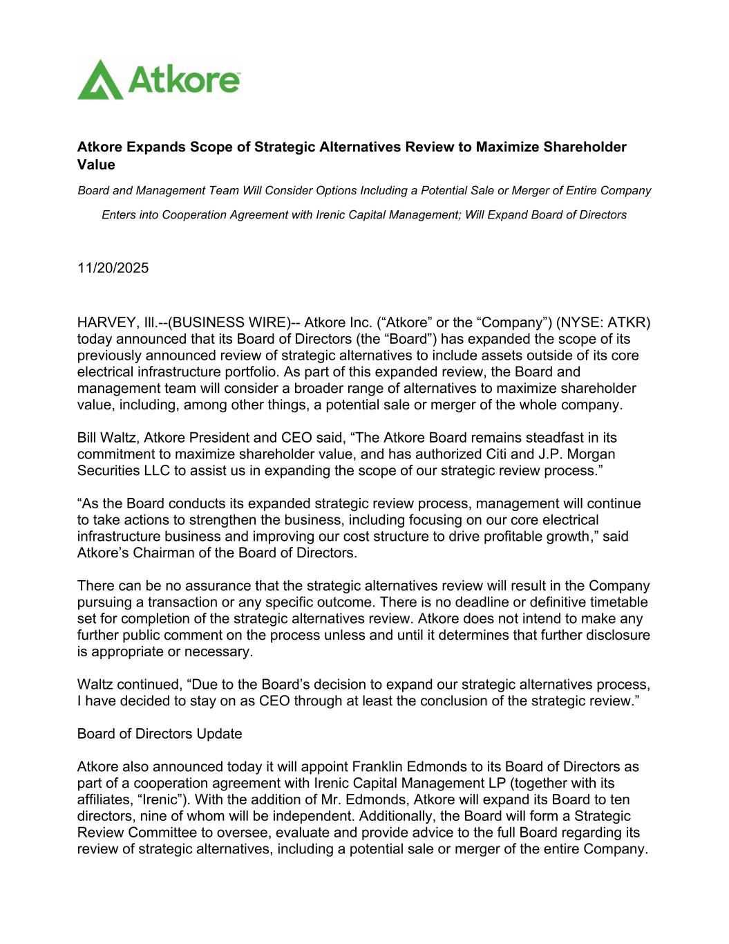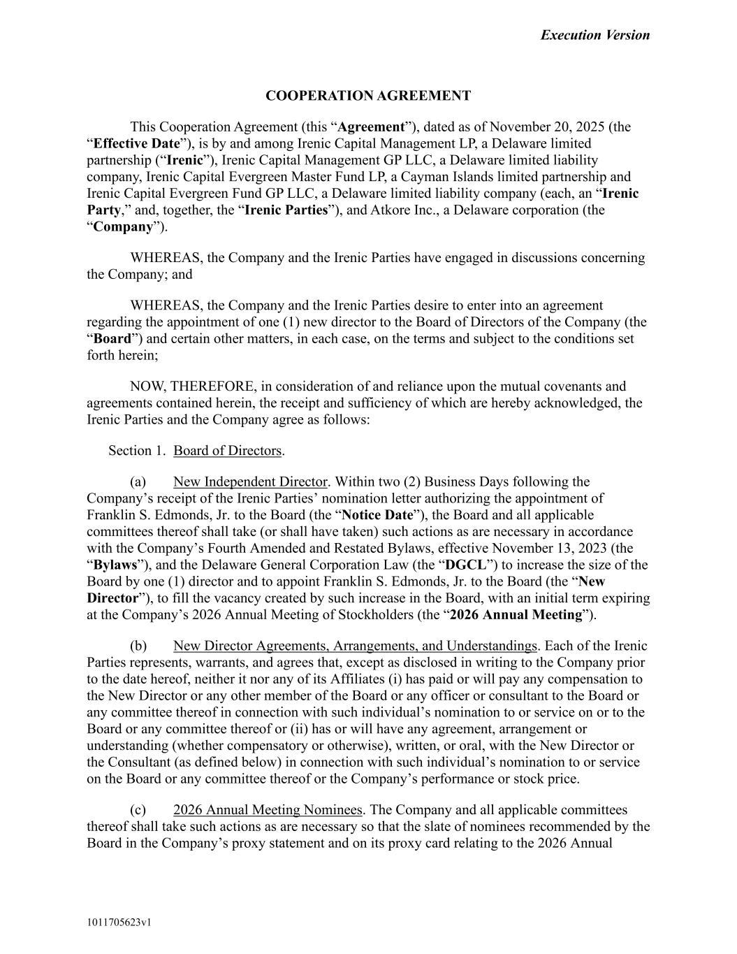 Execution Version 1011705623v1 COOPERATION AGREEMENT This Cooperation Agreement (this “Agreement”), dated as of November 20, 2025 (the “Effective Date”), is by and among Irenic Capital Management LP, a Delaware limited partnership (“Irenic”), Irenic Capital Management GP LLC, a Delaware limited liability company, Irenic Capital Evergreen Master Fund LP, a Cayman Islands limited partnership and Irenic Capital Evergreen Fund GP LLC, a Delaware limited liability company (each, an “Irenic Party,” and, together, the “Irenic Parties”), and Atkore Inc., a Delaware corporation (the “Company”). WHEREAS, the Company and the Irenic Parties have engaged in discussions concerning the Company; and WHEREAS, the Company and the Irenic Parties desire to enter into an agreement regarding the appointment of one (1) new director to the Board of Directors of the Company (the “Board”) and certain other matters, in each case, on the terms and subject to the conditions set forth herein; NOW, THEREFORE, in consideration of and reliance upon the mutual covenants and agreements contained herein, the receipt and sufficiency of which are hereby acknowledged, the Irenic Parties and the Company agree as follows: Section 1. Board of Directors. (a) New Independent Director. Within two (2) Business Days following the Company’s receipt of the Irenic Parties’ nomination letter authorizing the appointment of Franklin S. Edmonds, Jr. to the Board (the “Notice Date”), the Board and all applicable committees thereof shall take (or shall have taken) such actions as are necessary in accordance with the Company’s Fourth Amended and Restated Bylaws, effective November 13, 2023 (the “Bylaws”), and the Delaware General Corporation Law (the “DGCL”) to increase the size of the Board by one (1) director and to appoint Franklin S. Edmonds, Jr. to the Board (the “New Director”), to fill the vacancy created by such increase in the Board, with an initial term expiring at the Company’s 2026 Annual Meeting of Stockholders (the “2026 Annual Meeting”). (b) New Director Agreements, Arrangements, and Understandings. Each of the Irenic Parties represents, warrants, and agrees that, except as disclosed in writing to the Company prior to the date hereof, neither it nor any of its Affiliates (i) has paid or will pay any compensation to the New Director or any other member of the Board or any officer or consultant to the Board or any committee thereof in connection with such individual’s nomination to or service on or to the Board or any committee thereof or (ii) has or will have any agreement, arrangement or understanding (whether compensatory or otherwise), written, or oral, with the New Director or the Consultant (as defined below) in connection with such individual’s nomination to or service on the Board or any committee thereof or the Company’s performance or stock price. (c) 2026 Annual Meeting Nominees. The Company and all applicable committees thereof shall take such actions as are necessary so that the slate of nominees recommended by the Board in the Company’s proxy statement and on its proxy card relating to the 2026 Annual
