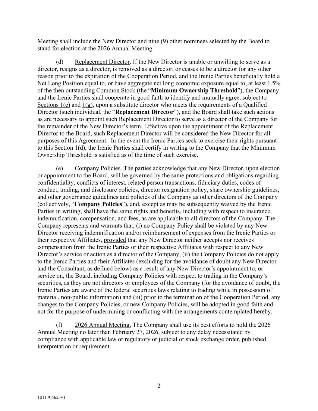 2 1011705623v1 Meeting shall include the New Director and nine (9) other nominees selected by the Board to stand for election at the 2026 Annual Meeting. (d) Replacement Director. If the New Director is unable or unwilling to serve as a director, resigns as a director, is removed as a director, or ceases to be a director for any other reason prior to the expiration of the Cooperation Period, and the Irenic Parties beneficially hold a Net Long Position equal to, or have aggregate net long economic exposure equal to, at least 1.5% of the then outstanding Common Stock (the “Minimum Ownership Threshold”), the Company and the Irenic Parties shall cooperate in good faith to identify and mutually agree, subject to Sections 1(e) and 1(g), upon a substitute director who meets the requirements of a Qualified Director (such individual, the “Replacement Director”), and the Board shall take such actions as are necessary to appoint such Replacement Director to serve as a director of the Company for the remainder of the New Director’s term. Effective upon the appointment of the Replacement Director to the Board, such Replacement Director will be considered the New Director for all purposes of this Agreement. In the event the Irenic Parties seek to exercise their rights pursuant to this Section 1(d), the Irenic Parties shall certify in writing to the Company that the Minimum Ownership Threshold is satisfied as of the time of such exercise. (e) Company Policies. The parties acknowledge that any New Director, upon election or appointment to the Board, will be governed by the same protections and obligations regarding confidentiality, conflicts of interest, related person transactions, fiduciary duties, codes of conduct, trading, and disclosure policies, director resignation policy, share ownership guidelines, and other governance guidelines and policies of the Company as other directors of the Company (collectively, “Company Policies”), and, except as may be subsequently waived by the Irenic Parties in writing, shall have the same rights and benefits, including with respect to insurance, indemnification, compensation, and fees, as are applicable to all directors of the Company. The Company represents and warrants that, (i) no Company Policy shall be violated by any New Director receiving indemnification and/or reimbursement of expenses from the Irenic Parties or their respective Affiliates, provided that any New Director neither accepts nor receives compensation from the Irenic Parties or their respective Affiliates with respect to any New Director’s service or action as a director of the Company, (ii) the Company Policies do not apply to the Irenic Parties and their Affiliates (excluding for the avoidance of doubt any New Director and the Consultant, as defined below) as a result of any New Director’s appointment to, or service on, the Board, including Company Policies with respect to trading in the Company’s securities, as they are not directors or employees of the Company (for the avoidance of doubt, the Irenic Parties are aware of the federal securities laws relating to trading while in possession of material, non-public information) and (iii) prior to the termination of the Cooperation Period, any changes to the Company Policies, or new Company Policies, will be adopted in good faith and not for the purpose of undermining or conflicting with the arrangements contemplated hereby. (f) 2026 Annual Meeting. The Company shall use its best efforts to hold the 2026 Annual Meeting no later than February 27, 2026, subject to any delay necessitated by compliance with applicable law or regulatory or judicial or stock exchange order, published interpretation or requirement.