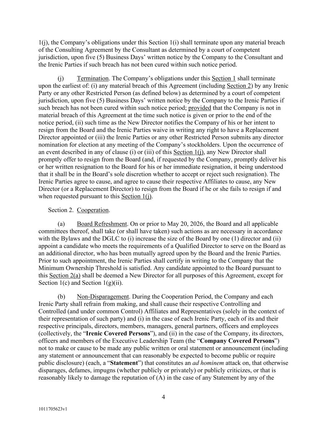 4 1011705623v1 1(j), the Company’s obligations under this Section 1(i) shall terminate upon any material breach of the Consulting Agreement by the Consultant as determined by a court of competent jurisdiction, upon five (5) Business Days’ written notice by the Company to the Consultant and the Irenic Parties if such breach has not been cured within such notice period. (j) Termination. The Company’s obligations under this Section 1 shall terminate upon the earliest of: (i) any material breach of this Agreement (including Section 2) by any Irenic Party or any other Restricted Person (as defined below) as determined by a court of competent jurisdiction, upon five (5) Business Days’ written notice by the Company to the Irenic Parties if such breach has not been cured within such notice period; provided that the Company is not in material breach of this Agreement at the time such notice is given or prior to the end of the notice period, (ii) such time as the New Director notifies the Company of his or her intent to resign from the Board and the Irenic Parties waive in writing any right to have a Replacement Director appointed or (iii) the Irenic Parties or any other Restricted Person submits any director nomination for election at any meeting of the Company’s stockholders. Upon the occurrence of an event described in any of clause (i) or (iii) of this Section 1(j), any New Director shall promptly offer to resign from the Board (and, if requested by the Company, promptly deliver his or her written resignation to the Board for his or her immediate resignation, it being understood that it shall be in the Board’s sole discretion whether to accept or reject such resignation). The Irenic Parties agree to cause, and agree to cause their respective Affiliates to cause, any New Director (or a Replacement Director) to resign from the Board if he or she fails to resign if and when requested pursuant to this Section 1(j). Section 2. Cooperation. (a) Board Refreshment. On or prior to May 20, 2026, the Board and all applicable committees thereof, shall take (or shall have taken) such actions as are necessary in accordance with the Bylaws and the DGLC to (i) increase the size of the Board by one (1) director and (ii) appoint a candidate who meets the requirements of a Qualified Director to serve on the Board as an additional director, who has been mutually agreed upon by the Board and the Irenic Parties. Prior to such appointment, the Irenic Parties shall certify in writing to the Company that the Minimum Ownership Threshold is satisfied. Any candidate appointed to the Board pursuant to this Section 2(a) shall be deemed a New Director for all purposes of this Agreement, except for Section 1(c) and Section 1(g)(ii). (b) Non-Disparagement. During the Cooperation Period, the Company and each Irenic Party shall refrain from making, and shall cause their respective Controlling and Controlled (and under common Control) Affiliates and Representatives (solely in the context of their representation of such party) and (i) in the case of each Irenic Party, each of its and their respective principals, directors, members, managers, general partners, officers and employees (collectively, the “Irenic Covered Persons”), and (ii) in the case of the Company, its directors, officers and members of the Executive Leadership Team (the “Company Covered Persons”) not to make or cause to be made any public written or oral statement or announcement (including any statement or announcement that can reasonably be expected to become public or require public disclosure) (each, a “Statement”) that constitutes an ad hominem attack on, that otherwise disparages, defames, impugns (whether publicly or privately) or publicly criticizes, or that is reasonably likely to damage the reputation of (A) in the case of any Statement by any of the