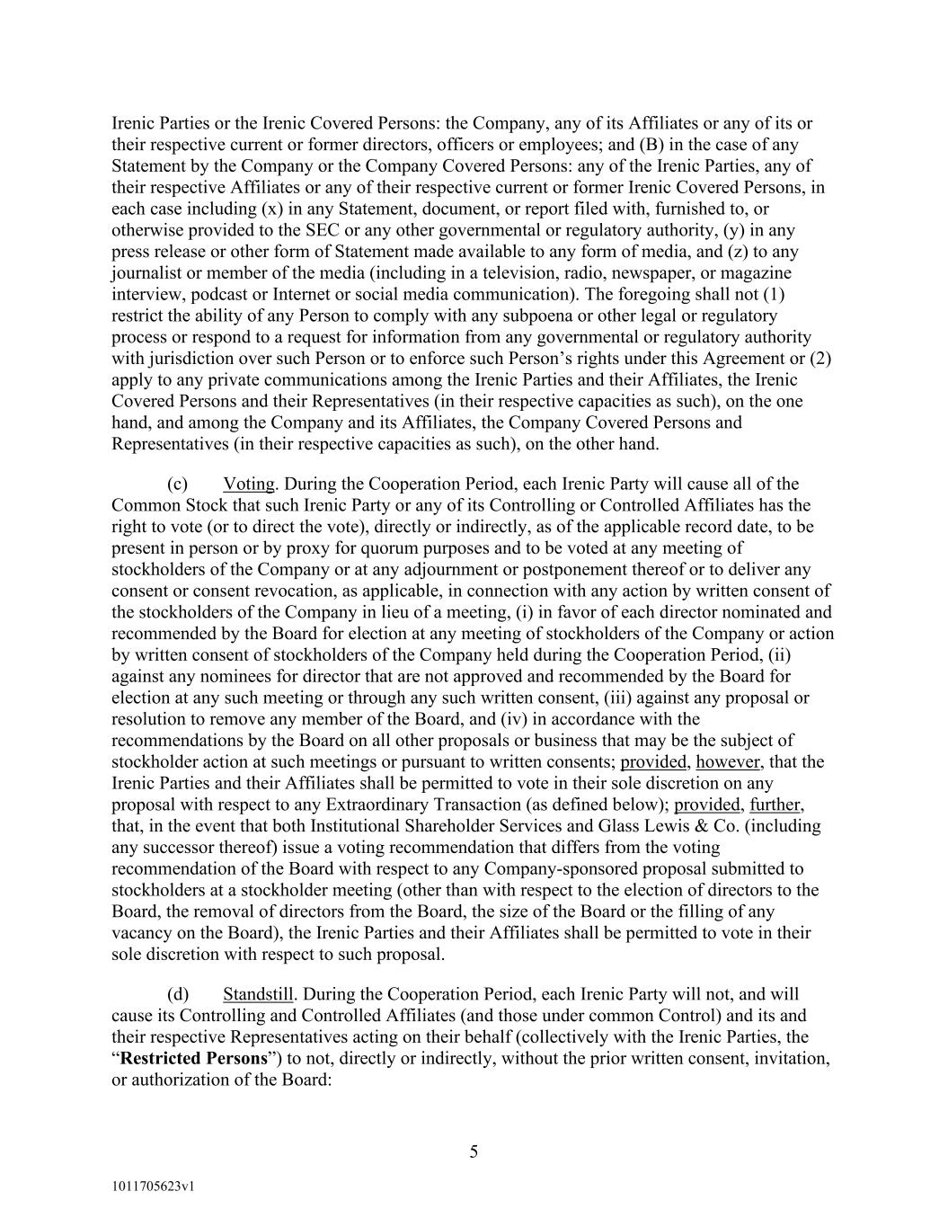 5 1011705623v1 Irenic Parties or the Irenic Covered Persons: the Company, any of its Affiliates or any of its or their respective current or former directors, officers or employees; and (B) in the case of any Statement by the Company or the Company Covered Persons: any of the Irenic Parties, any of their respective Affiliates or any of their respective current or former Irenic Covered Persons, in each case including (x) in any Statement, document, or report filed with, furnished to, or otherwise provided to the SEC or any other governmental or regulatory authority, (y) in any press release or other form of Statement made available to any form of media, and (z) to any journalist or member of the media (including in a television, radio, newspaper, or magazine interview, podcast or Internet or social media communication). The foregoing shall not (1) restrict the ability of any Person to comply with any subpoena or other legal or regulatory process or respond to a request for information from any governmental or regulatory authority with jurisdiction over such Person or to enforce such Person’s rights under this Agreement or (2) apply to any private communications among the Irenic Parties and their Affiliates, the Irenic Covered Persons and their Representatives (in their respective capacities as such), on the one hand, and among the Company and its Affiliates, the Company Covered Persons and Representatives (in their respective capacities as such), on the other hand. (c) Voting. During the Cooperation Period, each Irenic Party will cause all of the Common Stock that such Irenic Party or any of its Controlling or Controlled Affiliates has the right to vote (or to direct the vote), directly or indirectly, as of the applicable record date, to be present in person or by proxy for quorum purposes and to be voted at any meeting of stockholders of the Company or at any adjournment or postponement thereof or to deliver any consent or consent revocation, as applicable, in connection with any action by written consent of the stockholders of the Company in lieu of a meeting, (i) in favor of each director nominated and recommended by the Board for election at any meeting of stockholders of the Company or action by written consent of stockholders of the Company held during the Cooperation Period, (ii) against any nominees for director that are not approved and recommended by the Board for election at any such meeting or through any such written consent, (iii) against any proposal or resolution to remove any member of the Board, and (iv) in accordance with the recommendations by the Board on all other proposals or business that may be the subject of stockholder action at such meetings or pursuant to written consents; provided, however, that the Irenic Parties and their Affiliates shall be permitted to vote in their sole discretion on any proposal with respect to any Extraordinary Transaction (as defined below); provided, further, that, in the event that both Institutional Shareholder Services and Glass Lewis & Co. (including any successor thereof) issue a voting recommendation that differs from the voting recommendation of the Board with respect to any Company-sponsored proposal submitted to stockholders at a stockholder meeting (other than with respect to the election of directors to the Board, the removal of directors from the Board, the size of the Board or the filling of any vacancy on the Board), the Irenic Parties and their Affiliates shall be permitted to vote in their sole discretion with respect to such proposal. (d) Standstill. During the Cooperation Period, each Irenic Party will not, and will cause its Controlling and Controlled Affiliates (and those under common Control) and its and their respective Representatives acting on their behalf (collectively with the Irenic Parties, the “Restricted Persons”) to not, directly or indirectly, without the prior written consent, invitation, or authorization of the Board: