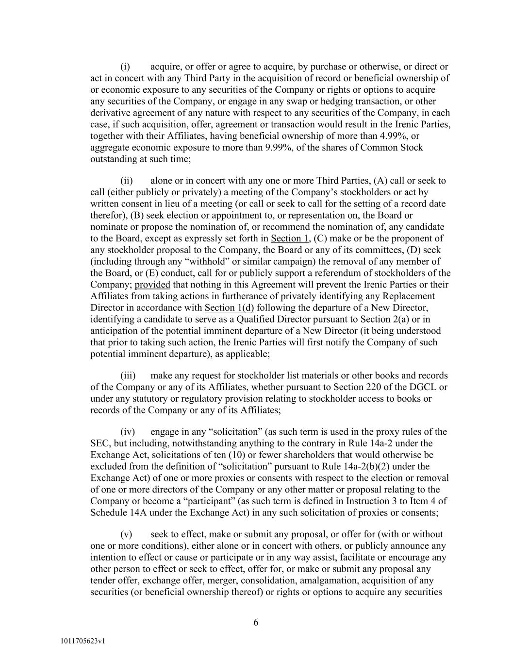 6 1011705623v1 (i) acquire, or offer or agree to acquire, by purchase or otherwise, or direct or act in concert with any Third Party in the acquisition of record or beneficial ownership of or economic exposure to any securities of the Company or rights or options to acquire any securities of the Company, or engage in any swap or hedging transaction, or other derivative agreement of any nature with respect to any securities of the Company, in each case, if such acquisition, offer, agreement or transaction would result in the Irenic Parties, together with their Affiliates, having beneficial ownership of more than 4.99%, or aggregate economic exposure to more than 9.99%, of the shares of Common Stock outstanding at such time; (ii) alone or in concert with any one or more Third Parties, (A) call or seek to call (either publicly or privately) a meeting of the Company’s stockholders or act by written consent in lieu of a meeting (or call or seek to call for the setting of a record date therefor), (B) seek election or appointment to, or representation on, the Board or nominate or propose the nomination of, or recommend the nomination of, any candidate to the Board, except as expressly set forth in Section 1, (C) make or be the proponent of any stockholder proposal to the Company, the Board or any of its committees, (D) seek (including through any “withhold” or similar campaign) the removal of any member of the Board, or (E) conduct, call for or publicly support a referendum of stockholders of the Company; provided that nothing in this Agreement will prevent the Irenic Parties or their Affiliates from taking actions in furtherance of privately identifying any Replacement Director in accordance with Section 1(d) following the departure of a New Director, identifying a candidate to serve as a Qualified Director pursuant to Section 2(a) or in anticipation of the potential imminent departure of a New Director (it being understood that prior to taking such action, the Irenic Parties will first notify the Company of such potential imminent departure), as applicable; (iii) make any request for stockholder list materials or other books and records of the Company or any of its Affiliates, whether pursuant to Section 220 of the DGCL or under any statutory or regulatory provision relating to stockholder access to books or records of the Company or any of its Affiliates; (iv) engage in any “solicitation” (as such term is used in the proxy rules of the SEC, but including, notwithstanding anything to the contrary in Rule 14a-2 under the Exchange Act, solicitations of ten (10) or fewer shareholders that would otherwise be excluded from the definition of “solicitation” pursuant to Rule 14a-2(b)(2) under the Exchange Act) of one or more proxies or consents with respect to the election or removal of one or more directors of the Company or any other matter or proposal relating to the Company or become a “participant” (as such term is defined in Instruction 3 to Item 4 of Schedule 14A under the Exchange Act) in any such solicitation of proxies or consents; (v) seek to effect, make or submit any proposal, or offer for (with or without one or more conditions), either alone or in concert with others, or publicly announce any intention to effect or cause or participate or in any way assist, facilitate or encourage any other person to effect or seek to effect, offer for, or make or submit any proposal any tender offer, exchange offer, merger, consolidation, amalgamation, acquisition of any securities (or beneficial ownership thereof) or rights or options to acquire any securities