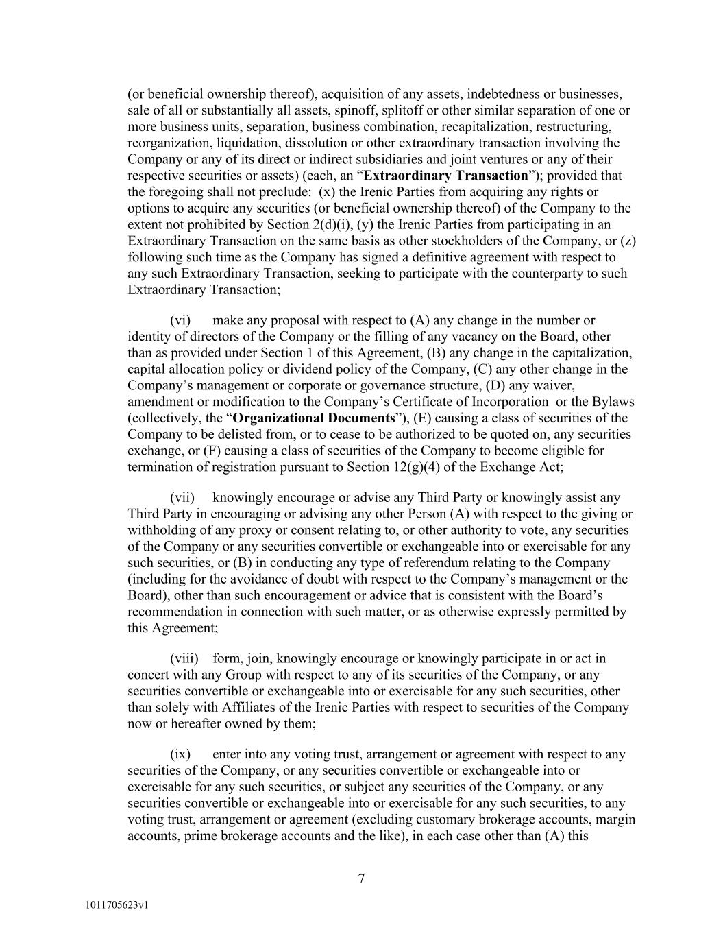 7 1011705623v1 (or beneficial ownership thereof), acquisition of any assets, indebtedness or businesses, sale of all or substantially all assets, spinoff, splitoff or other similar separation of one or more business units, separation, business combination, recapitalization, restructuring, reorganization, liquidation, dissolution or other extraordinary transaction involving the Company or any of its direct or indirect subsidiaries and joint ventures or any of their respective securities or assets) (each, an “Extraordinary Transaction”); provided that the foregoing shall not preclude: (x) the Irenic Parties from acquiring any rights or options to acquire any securities (or beneficial ownership thereof) of the Company to the extent not prohibited by Section 2(d)(i), (y) the Irenic Parties from participating in an Extraordinary Transaction on the same basis as other stockholders of the Company, or (z) following such time as the Company has signed a definitive agreement with respect to any such Extraordinary Transaction, seeking to participate with the counterparty to such Extraordinary Transaction; (vi) make any proposal with respect to (A) any change in the number or identity of directors of the Company or the filling of any vacancy on the Board, other than as provided under Section 1 of this Agreement, (B) any change in the capitalization, capital allocation policy or dividend policy of the Company, (C) any other change in the Company’s management or corporate or governance structure, (D) any waiver, amendment or modification to the Company’s Certificate of Incorporation or the Bylaws (collectively, the “Organizational Documents”), (E) causing a class of securities of the Company to be delisted from, or to cease to be authorized to be quoted on, any securities exchange, or (F) causing a class of securities of the Company to become eligible for termination of registration pursuant to Section 12(g)(4) of the Exchange Act; (vii) knowingly encourage or advise any Third Party or knowingly assist any Third Party in encouraging or advising any other Person (A) with respect to the giving or withholding of any proxy or consent relating to, or other authority to vote, any securities of the Company or any securities convertible or exchangeable into or exercisable for any such securities, or (B) in conducting any type of referendum relating to the Company (including for the avoidance of doubt with respect to the Company’s management or the Board), other than such encouragement or advice that is consistent with the Board’s recommendation in connection with such matter, or as otherwise expressly permitted by this Agreement; (viii) form, join, knowingly encourage or knowingly participate in or act in concert with any Group with respect to any of its securities of the Company, or any securities convertible or exchangeable into or exercisable for any such securities, other than solely with Affiliates of the Irenic Parties with respect to securities of the Company now or hereafter owned by them; (ix) enter into any voting trust, arrangement or agreement with respect to any securities of the Company, or any securities convertible or exchangeable into or exercisable for any such securities, or subject any securities of the Company, or any securities convertible or exchangeable into or exercisable for any such securities, to any voting trust, arrangement or agreement (excluding customary brokerage accounts, margin accounts, prime brokerage accounts and the like), in each case other than (A) this