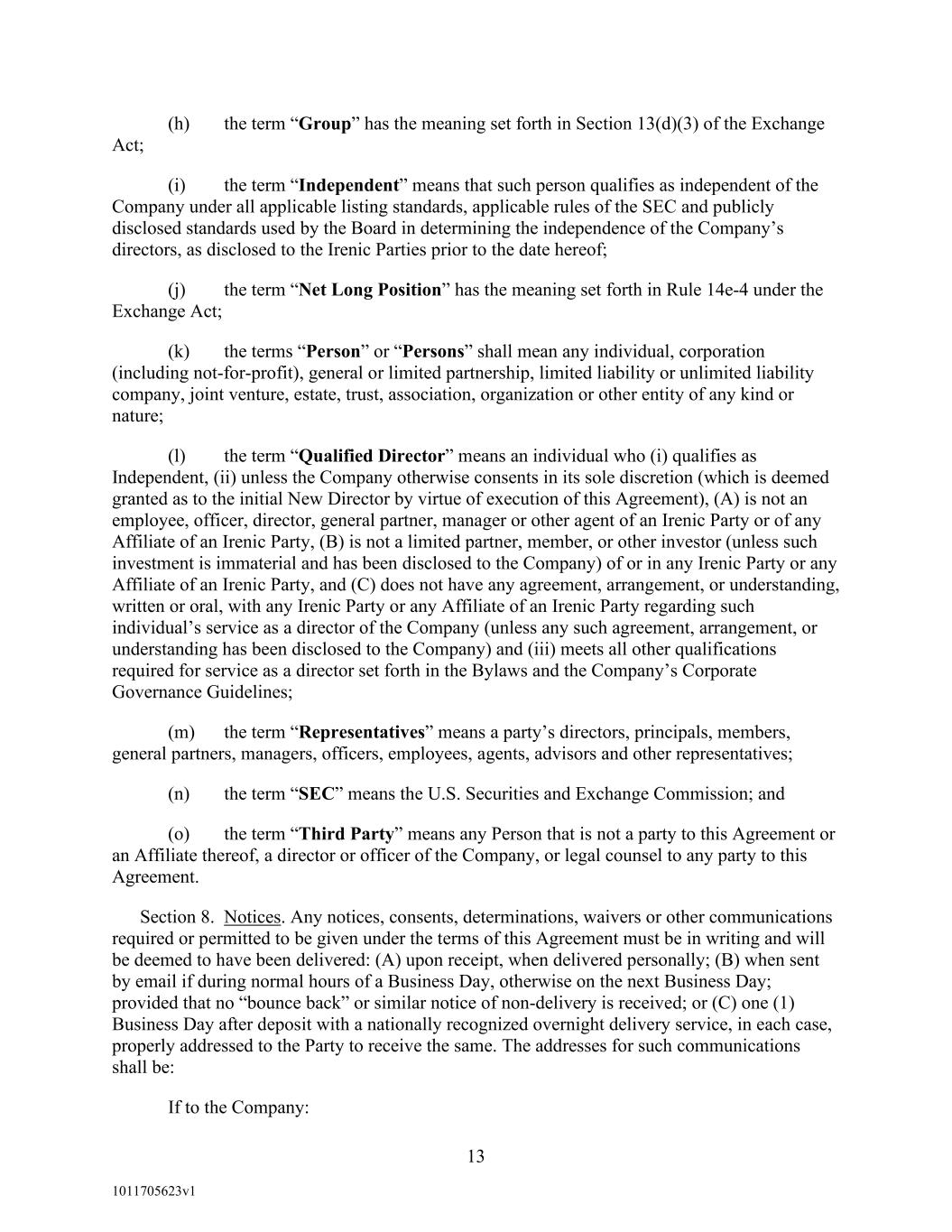 13 1011705623v1 (h) the term “Group” has the meaning set forth in Section 13(d)(3) of the Exchange Act; (i) the term “Independent” means that such person qualifies as independent of the Company under all applicable listing standards, applicable rules of the SEC and publicly disclosed standards used by the Board in determining the independence of the Company’s directors, as disclosed to the Irenic Parties prior to the date hereof; (j) the term “Net Long Position” has the meaning set forth in Rule 14e-4 under the Exchange Act; (k) the terms “Person” or “Persons” shall mean any individual, corporation (including not-for-profit), general or limited partnership, limited liability or unlimited liability company, joint venture, estate, trust, association, organization or other entity of any kind or nature; (l) the term “Qualified Director” means an individual who (i) qualifies as Independent, (ii) unless the Company otherwise consents in its sole discretion (which is deemed granted as to the initial New Director by virtue of execution of this Agreement), (A) is not an employee, officer, director, general partner, manager or other agent of an Irenic Party or of any Affiliate of an Irenic Party, (B) is not a limited partner, member, or other investor (unless such investment is immaterial and has been disclosed to the Company) of or in any Irenic Party or any Affiliate of an Irenic Party, and (C) does not have any agreement, arrangement, or understanding, written or oral, with any Irenic Party or any Affiliate of an Irenic Party regarding such individual’s service as a director of the Company (unless any such agreement, arrangement, or understanding has been disclosed to the Company) and (iii) meets all other qualifications required for service as a director set forth in the Bylaws and the Company’s Corporate Governance Guidelines; (m) the term “Representatives” means a party’s directors, principals, members, general partners, managers, officers, employees, agents, advisors and other representatives; (n) the term “SEC” means the U.S. Securities and Exchange Commission; and (o) the term “Third Party” means any Person that is not a party to this Agreement or an Affiliate thereof, a director or officer of the Company, or legal counsel to any party to this Agreement. Section 8. Notices. Any notices, consents, determinations, waivers or other communications required or permitted to be given under the terms of this Agreement must be in writing and will be deemed to have been delivered: (A) upon receipt, when delivered personally; (B) when sent by email if during normal hours of a Business Day, otherwise on the next Business Day; provided that no “bounce back” or similar notice of non-delivery is received; or (C) one (1) Business Day after deposit with a nationally recognized overnight delivery service, in each case, properly addressed to the Party to receive the same. The addresses for such communications shall be: If to the Company: