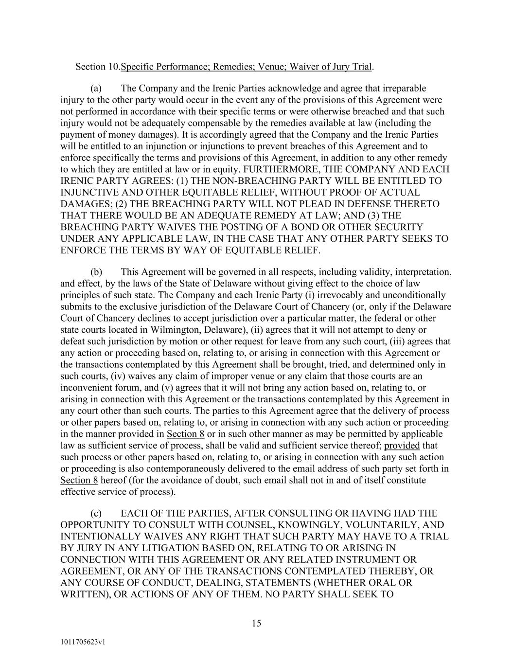 15 1011705623v1 Section 10.Specific Performance; Remedies; Venue; Waiver of Jury Trial. (a) The Company and the Irenic Parties acknowledge and agree that irreparable injury to the other party would occur in the event any of the provisions of this Agreement were not performed in accordance with their specific terms or were otherwise breached and that such injury would not be adequately compensable by the remedies available at law (including the payment of money damages). It is accordingly agreed that the Company and the Irenic Parties will be entitled to an injunction or injunctions to prevent breaches of this Agreement and to enforce specifically the terms and provisions of this Agreement, in addition to any other remedy to which they are entitled at law or in equity. FURTHERMORE, THE COMPANY AND EACH IRENIC PARTY AGREES: (1) THE NON-BREACHING PARTY WILL BE ENTITLED TO INJUNCTIVE AND OTHER EQUITABLE RELIEF, WITHOUT PROOF OF ACTUAL DAMAGES; (2) THE BREACHING PARTY WILL NOT PLEAD IN DEFENSE THERETO THAT THERE WOULD BE AN ADEQUATE REMEDY AT LAW; AND (3) THE BREACHING PARTY WAIVES THE POSTING OF A BOND OR OTHER SECURITY UNDER ANY APPLICABLE LAW, IN THE CASE THAT ANY OTHER PARTY SEEKS TO ENFORCE THE TERMS BY WAY OF EQUITABLE RELIEF. (b) This Agreement will be governed in all respects, including validity, interpretation, and effect, by the laws of the State of Delaware without giving effect to the choice of law principles of such state. The Company and each Irenic Party (i) irrevocably and unconditionally submits to the exclusive jurisdiction of the Delaware Court of Chancery (or, only if the Delaware Court of Chancery declines to accept jurisdiction over a particular matter, the federal or other state courts located in Wilmington, Delaware), (ii) agrees that it will not attempt to deny or defeat such jurisdiction by motion or other request for leave from any such court, (iii) agrees that any action or proceeding based on, relating to, or arising in connection with this Agreement or the transactions contemplated by this Agreement shall be brought, tried, and determined only in such courts, (iv) waives any claim of improper venue or any claim that those courts are an inconvenient forum, and (v) agrees that it will not bring any action based on, relating to, or arising in connection with this Agreement or the transactions contemplated by this Agreement in any court other than such courts. The parties to this Agreement agree that the delivery of process or other papers based on, relating to, or arising in connection with any such action or proceeding in the manner provided in Section 8 or in such other manner as may be permitted by applicable law as sufficient service of process, shall be valid and sufficient service thereof; provided that such process or other papers based on, relating to, or arising in connection with any such action or proceeding is also contemporaneously delivered to the email address of such party set forth in Section 8 hereof (for the avoidance of doubt, such email shall not in and of itself constitute effective service of process). (c) EACH OF THE PARTIES, AFTER CONSULTING OR HAVING HAD THE OPPORTUNITY TO CONSULT WITH COUNSEL, KNOWINGLY, VOLUNTARILY, AND INTENTIONALLY WAIVES ANY RIGHT THAT SUCH PARTY MAY HAVE TO A TRIAL BY JURY IN ANY LITIGATION BASED ON, RELATING TO OR ARISING IN CONNECTION WITH THIS AGREEMENT OR ANY RELATED INSTRUMENT OR AGREEMENT, OR ANY OF THE TRANSACTIONS CONTEMPLATED THEREBY, OR ANY COURSE OF CONDUCT, DEALING, STATEMENTS (WHETHER ORAL OR WRITTEN), OR ACTIONS OF ANY OF THEM. NO PARTY SHALL SEEK TO