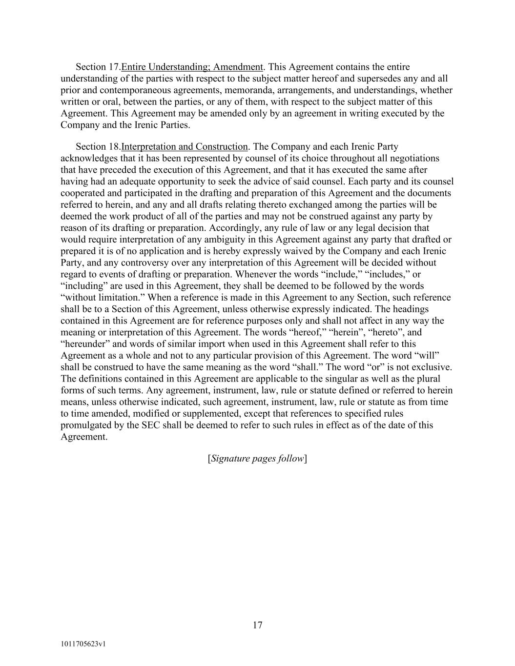 17 1011705623v1 Section 17.Entire Understanding; Amendment. This Agreement contains the entire understanding of the parties with respect to the subject matter hereof and supersedes any and all prior and contemporaneous agreements, memoranda, arrangements, and understandings, whether written or oral, between the parties, or any of them, with respect to the subject matter of this Agreement. This Agreement may be amended only by an agreement in writing executed by the Company and the Irenic Parties. Section 18.Interpretation and Construction. The Company and each Irenic Party acknowledges that it has been represented by counsel of its choice throughout all negotiations that have preceded the execution of this Agreement, and that it has executed the same after having had an adequate opportunity to seek the advice of said counsel. Each party and its counsel cooperated and participated in the drafting and preparation of this Agreement and the documents referred to herein, and any and all drafts relating thereto exchanged among the parties will be deemed the work product of all of the parties and may not be construed against any party by reason of its drafting or preparation. Accordingly, any rule of law or any legal decision that would require interpretation of any ambiguity in this Agreement against any party that drafted or prepared it is of no application and is hereby expressly waived by the Company and each Irenic Party, and any controversy over any interpretation of this Agreement will be decided without regard to events of drafting or preparation. Whenever the words “include,” “includes,” or “including” are used in this Agreement, they shall be deemed to be followed by the words “without limitation.” When a reference is made in this Agreement to any Section, such reference shall be to a Section of this Agreement, unless otherwise expressly indicated. The headings contained in this Agreement are for reference purposes only and shall not affect in any way the meaning or interpretation of this Agreement. The words “hereof,” “herein”, “hereto”, and “hereunder” and words of similar import when used in this Agreement shall refer to this Agreement as a whole and not to any particular provision of this Agreement. The word “will” shall be construed to have the same meaning as the word “shall.” The word “or” is not exclusive. The definitions contained in this Agreement are applicable to the singular as well as the plural forms of such terms. Any agreement, instrument, law, rule or statute defined or referred to herein means, unless otherwise indicated, such agreement, instrument, law, rule or statute as from time to time amended, modified or supplemented, except that references to specified rules promulgated by the SEC shall be deemed to refer to such rules in effect as of the date of this Agreement. [Signature pages follow]