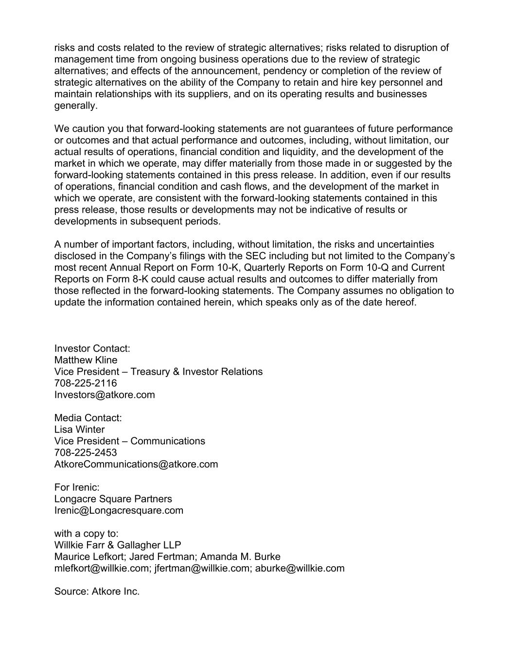 14 1011705623v1 Atkore Inc. 16100 South Lathrop Avenue Harvey, IL 60426 Attention: Daniel S. Kelly, Esq; William E. Waltz; John Deitzer; Matthew Kline Email: DKelly@atkore.com; BWaltz@atkore.com; JDeitzer@atkore.com; MKline@atkore.com with a copy (which shall not constitute notice) to: Debevoise & Plimpton LLP 66 Hudson Boulevard New York, New York 10001 Attention: Benjamin R. Pedersen; Paul M. Rodel; William D. Regner Email: brpedersen@debevoise.com; pmrodel@debevoise.com; wdregner@debevoise.com If to the Irenic Parties: Irenic Capital Management L.P. 767 Fifth Avenue, 15th Floor New York, New York 10153 Attention: Josh Brodman Email: jbrodman@irenicmgmt.com with a copy (which shall not constitute notice) to: Willkie Farr & Gallagher LLP 787 Seventh Avenue New York, New York 10019 Attention: Maurice Lefkort, Esq.; Jared Fertman; Amanda M. Burke Email: Mlefkort@willkie.com; jfertman@willkie.com; aburke@willkie.com At any time, any party may, by notice given in accordance with this Section 8 to the other party, provide updated information for notices under this Agreement. Section 9. Expenses. All fees, costs and expenses incurred in connection with this Agreement and all matters related to this Agreement will be paid by the party incurring such fees, costs or expenses; provided, however, that the Company shall reimburse the Irenic Parties for their reasonable and documented out of pocket fees and expenses, including legal fees, incurred on or prior to the Effective Date and in connection with the Irenic Parties’ involvement at the Company, and including but not limited to, the preparation of the Nomination Notice and the negotiation and execution of this Agreement, in an amount not to exceed $300,000 in the aggregate.