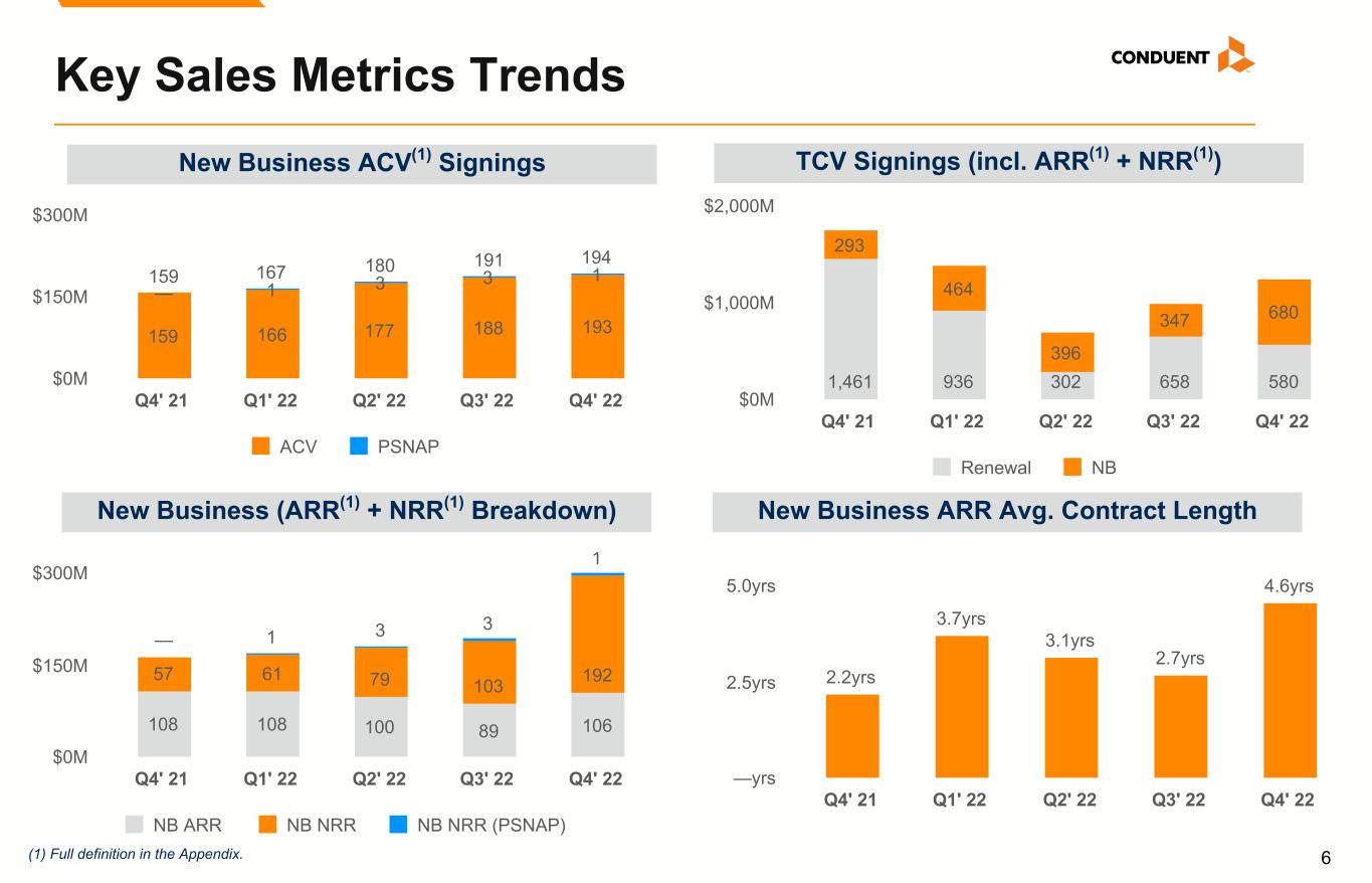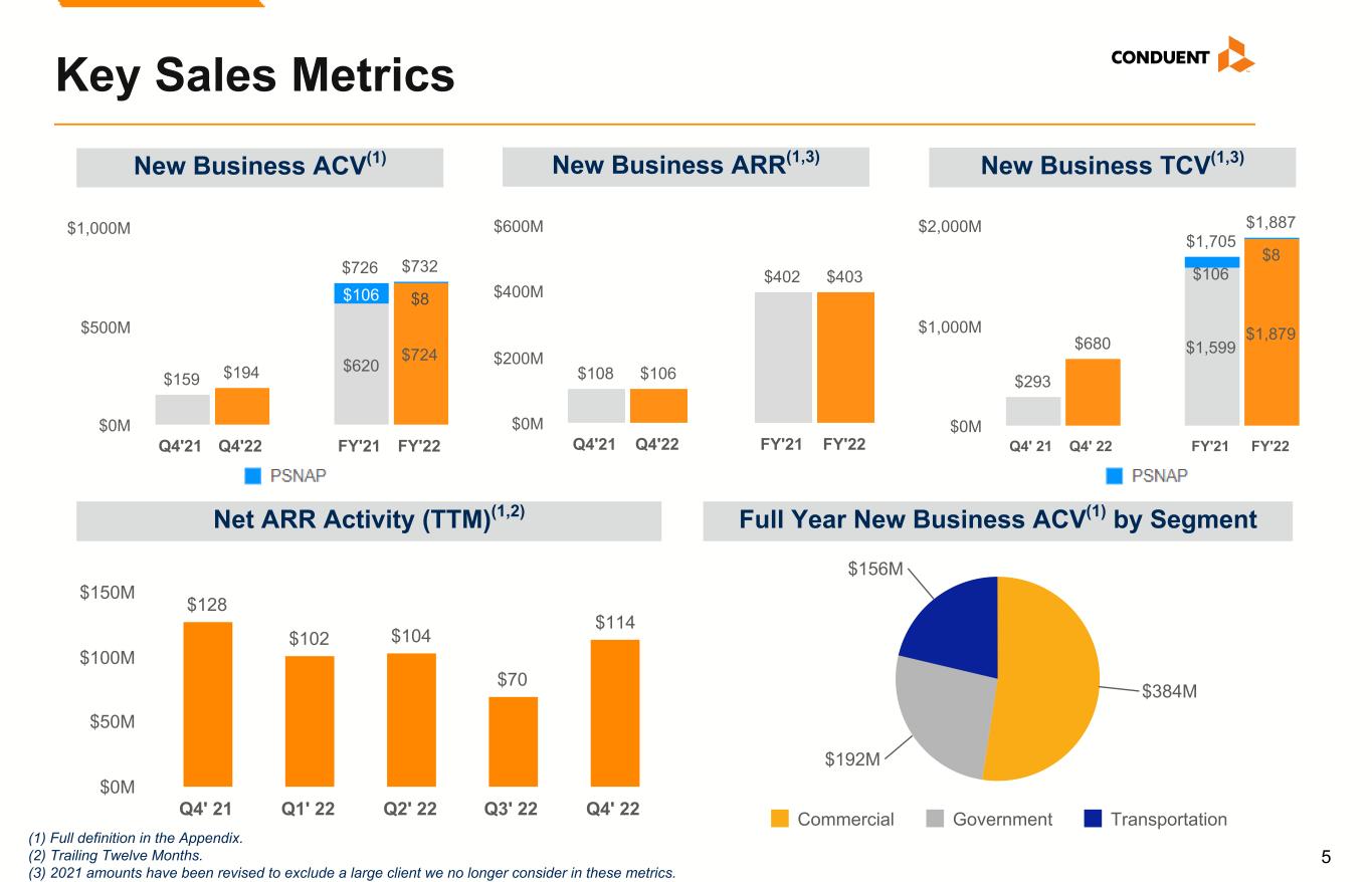 Cliff Skelton, Conduent President and Chief Executive Officer stated, “Q4 and 2022 brought with it a mixture of both headwinds and tailwinds such as foreign exchange rates, inflation-induced volume degradation, and interest rate increases. Despite the economic uncertainty, revenue and EBITDA results were within our previously articulated expectations. Year-over-year Annual Contract Value sales were up considerably in both Q4 and full year, improving across all three segments, particularly in Q4 for our Government Healthcare business. We continued to make progress toward our mission to achieve year-over-year top line growth and expect to see two of our three businesses units grow in 2023.”
