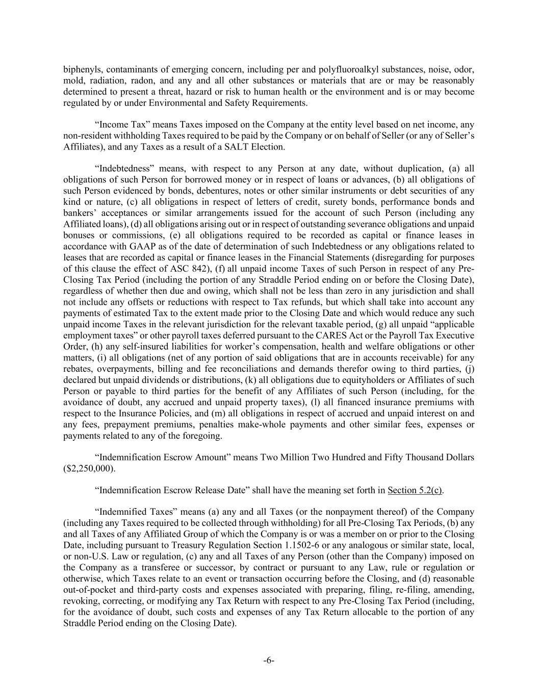 -6- biphenyls, contaminants of emerging concern, including per and polyfluoroalkyl substances, noise, odor, mold, radiation, radon, and any and all other substances or materials that are or may be reasonably determined to present a threat, hazard or risk to human health or the environment and is or may become regulated by or under Environmental and Safety Requirements. “Income Tax” means Taxes imposed on the Company at the entity level based on net income, any non-resident withholding Taxes required to be paid by the Company or on behalf of Seller (or any of Seller’s Affiliates), and any Taxes as a result of a SALT Election. “Indebtedness” means, with respect to any Person at any date, without duplication, (a) all obligations of such Person for borrowed money or in respect of loans or advances, (b) all obligations of such Person evidenced by bonds, debentures, notes or other similar instruments or debt securities of any kind or nature, (c) all obligations in respect of letters of credit, surety bonds, performance bonds and bankers’ acceptances or similar arrangements issued for the account of such Person (including any Affiliated loans), (d) all obligations arising out or in respect of outstanding severance obligations and unpaid bonuses or commissions, (e) all obligations required to be recorded as capital or finance leases in accordance with GAAP as of the date of determination of such Indebtedness or any obligations related to leases that are recorded as capital or finance leases in the Financial Statements (disregarding for purposes of this clause the effect of ASC 842), (f) all unpaid income Taxes of such Person in respect of any Pre- Closing Tax Period (including the portion of any Straddle Period ending on or before the Closing Date), regardless of whether then due and owing, which shall not be less than zero in any jurisdiction and shall not include any offsets or reductions with respect to Tax refunds, but which shall take into account any payments of estimated Tax to the extent made prior to the Closing Date and which would reduce any such unpaid income Taxes in the relevant jurisdiction for the relevant taxable period, (g) all unpaid “applicable employment taxes” or other payroll taxes deferred pursuant to the CARES Act or the Payroll Tax Executive Order, (h) any self-insured liabilities for worker’s compensation, health and welfare obligations or other matters, (i) all obligations (net of any portion of said obligations that are in accounts receivable) for any rebates, overpayments, billing and fee reconciliations and demands therefor owing to third parties, (j) declared but unpaid dividends or distributions, (k) all obligations due to equityholders or Affiliates of such Person or payable to third parties for the benefit of any Affiliates of such Person (including, for the avoidance of doubt, any accrued and unpaid property taxes), (l) all financed insurance premiums with respect to the Insurance Policies, and (m) all obligations in respect of accrued and unpaid interest on and any fees, prepayment premiums, penalties make-whole payments and other similar fees, expenses or payments related to any of the foregoing. “Indemnification Escrow Amount” means Two Million Two Hundred and Fifty Thousand Dollars ($2,250,000). “Indemnification Escrow Release Date” shall have the meaning set forth in Section 5.2(c). “Indemnified Taxes” means (a) any and all Taxes (or the nonpayment thereof) of the Company (including any Taxes required to be collected through withholding) for all Pre-Closing Tax Periods, (b) any and all Taxes of any Affiliated Group of which the Company is or was a member on or prior to the Closing Date, including pursuant to Treasury Regulation Section 1.1502-6 or any analogous or similar state, local, or non-U.S. Law or regulation, (c) any and all Taxes of any Person (other than the Company) imposed on the Company as a transferee or successor, by contract or pursuant to any Law, rule or regulation or otherwise, which Taxes relate to an event or transaction occurring before the Closing, and (d) reasonable out-of-pocket and third-party costs and expenses associated with preparing, filing, re-filing, amending, revoking, correcting, or modifying any Tax Return with respect to any Pre-Closing Tax Period (including, for the avoidance of doubt, such costs and expenses of any Tax Return allocable to the portion of any Straddle Period ending on the Closing Date).