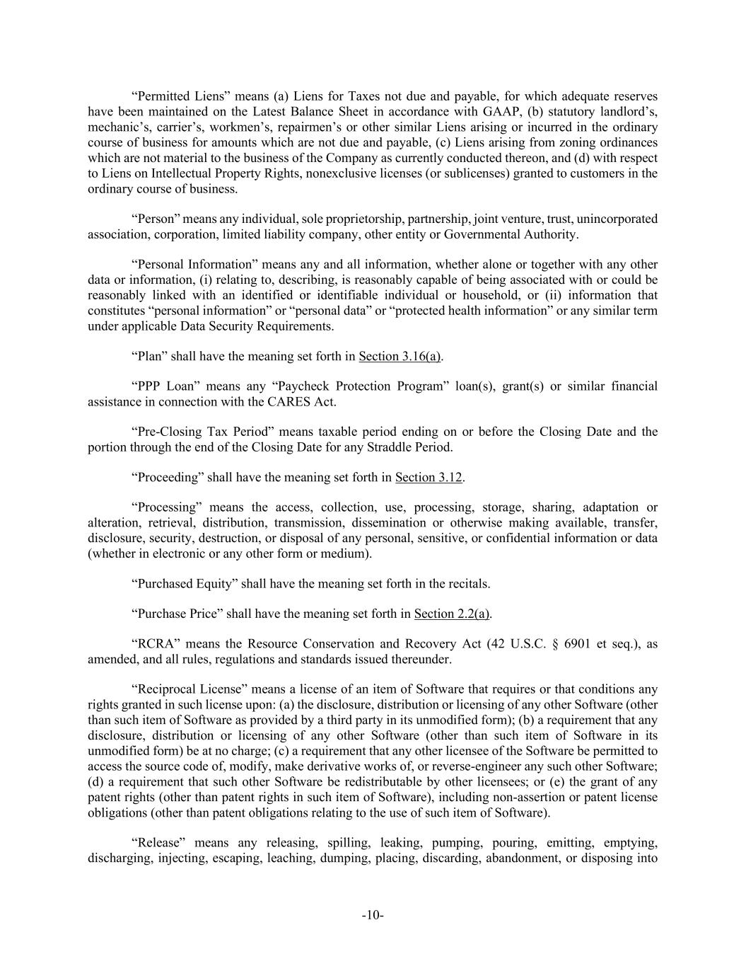 -10- “Permitted Liens” means (a) Liens for Taxes not due and payable, for which adequate reserves have been maintained on the Latest Balance Sheet in accordance with GAAP, (b) statutory landlord’s, mechanic’s, carrier’s, workmen’s, repairmen’s or other similar Liens arising or incurred in the ordinary course of business for amounts which are not due and payable, (c) Liens arising from zoning ordinances which are not material to the business of the Company as currently conducted thereon, and (d) with respect to Liens on Intellectual Property Rights, nonexclusive licenses (or sublicenses) granted to customers in the ordinary course of business. “Person” means any individual, sole proprietorship, partnership, joint venture, trust, unincorporated association, corporation, limited liability company, other entity or Governmental Authority. “Personal Information” means any and all information, whether alone or together with any other data or information, (i) relating to, describing, is reasonably capable of being associated with or could be reasonably linked with an identified or identifiable individual or household, or (ii) information that constitutes “personal information” or “personal data” or “protected health information” or any similar term under applicable Data Security Requirements. “Plan” shall have the meaning set forth in Section 3.16(a). “PPP Loan” means any “Paycheck Protection Program” loan(s), grant(s) or similar financial assistance in connection with the CARES Act. “Pre-Closing Tax Period” means taxable period ending on or before the Closing Date and the portion through the end of the Closing Date for any Straddle Period. “Proceeding” shall have the meaning set forth in Section 3.12. “Processing” means the access, collection, use, processing, storage, sharing, adaptation or alteration, retrieval, distribution, transmission, dissemination or otherwise making available, transfer, disclosure, security, destruction, or disposal of any personal, sensitive, or confidential information or data (whether in electronic or any other form or medium). “Purchased Equity” shall have the meaning set forth in the recitals. “Purchase Price” shall have the meaning set forth in Section 2.2(a). “RCRA” means the Resource Conservation and Recovery Act (42 U.S.C. § 6901 et seq.), as amended, and all rules, regulations and standards issued thereunder. “Reciprocal License” means a license of an item of Software that requires or that conditions any rights granted in such license upon: (a) the disclosure, distribution or licensing of any other Software (other than such item of Software as provided by a third party in its unmodified form); (b) a requirement that any disclosure, distribution or licensing of any other Software (other than such item of Software in its unmodified form) be at no charge; (c) a requirement that any other licensee of the Software be permitted to access the source code of, modify, make derivative works of, or reverse-engineer any such other Software; (d) a requirement that such other Software be redistributable by other licensees; or (e) the grant of any patent rights (other than patent rights in such item of Software), including non-assertion or patent license obligations (other than patent obligations relating to the use of such item of Software). “Release” means any releasing, spilling, leaking, pumping, pouring, emitting, emptying, discharging, injecting, escaping, leaching, dumping, placing, discarding, abandonment, or disposing into