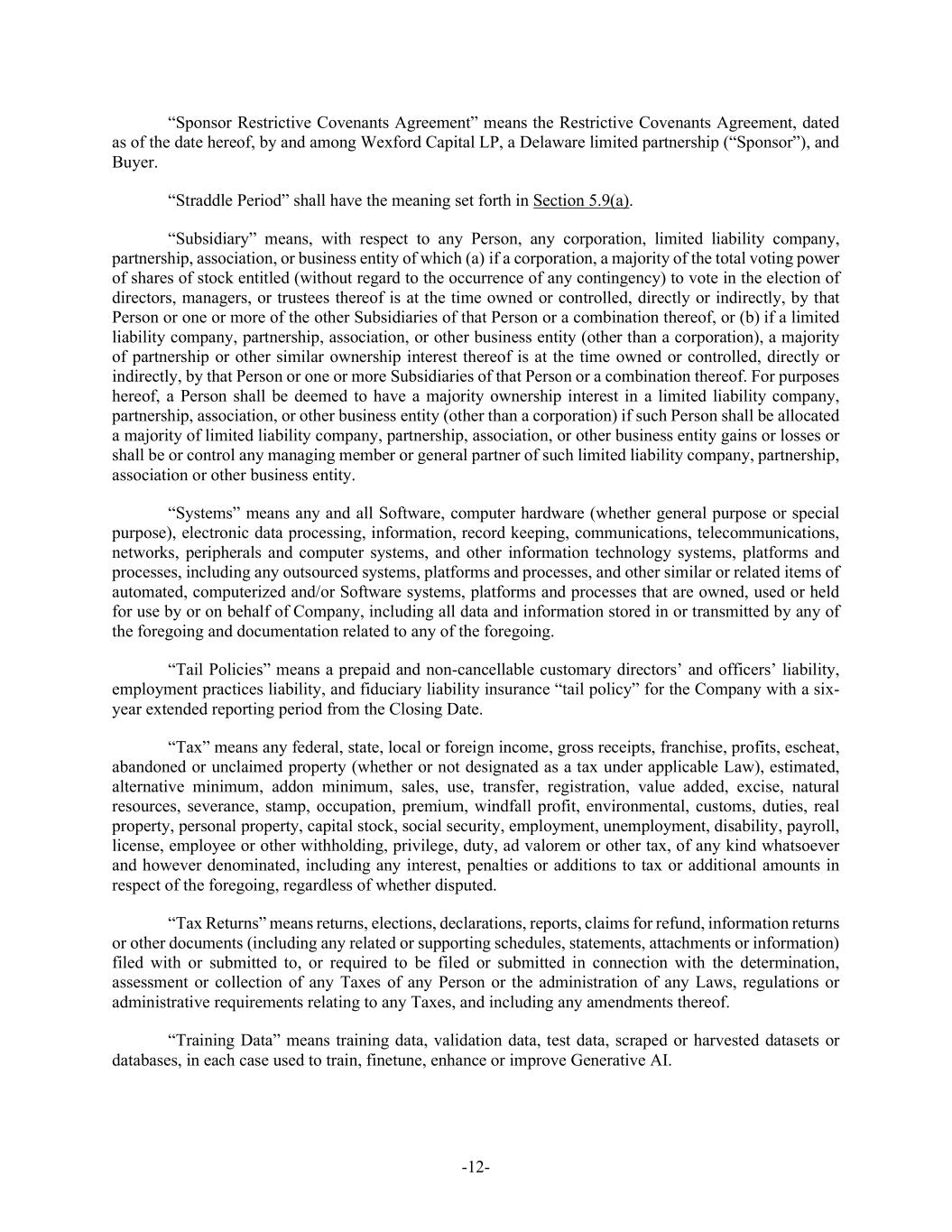 -12- “Sponsor Restrictive Covenants Agreement” means the Restrictive Covenants Agreement, dated as of the date hereof, by and among Wexford Capital LP, a Delaware limited partnership (“Sponsor”), and Buyer. “Straddle Period” shall have the meaning set forth in Section 5.9(a). “Subsidiary” means, with respect to any Person, any corporation, limited liability company, partnership, association, or business entity of which (a) if a corporation, a majority of the total voting power of shares of stock entitled (without regard to the occurrence of any contingency) to vote in the election of directors, managers, or trustees thereof is at the time owned or controlled, directly or indirectly, by that Person or one or more of the other Subsidiaries of that Person or a combination thereof, or (b) if a limited liability company, partnership, association, or other business entity (other than a corporation), a majority of partnership or other similar ownership interest thereof is at the time owned or controlled, directly or indirectly, by that Person or one or more Subsidiaries of that Person or a combination thereof. For purposes hereof, a Person shall be deemed to have a majority ownership interest in a limited liability company, partnership, association, or other business entity (other than a corporation) if such Person shall be allocated a majority of limited liability company, partnership, association, or other business entity gains or losses or shall be or control any managing member or general partner of such limited liability company, partnership, association or other business entity. “Systems” means any and all Software, computer hardware (whether general purpose or special purpose), electronic data processing, information, record keeping, communications, telecommunications, networks, peripherals and computer systems, and other information technology systems, platforms and processes, including any outsourced systems, platforms and processes, and other similar or related items of automated, computerized and/or Software systems, platforms and processes that are owned, used or held for use by or on behalf of Company, including all data and information stored in or transmitted by any of the foregoing and documentation related to any of the foregoing. “Tail Policies” means a prepaid and non-cancellable customary directors’ and officers’ liability, employment practices liability, and fiduciary liability insurance “tail policy” for the Company with a six- year extended reporting period from the Closing Date. “Tax” means any federal, state, local or foreign income, gross receipts, franchise, profits, escheat, abandoned or unclaimed property (whether or not designated as a tax under applicable Law), estimated, alternative minimum, addon minimum, sales, use, transfer, registration, value added, excise, natural resources, severance, stamp, occupation, premium, windfall profit, environmental, customs, duties, real property, personal property, capital stock, social security, employment, unemployment, disability, payroll, license, employee or other withholding, privilege, duty, ad valorem or other tax, of any kind whatsoever and however denominated, including any interest, penalties or additions to tax or additional amounts in respect of the foregoing, regardless of whether disputed. “Tax Returns” means returns, elections, declarations, reports, claims for refund, information returns or other documents (including any related or supporting schedules, statements, attachments or information) filed with or submitted to, or required to be filed or submitted in connection with the determination, assessment or collection of any Taxes of any Person or the administration of any Laws, regulations or administrative requirements relating to any Taxes, and including any amendments thereof. “Training Data” means training data, validation data, test data, scraped or harvested datasets or databases, in each case used to train, finetune, enhance or improve Generative AI.