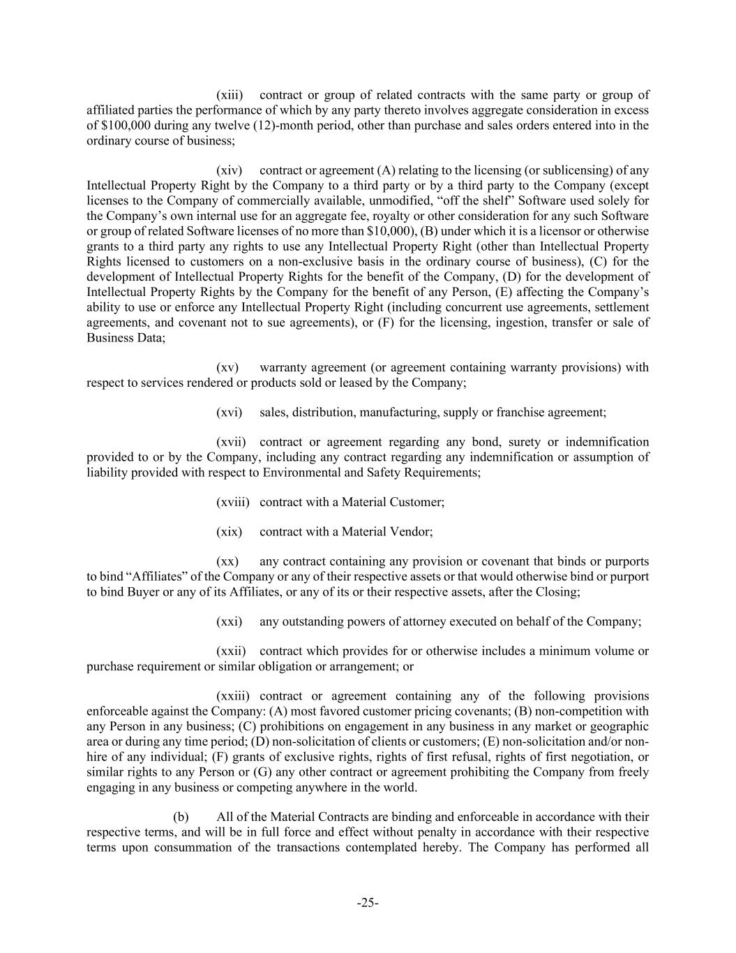 -25- (xiii) contract or group of related contracts with the same party or group of affiliated parties the performance of which by any party thereto involves aggregate consideration in excess of $100,000 during any twelve (12)-month period, other than purchase and sales orders entered into in the ordinary course of business; (xiv) contract or agreement (A) relating to the licensing (or sublicensing) of any Intellectual Property Right by the Company to a third party or by a third party to the Company (except licenses to the Company of commercially available, unmodified, “off the shelf” Software used solely for the Company’s own internal use for an aggregate fee, royalty or other consideration for any such Software or group of related Software licenses of no more than $10,000), (B) under which it is a licensor or otherwise grants to a third party any rights to use any Intellectual Property Right (other than Intellectual Property Rights licensed to customers on a non-exclusive basis in the ordinary course of business), (C) for the development of Intellectual Property Rights for the benefit of the Company, (D) for the development of Intellectual Property Rights by the Company for the benefit of any Person, (E) affecting the Company’s ability to use or enforce any Intellectual Property Right (including concurrent use agreements, settlement agreements, and covenant not to sue agreements), or (F) for the licensing, ingestion, transfer or sale of Business Data; (xv) warranty agreement (or agreement containing warranty provisions) with respect to services rendered or products sold or leased by the Company; (xvi) sales, distribution, manufacturing, supply or franchise agreement; (xvii) contract or agreement regarding any bond, surety or indemnification provided to or by the Company, including any contract regarding any indemnification or assumption of liability provided with respect to Environmental and Safety Requirements; (xviii) contract with a Material Customer; (xix) contract with a Material Vendor; (xx) any contract containing any provision or covenant that binds or purports to bind “Affiliates” of the Company or any of their respective assets or that would otherwise bind or purport to bind Buyer or any of its Affiliates, or any of its or their respective assets, after the Closing; (xxi) any outstanding powers of attorney executed on behalf of the Company; (xxii) contract which provides for or otherwise includes a minimum volume or purchase requirement or similar obligation or arrangement; or (xxiii) contract or agreement containing any of the following provisions enforceable against the Company: (A) most favored customer pricing covenants; (B) non-competition with any Person in any business; (C) prohibitions on engagement in any business in any market or geographic area or during any time period; (D) non-solicitation of clients or customers; (E) non-solicitation and/or non- hire of any individual; (F) grants of exclusive rights, rights of first refusal, rights of first negotiation, or similar rights to any Person or (G) any other contract or agreement prohibiting the Company from freely engaging in any business or competing anywhere in the world. (b) All of the Material Contracts are binding and enforceable in accordance with their respective terms, and will be in full force and effect without penalty in accordance with their respective terms upon consummation of the transactions contemplated hereby. The Company has performed all