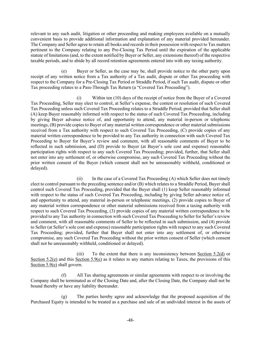 -48- relevant to any such audit, litigation or other proceeding and making employees available on a mutually convenient basis to provide additional information and explanation of any material provided hereunder. The Company and Seller agree to retain all books and records in their possession with respect to Tax matters pertinent to the Company relating to any Pre-Closing Tax Period until the expiration of the applicable statute of limitations (and, to the extent notified by Buyer or Seller, any extensions thereof) of the respective taxable periods, and to abide by all record retention agreements entered into with any taxing authority. (e) Buyer or Seller, as the case may be, shall provide notice to the other party upon receipt of any written notice from a Tax authority of a Tax audit, dispute or other Tax proceeding with respect to the Company for a Pre-Closing Tax Period or Straddle Period, if such Tax audit, dispute or other Tax proceeding relates to a Pass-Through Tax Return (a “Covered Tax Proceeding”). (i) Within ten (10) days of the receipt of notice from the Buyer of a Covered Tax Proceeding, Seller may elect to control, at Seller’s expense, the contest or resolution of such Covered Tax Proceeding unless such Covered Tax Proceeding relates to a Straddle Period; provided that Seller shall (A) keep Buyer reasonably informed with respect to the status of such Covered Tax Proceeding, including by giving Buyer advance notice of, and opportunity to attend, any material in-person or telephonic meetings, (B) provide copies to Buyer of any material written correspondence or other material submissions received from a Tax authority with respect to such Covered Tax Proceeding, (C) provide copies of any material written correspondence to be provided to any Tax authority in connection with such Covered Tax Proceeding to Buyer for Buyer’s review and comment, with all reasonable comments of Buyer to be reflected in such submission, and (D) provide to Buyer (at Buyer’s sole cost and expense) reasonable participation rights with respect to any such Covered Tax Proceeding; provided, further, that Seller shall not enter into any settlement of, or otherwise compromise, any such Covered Tax Proceeding without the prior written consent of the Buyer (which consent shall not be unreasonably withheld, conditioned or delayed). (ii) In the case of a Covered Tax Proceeding (A) which Seller does not timely elect to control pursuant to the preceding sentence and/or (B) which relates to a Straddle Period, Buyer shall control such Covered Tax Proceeding, provided that the Buyer shall (1) keep Seller reasonably informed with respect to the status of such Covered Tax Proceeding, including by giving Seller advance notice of, and opportunity to attend, any material in-person or telephonic meetings, (2) provide copies to Buyer of any material written correspondence or other material submissions received from a taxing authority with respect to such Covered Tax Proceeding, (3) provide copies of any material written correspondence to be provided to any Tax authority in connection with such Covered Tax Proceeding to Seller for Seller’s review and comment, with all reasonable comments of Seller to be reflected in such submission, and (4) provide to Seller (at Seller’s sole cost and expense) reasonable participation rights with respect to any such Covered Tax Proceeding; provided, further that Buyer shall not enter into any settlement of, or otherwise compromise, any such Covered Tax Proceeding without the prior written consent of Seller (which consent shall not be unreasonably withheld, conditioned or delayed). (iii) To the extent that there is any inconsistency between Section 5.2(d) or Section 5.2(e) and this Section 5.9(e) as it relates to any matters relating to Taxes, the provisions of this Section 5.9(e) shall govern. (f) All Tax sharing agreements or similar agreements with respect to or involving the Company shall be terminated as of the Closing Date and, after the Closing Date, the Company shall not be bound thereby or have any liability thereunder. (g) The parties hereby agree and acknowledge that the proposed acquisition of the Purchased Equity is intended to be treated as a purchase and sale of an undivided interest in the assets of