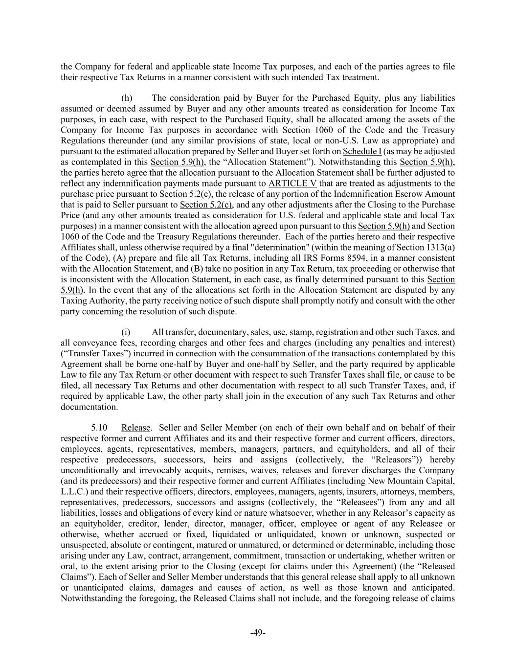 -49- the Company for federal and applicable state Income Tax purposes, and each of the parties agrees to file their respective Tax Returns in a manner consistent with such intended Tax treatment. (h) The consideration paid by Buyer for the Purchased Equity, plus any liabilities assumed or deemed assumed by Buyer and any other amounts treated as consideration for Income Tax purposes, in each case, with respect to the Purchased Equity, shall be allocated among the assets of the Company for Income Tax purposes in accordance with Section 1060 of the Code and the Treasury Regulations thereunder (and any similar provisions of state, local or non-U.S. Law as appropriate) and pursuant to the estimated allocation prepared by Seller and Buyer set forth on Schedule I (as may be adjusted as contemplated in this Section 5.9(h), the “Allocation Statement”). Notwithstanding this Section 5.9(h), the parties hereto agree that the allocation pursuant to the Allocation Statement shall be further adjusted to reflect any indemnification payments made pursuant to ARTICLE V that are treated as adjustments to the purchase price pursuant to Section 5.2(c), the release of any portion of the Indemnification Escrow Amount that is paid to Seller pursuant to Section 5.2(c), and any other adjustments after the Closing to the Purchase Price (and any other amounts treated as consideration for U.S. federal and applicable state and local Tax purposes) in a manner consistent with the allocation agreed upon pursuant to this Section 5.9(h) and Section 1060 of the Code and the Treasury Regulations thereunder. Each of the parties hereto and their respective Affiliates shall, unless otherwise required by a final "determination" (within the meaning of Section 1313(a) of the Code), (A) prepare and file all Tax Returns, including all IRS Forms 8594, in a manner consistent with the Allocation Statement, and (B) take no position in any Tax Return, tax proceeding or otherwise that is inconsistent with the Allocation Statement, in each case, as finally determined pursuant to this Section 5.9(h). In the event that any of the allocations set forth in the Allocation Statement are disputed by any Taxing Authority, the party receiving notice of such dispute shall promptly notify and consult with the other party concerning the resolution of such dispute. (i) All transfer, documentary, sales, use, stamp, registration and other such Taxes, and all conveyance fees, recording charges and other fees and charges (including any penalties and interest) (“Transfer Taxes”) incurred in connection with the consummation of the transactions contemplated by this Agreement shall be borne one-half by Buyer and one-half by Seller, and the party required by applicable Law to file any Tax Return or other document with respect to such Transfer Taxes shall file, or cause to be filed, all necessary Tax Returns and other documentation with respect to all such Transfer Taxes, and, if required by applicable Law, the other party shall join in the execution of any such Tax Returns and other documentation. 5.10 Release. Seller and Seller Member (on each of their own behalf and on behalf of their respective former and current Affiliates and its and their respective former and current officers, directors, employees, agents, representatives, members, managers, partners, and equityholders, and all of their respective predecessors, successors, heirs and assigns (collectively, the “Releasors”)) hereby unconditionally and irrevocably acquits, remises, waives, releases and forever discharges the Company (and its predecessors) and their respective former and current Affiliates (including New Mountain Capital, L.L.C.) and their respective officers, directors, employees, managers, agents, insurers, attorneys, members, representatives, predecessors, successors and assigns (collectively, the “Releasees”) from any and all liabilities, losses and obligations of every kind or nature whatsoever, whether in any Releasor’s capacity as an equityholder, creditor, lender, director, manager, officer, employee or agent of any Releasee or otherwise, whether accrued or fixed, liquidated or unliquidated, known or unknown, suspected or unsuspected, absolute or contingent, matured or unmatured, or determined or determinable, including those arising under any Law, contract, arrangement, commitment, transaction or undertaking, whether written or oral, to the extent arising prior to the Closing (except for claims under this Agreement) (the “Released Claims”). Each of Seller and Seller Member understands that this general release shall apply to all unknown or unanticipated claims, damages and causes of action, as well as those known and anticipated. Notwithstanding the foregoing, the Released Claims shall not include, and the foregoing release of claims