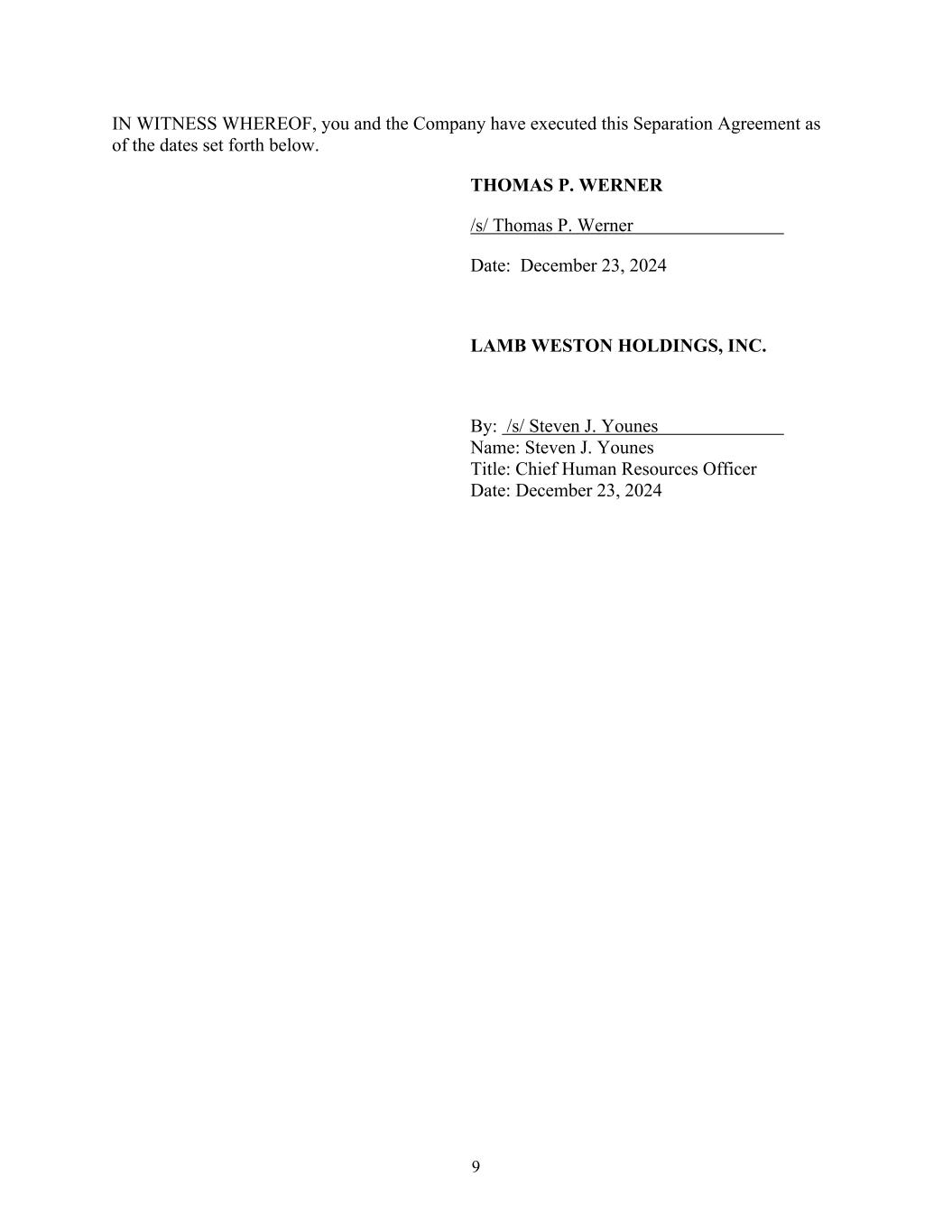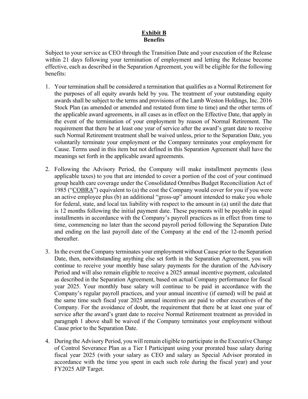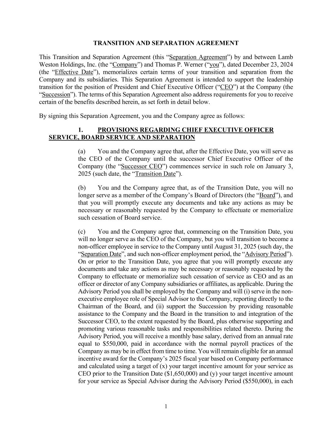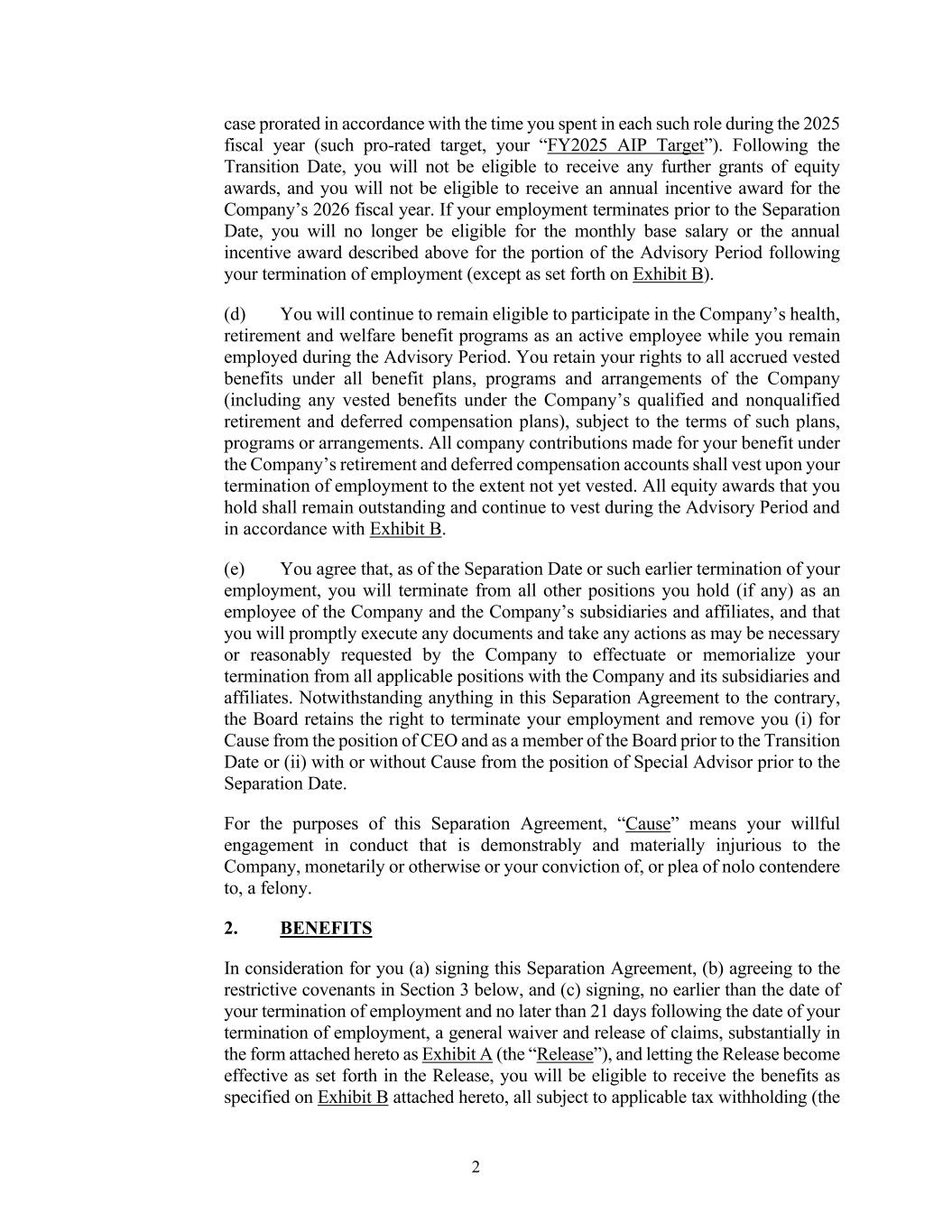 ヴェルナー氏の特別顧問としての職務に対し、報酬委員会は年俸55万ドルを基本給とし、2025年度のAIPに基づく賞与を基本給の100%(当該年度の混合ベース)を目標水準とし、ヴェルナー氏の未払い株式報酬の全額を権利確定することを承認した。また、ヴェルナー氏は、守秘義務、解雇後18ヶ月の競業避止義務および非勧誘義務を含む制限的誓約義務を引き続き遵守することを条件として、有効な基本報酬契約に規定された「通常の退職」権利確定条項に記載されているとおり、ヴェルナー氏の未払い株式報酬の全額を権利確定する。ヴェルナー氏の業績株報奨(「PSA」)が支払われる場合は、各PSAの該当業績サイクル終了時の報酬委員会による最終業績認定に基づく。ヴェルナー氏は、ラム・ウェストンの業績に基づき、2025年度のAIP報奨を受ける資格を有し、当該年度のそれぞれの勤務に適用される目標報奨額に基づいて比例配分されます。ヴェルナー氏には、2026年度のAIPまたは新規LTIP報奨の資格はありません。ヴェルナー氏は、諮問期間中も引き続き当社の福利厚生プログラムに参加する資格を有する。ヴェルナー氏の報酬条件は、2024年12月23日付の移行および分離契約(以下「ヴェルナー契約」)に規定されており、その写しは別紙10.2として添付されています。ヴェルナー契約の前述の説明は完全を意図するものではなく、参照により本書に組み込まれるヴェルナー契約の全文を参照することにより、その全体が限定されるものとする。