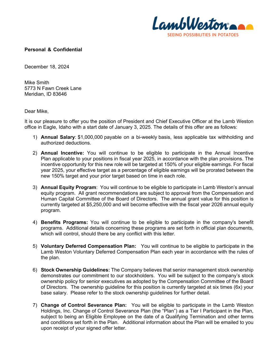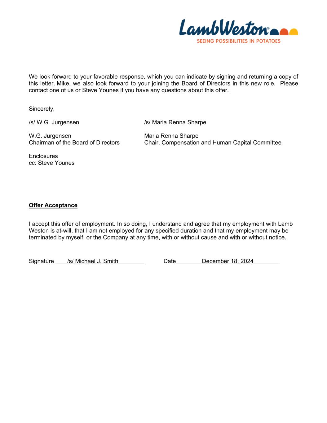 スミス氏は、同氏と他のいかなる人物との間の取り決めや理解に従って選ばれたわけではありません。スミス氏と Lamb Weston の取締役または執行役員の間に家族関係はありません。ラム・ウェストンとスミス氏の間には、レギュレーション S-K の項目 404(a) で報告すべき関連者取引はありません。