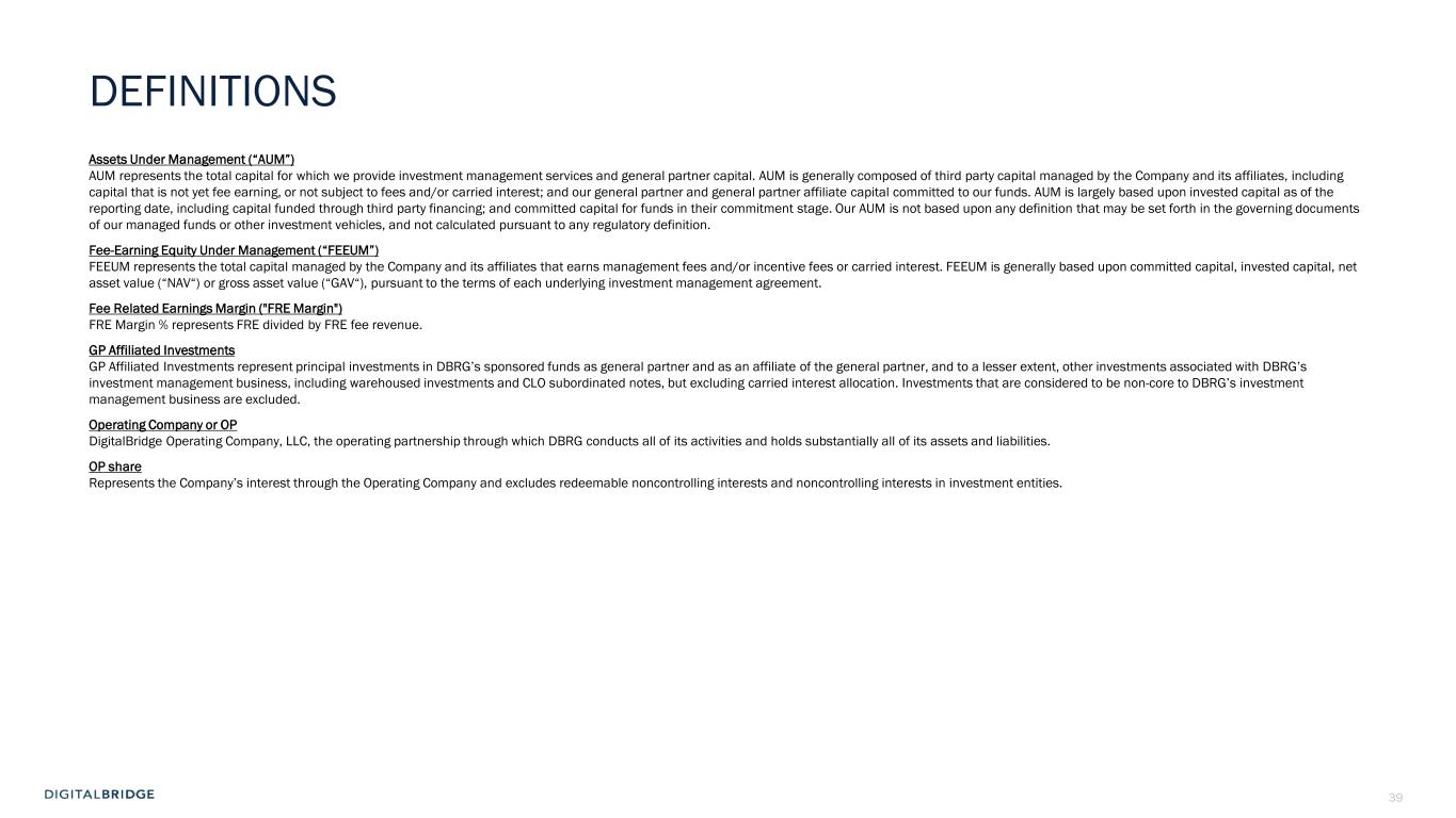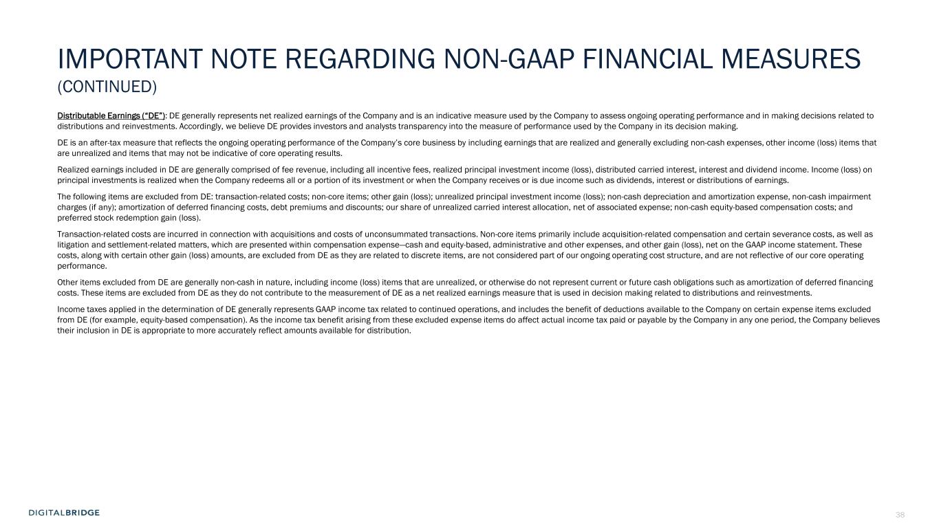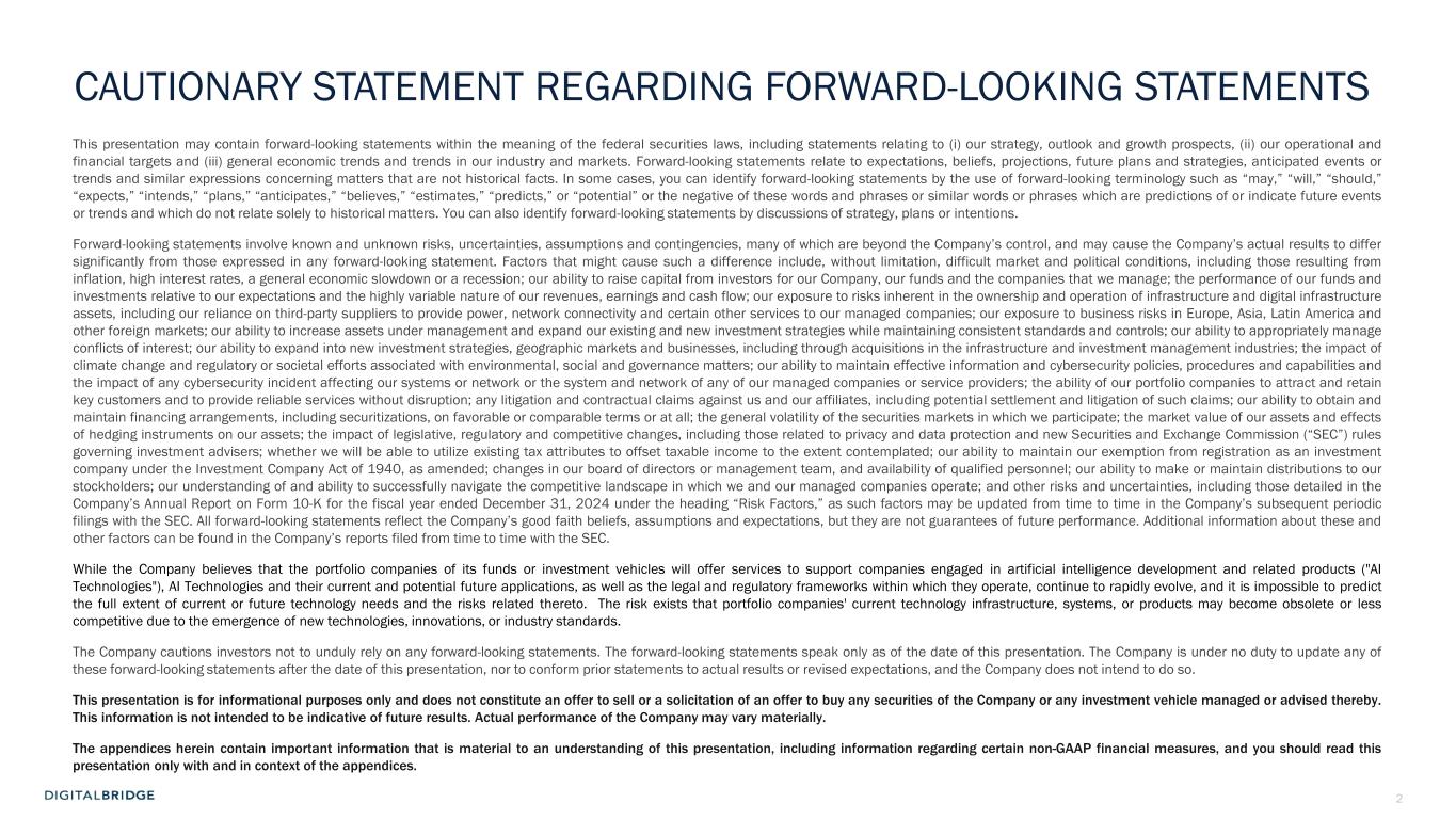 2 CAUTIONARY STATEMENT REGARDING FORWARD-LOOKING STATEMENTS This presentation may contain forward-looking statements within the meaning of the federal securities laws, including statements relating to (i) our strategy, outlook and growth prospects, (ii) our operational and financial targets and (iii) general economic trends and trends in our industry and markets. Forward-looking statements relate to expectations, beliefs, projections, future plans and strategies, anticipated events or trends and similar expressions concerning matters that are not historical facts. In some cases, you can identify forward-looking statements by the use of forward-looking terminology such as “may,” “will,” “should,” “expects,” “intends,” “plans,” “anticipates,” “believes,” “estimates,” “predicts,” or “potential” or the negative of these words and phrases or similar words or phrases which are predictions of or indicate future events or trends and which do not relate solely to historical matters. You can also identify forward-looking statements by discussions of strategy, plans or intentions. Forward-looking statements involve known and unknown risks, uncertainties, assumptions and contingencies, many of which are beyond the Company’s control, and may cause the Company’s actual results to differ significantly from those expressed in any forward-looking statement. Factors that might cause such a difference include, without limitation, difficult market and political conditions, including those resulting from inflation, high interest rates, a general economic slowdown or a recession; our ability to raise capital from investors for our Company, our funds and the companies that we manage; the performance of our funds and investments relative to our expectations and the highly variable nature of our revenues, earnings and cash flow; our exposure to risks inherent in the ownership and operation of infrastructure and digital infrastructure assets, including our reliance on third-party suppliers to provide power, network connectivity and certain other services to our managed companies; our exposure to business risks in Europe, Asia, Latin America and other foreign markets; our ability to increase assets under management and expand our existing and new investment strategies while maintaining consistent standards and controls; our ability to appropriately manage conflicts of interest; our ability to expand into new investment strategies, geographic markets and businesses, including through acquisitions in the infrastructure and investment management industries; the impact of climate change and regulatory or societal efforts associated with environmental, social and governance matters; our ability to maintain effective information and cybersecurity policies, procedures and capabilities and the impact of any cybersecurity incident affecting our systems or network or the system and network of any of our managed companies or service providers; the ability of our portfolio companies to attract and retain key customers and to provide reliable services without disruption; any litigation and contractual claims against us and our affiliates, including potential settlement and litigation of such claims; our ability to obtain and maintain financing arrangements, including securitizations, on favorable or comparable terms or at all; the general volatility of the securities markets in which we participate; the market value of our assets and effects of hedging instruments on our assets; the impact of legislative, regulatory and competitive changes, including those related to privacy and data protection and new Securities and Exchange Commission (“SEC”) rules governing investment advisers; whether we will be able to utilize existing tax attributes to offset taxable income to the extent contemplated; our ability to maintain our exemption from registration as an investment company under the Investment Company Act of 1940, as amended; changes in our board of directors or management team, and availability of qualified personnel; our ability to make or maintain distributions to our stockholders; our understanding of and ability to successfully navigate the competitive landscape in which we and our managed companies operate; and other risks and uncertainties, including those detailed in the Company’s Annual Report on Form 10-K for the fiscal year ended December 31, 2024 under the heading “Risk Factors,” as such factors may be updated from time to time in the Company’s subsequent periodic filings with the SEC. All forward-looking statements reflect the Company’s good faith beliefs, assumptions and expectations, but they are not guarantees of future performance. Additional information about these and other factors can be found in the Company’s reports filed from time to time with the SEC. While the Company believes that the portfolio companies of its funds or investment vehicles will offer services to support companies engaged in artificial intelligence development and related products ("AI Technologies"), AI Technologies and their current and potential future applications, as well as the legal and regulatory frameworks within which they operate, continue to rapidly evolve, and it is impossible to predict the full extent of current or future technology needs and the risks related thereto. The risk exists that portfolio companies' current technology infrastructure, systems, or products may become obsolete or less competitive due to the emergence of new technologies, innovations, or industry standards. The Company cautions investors not to unduly rely on any forward-looking statements. The forward-looking statements speak only as of the date of this presentation. The Company is under no duty to update any of these forward-looking statements after the date of this presentation, nor to conform prior statements to actual results or revised expectations, and the Company does not intend 