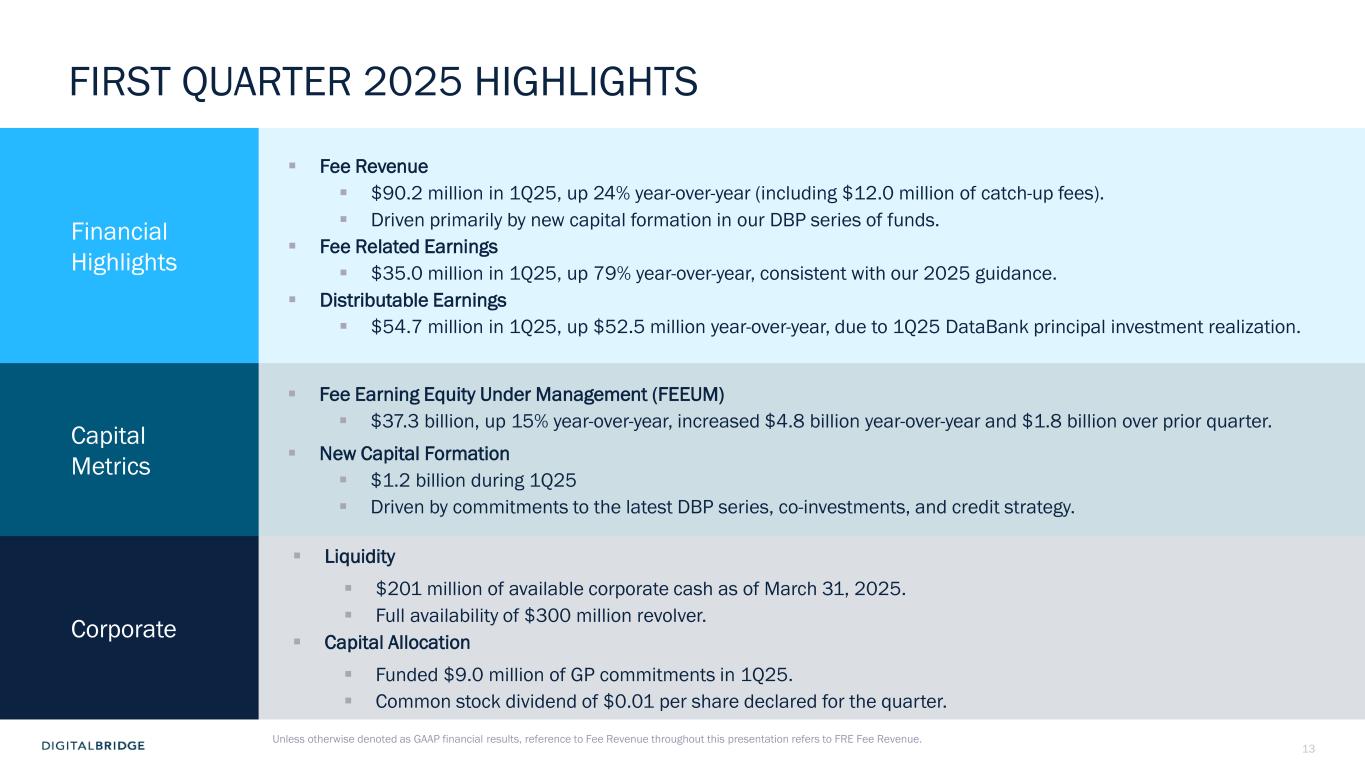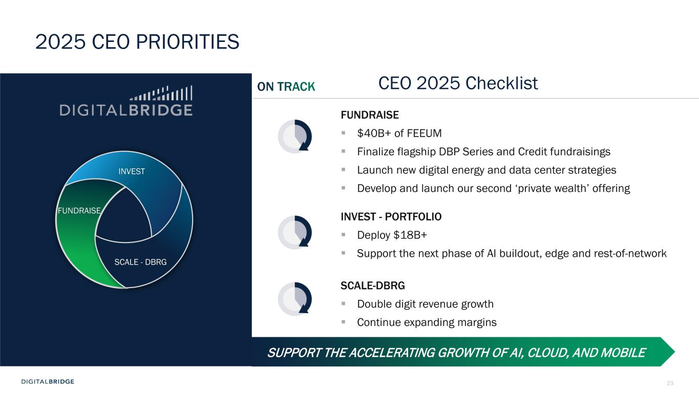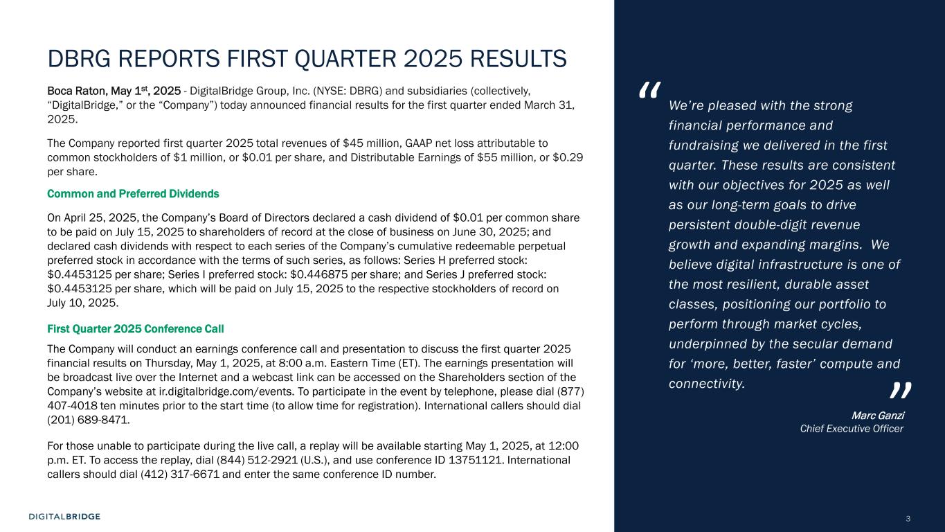 3 DBRG REPORTS FIRST QUARTER 2025 RESULTS Boca Raton, May 1st, 2025 - DigitalBridge Group, Inc. (NYSE: DBRG) and subsidiaries (collectively, “DigitalBridge,” or the “Company”) today announced financial results for the first quarter ended March 31, 2025. The Company reported first quarter 2025 total revenues of $45 million, GAAP net loss attributable to common stockholders of $1 million, or $0.01 per share, and Distributable Earnings of $55 million, or $0.29 per share. Common and Preferred Dividends On April 25, 2025, the Company’s Board of Directors declared a cash dividend of $0.01 per common share to be paid on July 15, 2025 to shareholders of record at the close of business on June 30, 2025; and declared cash dividends with respect to each series of the Company’s cumulative redeemable perpetual preferred stock in accordance with the terms of such series, as follows: Series H preferred stock: $0.4453125 per share; Series I preferred stock: $0.446875 per share; and Series J preferred stock: $0.4453125 per share, which will be paid on July 15, 2025 to the respective stockholders of record on July 10, 2025. First Quarter 2025 Conference Call The Company will conduct an earnings conference call and presentation to discuss the first quarter 2025 financial results on Thursday, May 1, 2025, at 8:00 a.m. Eastern Time (ET). The earnings presentation will be broadcast live over the Internet and a webcast link can be accessed on the Shareholders section of the Company’s website at ir.digitalbridge.com/events. To participate in the event by telephone, please dial (877) 407-4018 ten minutes prior to the start time (to allow time for registration). International callers should dial (201) 689-8471. For those unable to participate during the live call, a replay will be available starting May 1, 2025, at 12:00 p.m. ET. To access the replay, dial (844) 512-2921 (U.S.), and use conference ID 13751121. International callers should dial (412) 317-6671 and enter the same conference ID number. We’re pleased with the strong financial performance and fundraising we delivered in the first quarter. These results are consistent with our objectives for 2025 as well as our long-term goals to drive persistent double-digit revenue growth and expanding margins. We believe digital infrastructure is one of the most resilient, durable asset classes, positioning our portfolio to perform through market cycles, underpinned by the secular demand for ‘more, better, faster’ compute and connectivity. Marc Ganzi Chief Executive Officer “ ”