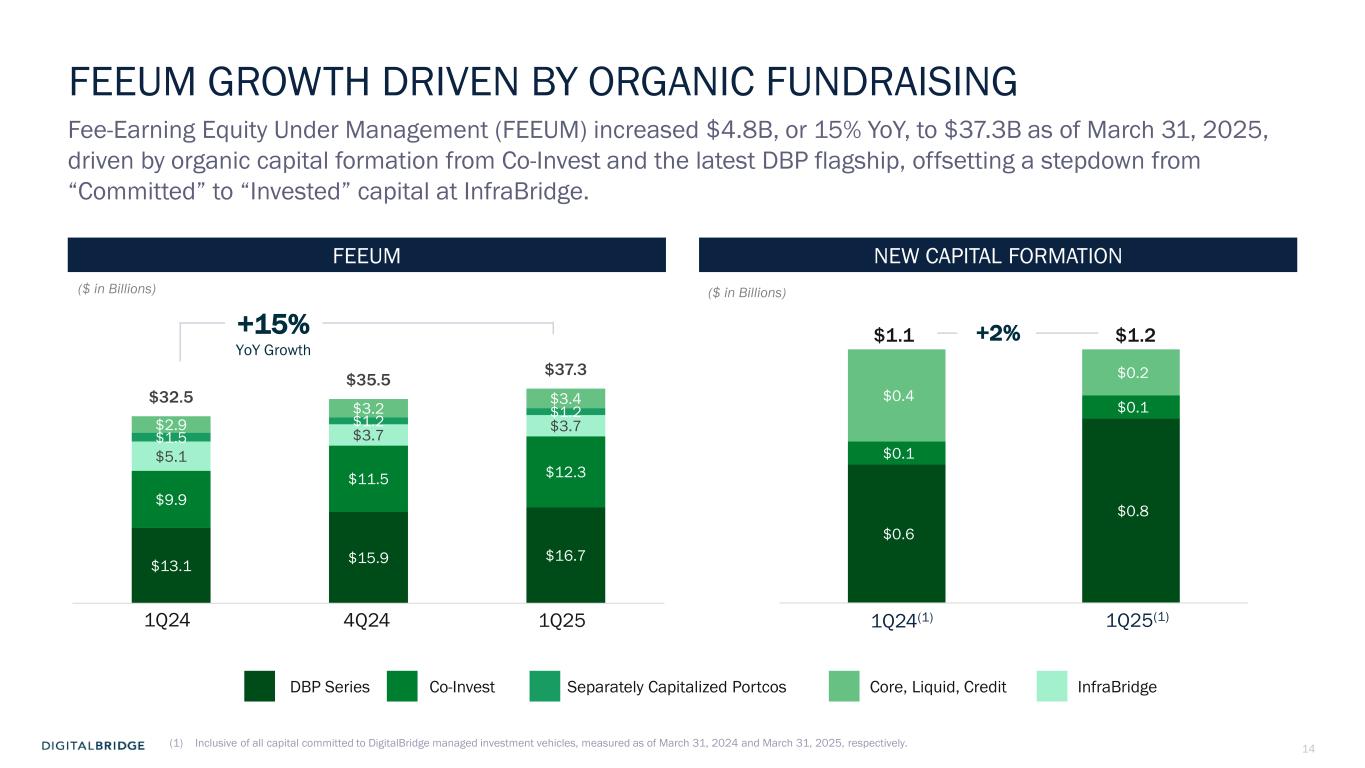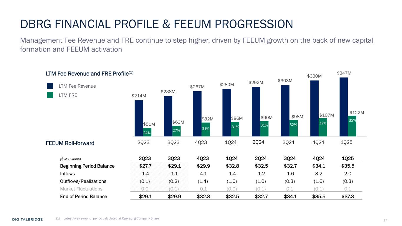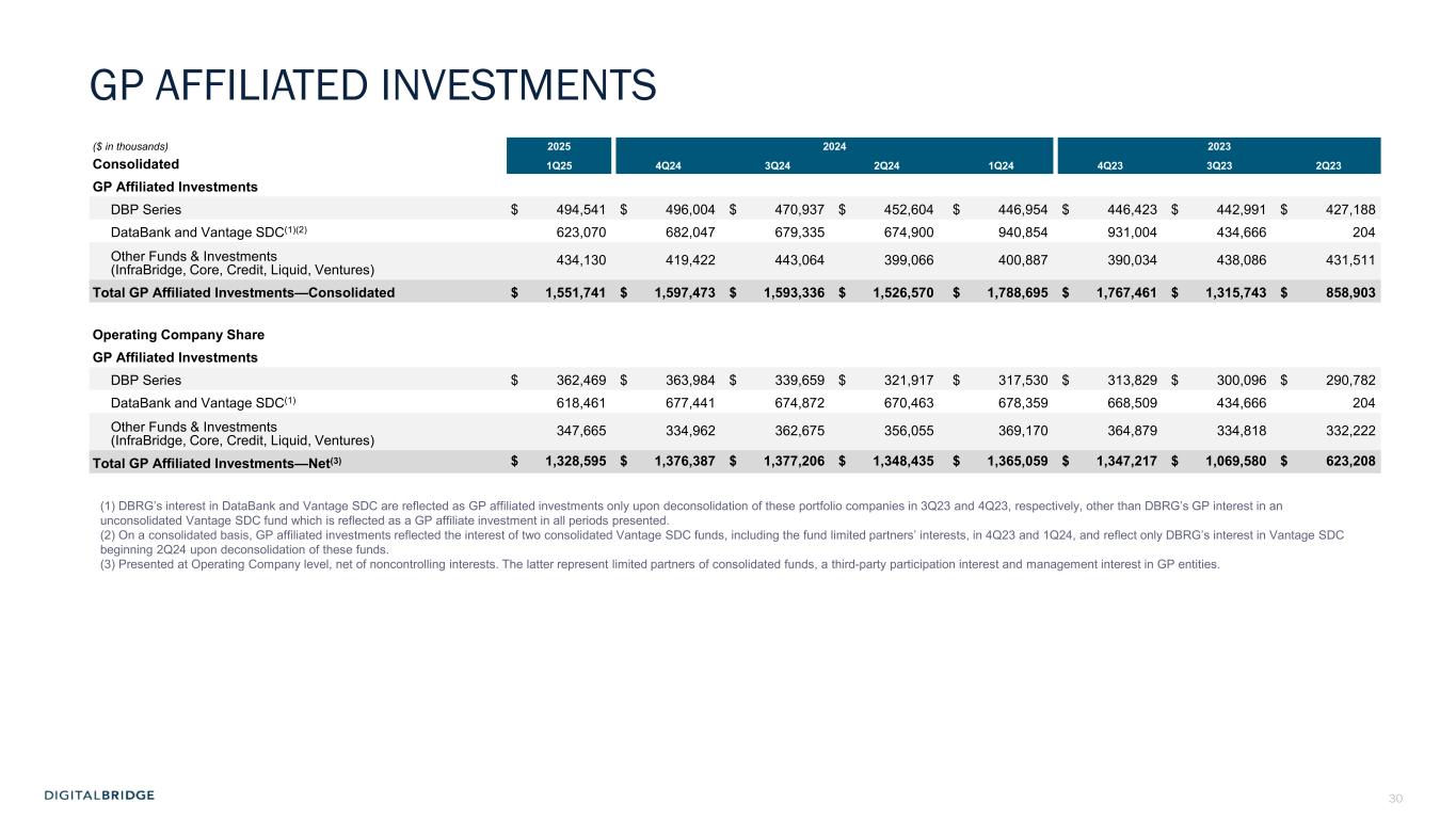 3 DBRG REPORTS FIRST QUARTER 2025 RESULTS Boca Raton, May 1st, 2025 - DigitalBridge Group, Inc. (NYSE: DBRG) and subsidiaries (collectively, “DigitalBridge,” or the “Company”) today announced financial results for the first quarter ended March 31, 2025. The Company reported first quarter 2025 total revenues of $45 million, GAAP net loss attributable to common stockholders of $1 million, or $0.01 per share, and Distributable Earnings of $55 million, or $0.29 per share. Common and Preferred Dividends On April 25, 2025, the Company’s Board of Directors declared a cash dividend of $0.01 per common share to be paid on July 15, 2025 to shareholders of record at the close of business on June 30, 2025; and declared cash dividends with respect to each series of the Company’s cumulative redeemable perpetual preferred stock in accordance with the terms of such series, as follows: Series H preferred stock: $0.4453125 per share; Series I preferred stock: $0.446875 per share; and Series J preferred stock: $0.4453125 per share, which will be paid on July 15, 2025 to the respective stockholders of record on July 10, 2025. First Quarter 2025 Conference Call The Company will conduct an earnings conference call and presentation to discuss the first quarter 2025 financial results on Thursday, May 1, 2025, at 8:00 a.m. Eastern Time (ET). The earnings presentation will be broadcast live over the Internet and a webcast link can be accessed on the Shareholders section of the Company’s website at ir.digitalbridge.com/events. To participate in the event by telephone, please dial (877) 407-4018 ten minutes prior to the start time (to allow time for registration). International callers should dial (201) 689-8471. For those unable to participate during the live call, a replay will be available starting May 1, 2025, at 12:00 p.m. ET. To access the replay, dial (844) 512-2921 (U.S.), and use conference ID 13751121. International callers should dial (412) 317-6671 and enter the same conference ID number. We’re pleased with the strong financial performance and fundraising we delivered in the first quarter. These results are consistent with our objectives for 2025 as well as our long-term goals to drive persistent double-digit revenue growth and expanding margins. We believe digital infrastructure is one of the most resilient, durable asset classes, positioning our portfolio to perform through market cycles, underpinned by the secular demand for ‘more, better, faster’ compute and connectivity. Marc Ganzi Chief Executive Officer “ ”