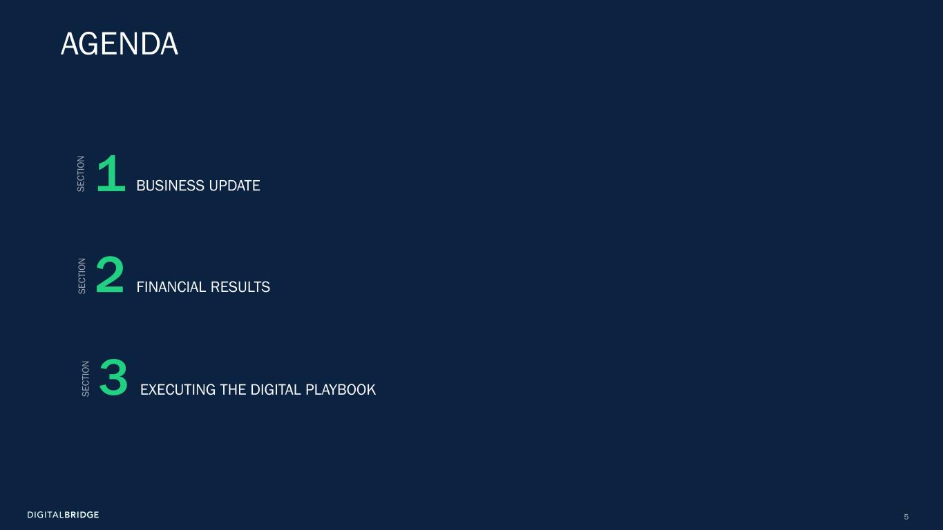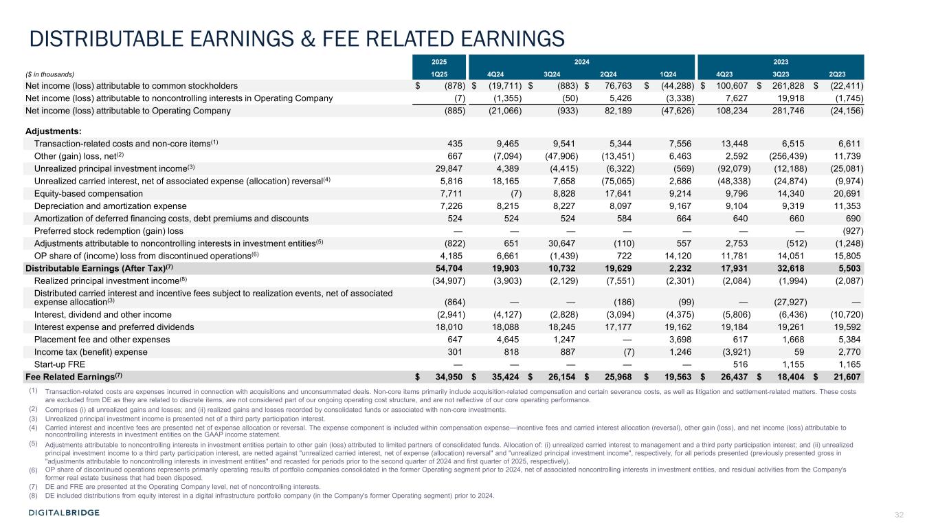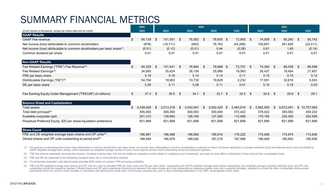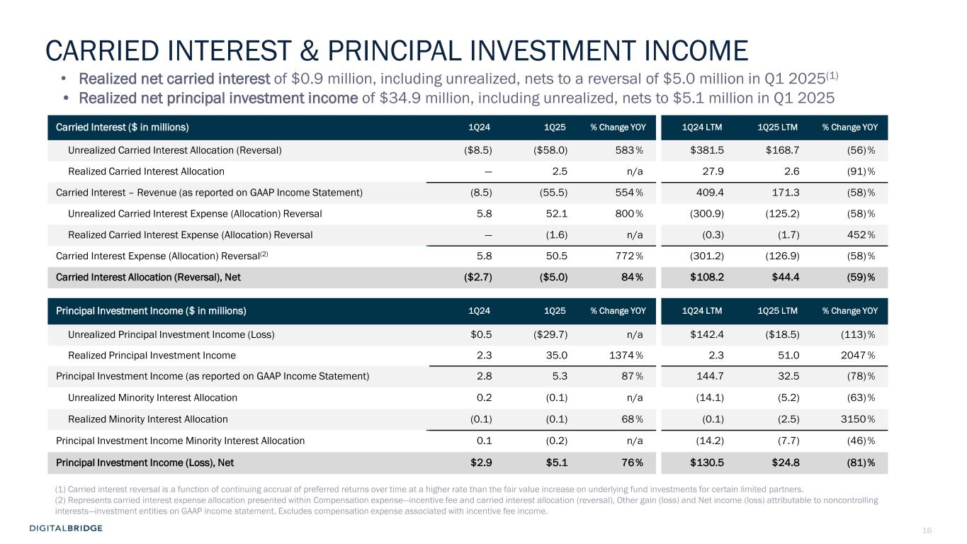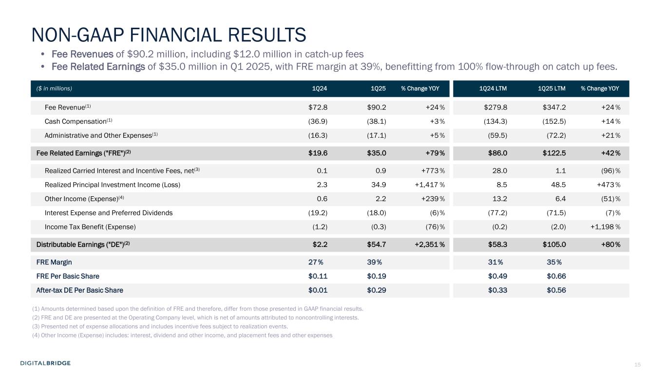 4 (In thousands, except per share data, unaudited) 1Q24 1Q25 Revenues Fee revenue $ 72,955 $ 90,139 Carried interest allocation (8,478) (55,464) Principal investment income 2,845 5,307 Other income 7,071 5,465 Total revenues 74,393 45,447 Expenses Compensation expense—cash and equity-based 51,184 46,110 Compensation expense—incentive fee and carried interest allocation (6,714) (22,304) Administrative and other expenses 24,310 15,946 Interest expense 5,192 3,898 Transaction-related costs 760 4,421 Depreciation and amortization 9,167 7,226 Total expenses 83,899 55,297 Other income (loss) Other gain (loss), net (5,894) (519) Income (loss) from continuing operations before income taxes (15,400) (10,369) Income tax benefit (expense) (1,246) (301) Income (loss) from continuing operations (16,646) (10,670) Income (loss) from discontinued operations (14,120) (4,185) Net income (loss) (30,766) (14,855) Net income (loss) attributable to noncontrolling interests: Redeemable noncontrolling interests 733 (748) Investment entities 1,467 (27,882) Operating Company (3,338) (7) Net income (loss) attributable to DigitalBridge Group, Inc. (29,628) 13,782 Preferred stock dividends 14,660 14,660 Net income (loss) attributable to common stockholders $ (44,288) $ (878) Net income (loss) attributable to common stockholders per common share—basic $ (0.28) $ (0.01) Net income (loss) attributable to common stockholders per common share—diluted $ (0.28) $ (0.01) GAAP FINANCIAL RESULTS Net loss attributable to common stockholders was $0.9 million in Q1 2025, and $0.01 per share (basic and diluted)