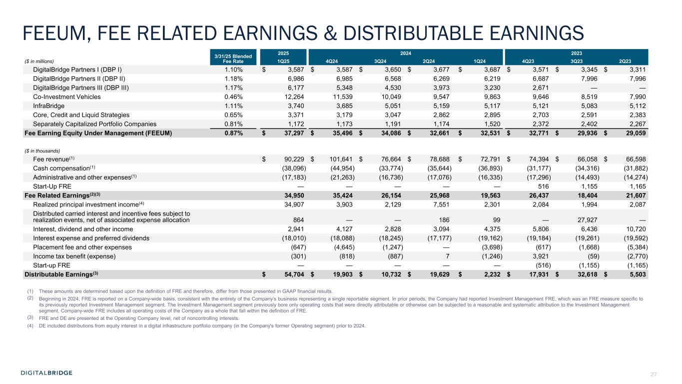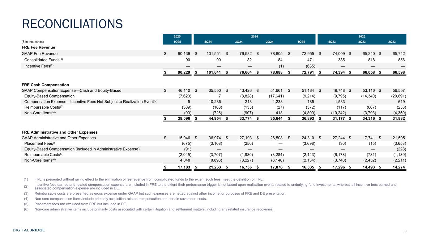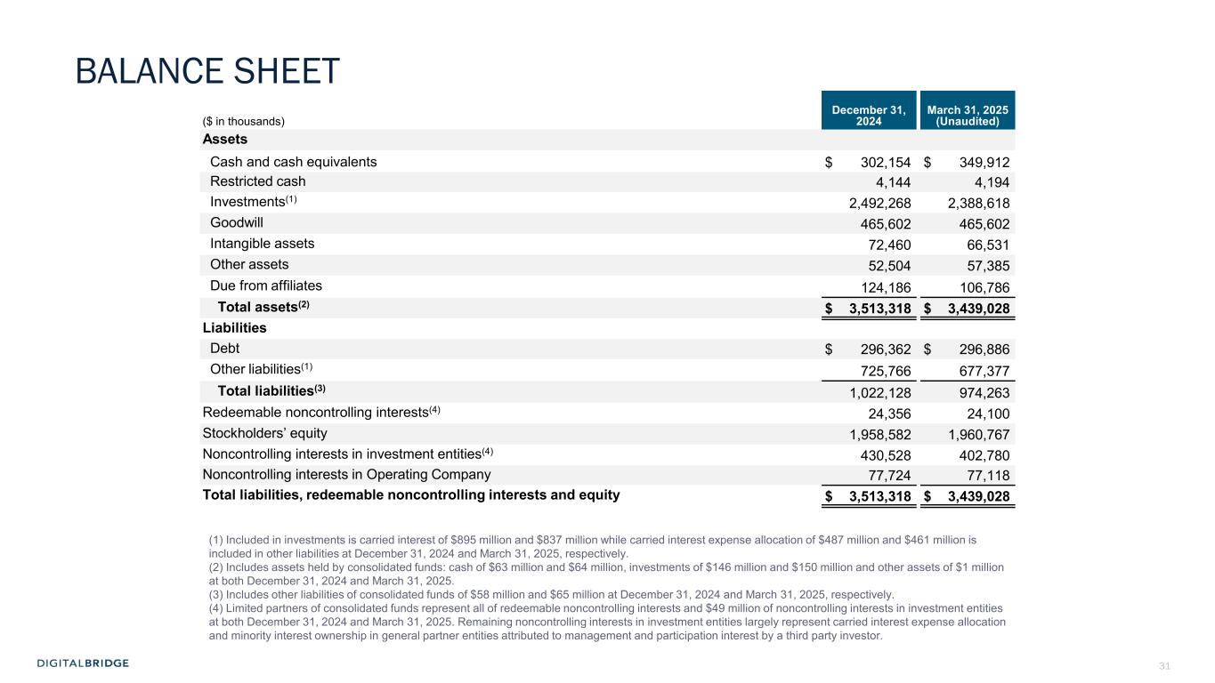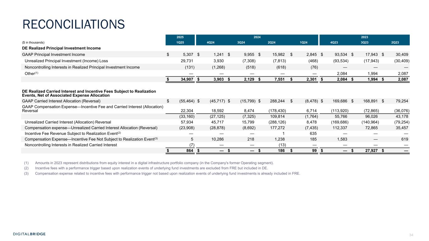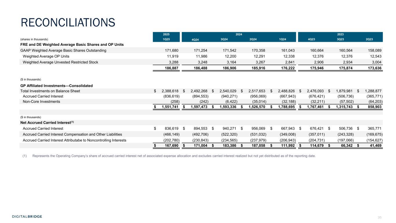 4 (In thousands, except per share data, unaudited) 1Q24 1Q25 Revenues Fee revenue $ 72,955 $ 90,139 Carried interest allocation (8,478) (55,464) Principal investment income 2,845 5,307 Other income 7,071 5,465 Total revenues 74,393 45,447 Expenses Compensation expense—cash and equity-based 51,184 46,110 Compensation expense—incentive fee and carried interest allocation (6,714) (22,304) Administrative and other expenses 24,310 15,946 Interest expense 5,192 3,898 Transaction-related costs 760 4,421 Depreciation and amortization 9,167 7,226 Total expenses 83,899 55,297 Other income (loss) Other gain (loss), net (5,894) (519) Income (loss) from continuing operations before income taxes (15,400) (10,369) Income tax benefit (expense) (1,246) (301) Income (loss) from continuing operations (16,646) (10,670) Income (loss) from discontinued operations (14,120) (4,185) Net income (loss) (30,766) (14,855) Net income (loss) attributable to noncontrolling interests: Redeemable noncontrolling interests 733 (748) Investment entities 1,467 (27,882) Operating Company (3,338) (7) Net income (loss) attributable to DigitalBridge Group, Inc. (29,628) 13,782 Preferred stock dividends 14,660 14,660 Net income (loss) attributable to common stockholders $ (44,288) $ (878) Net income (loss) attributable to common stockholders per common share—basic $ (0.28) $ (0.01) Net income (loss) attributable to common stockholders per common share—diluted $ (0.28) $ (0.01) GAAP FINANCIAL RESULTS Net loss attributable to common stockholders was $0.9 million in Q1 2025, and $0.01 per share (basic and diluted)