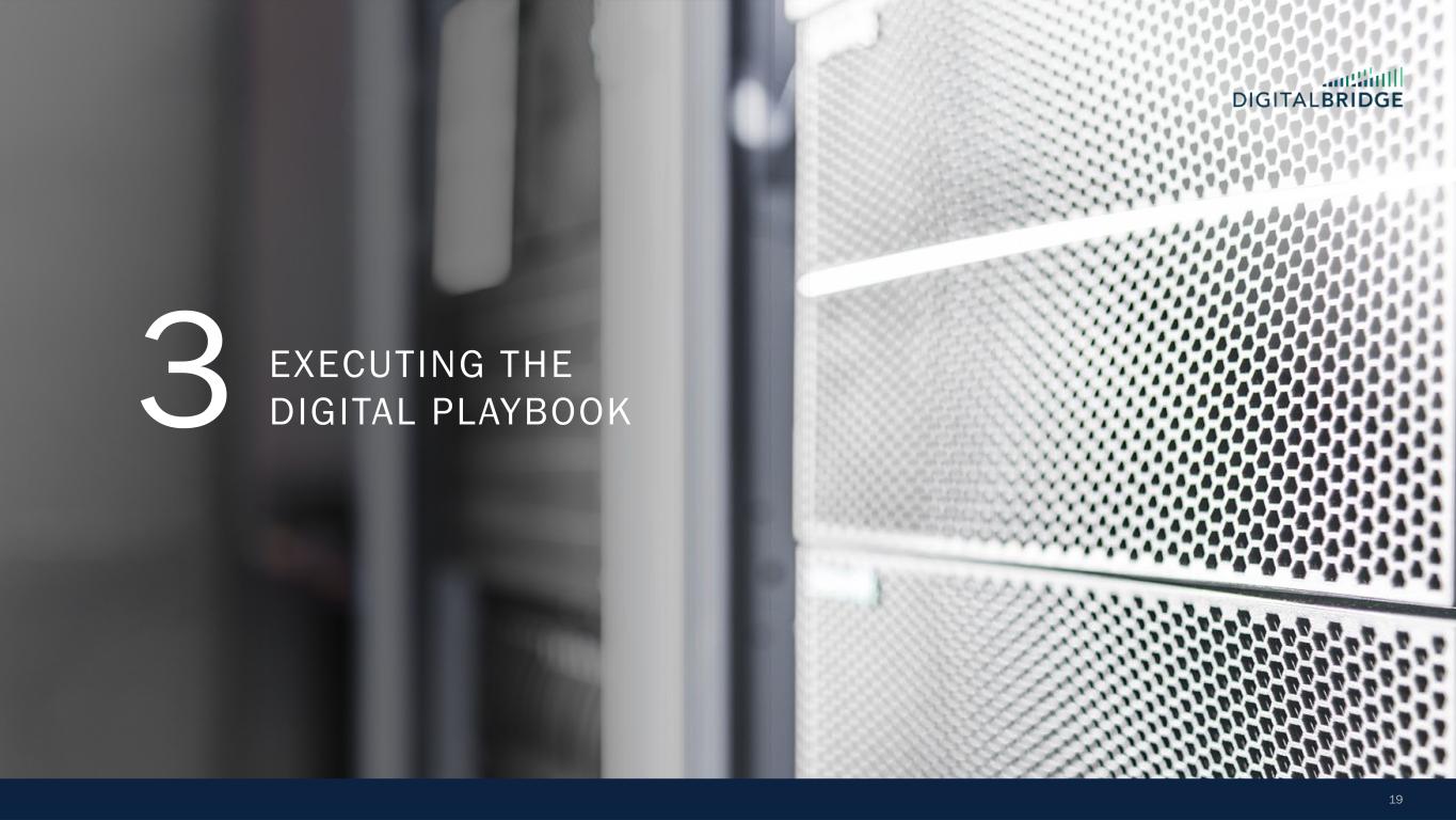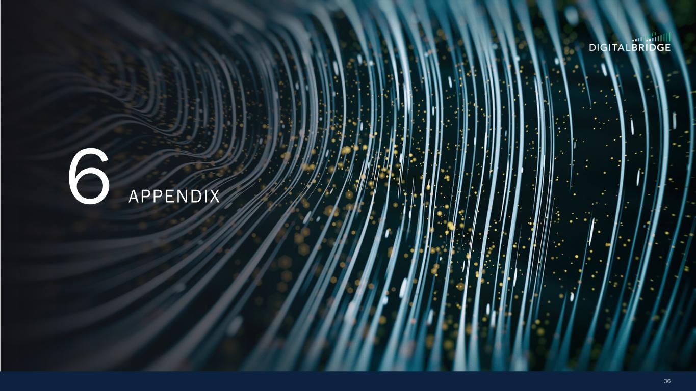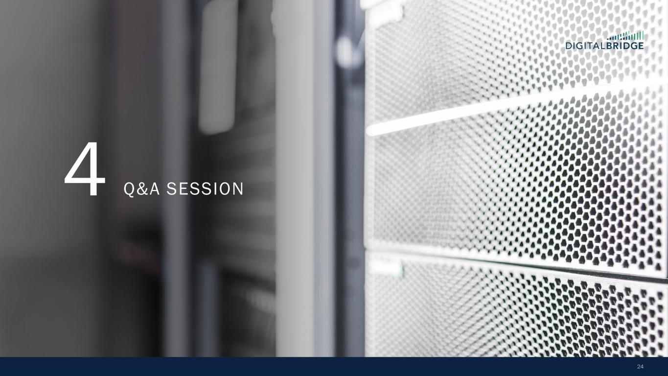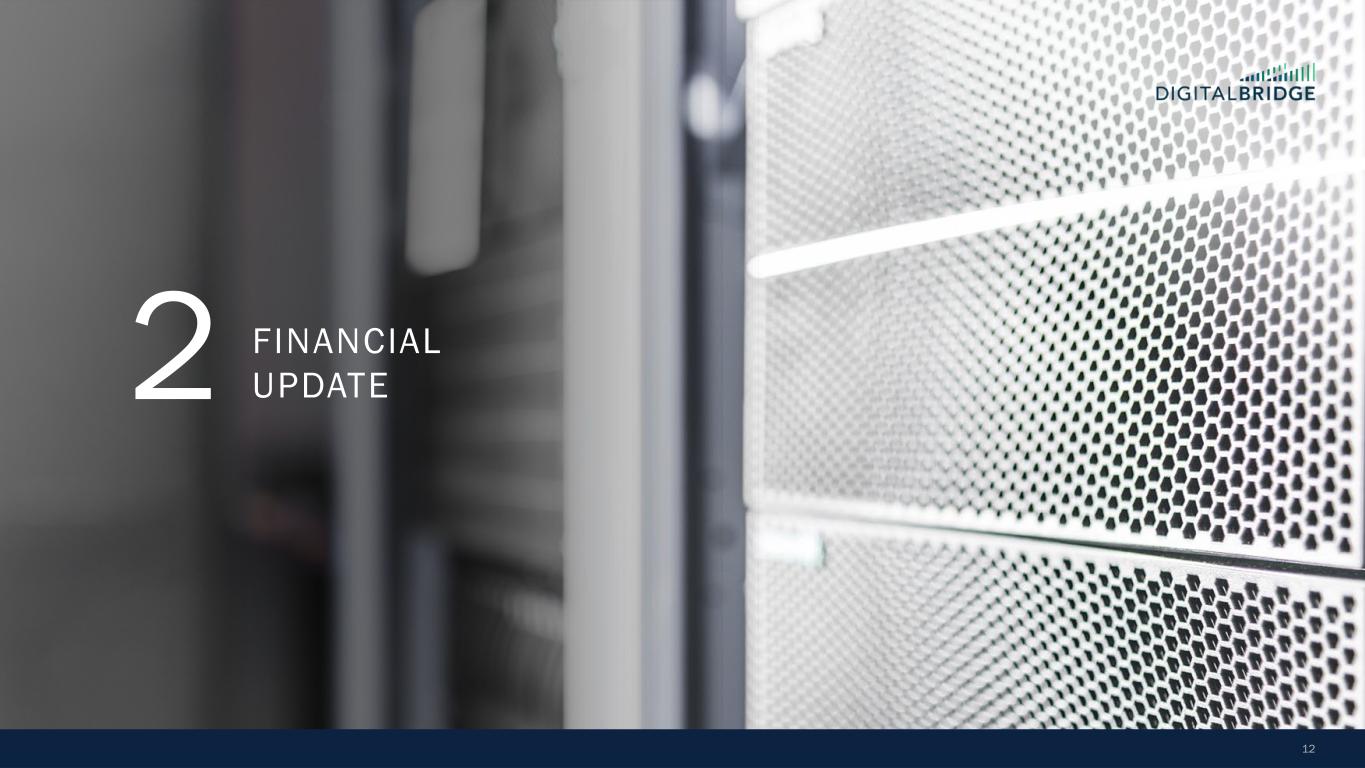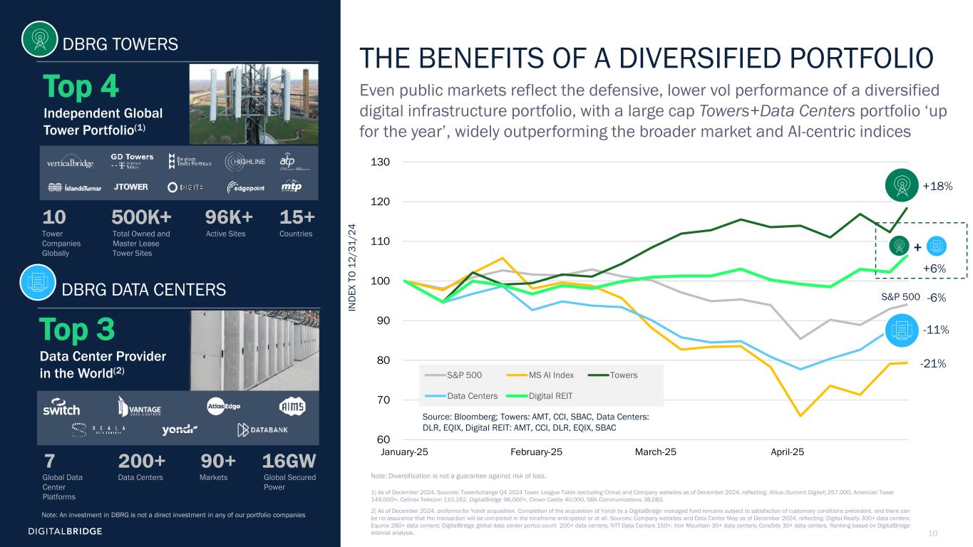 10 60 70 80 90 100 110 120 130 January-25 February-25 March-25 April-25 S&P 500 MS AI Index Towers Data Centers Digital REIT THE BENEFITS OF A DIVERSIFIED PORTFOLIO Even public markets reflect the defensive, lower vol performance of a diversified digital infrastructure portfolio, with a large cap Towers+Data Centers portfolio ‘up for the year’, widely outperforming the broader market and AI-centric indices 1) As of December 2024. Sources: TowerXchange Q4 2024 Tower League Table (excluding China) and Company websites as of December 2024, reflecting: Altius (Summit Digitel) 257,000, American Tower 149,000+, Cellnex Telecom 110,162, DigitalBridge 96,000+, Crown Castle 40,000, SBA Communications 38,082. 2) As of December 2024, proforma for Yondr acquisition. Completion of the acquisition of Yondr by a DigitalBridge managed fund remains subject to satisfaction of customary conditions precedent, and there can be no assurance that the transaction will be completed in the timeframe anticipated or at all. Sources: Company websites and Data Center Map as of December 2024, reflecting: Digital Realty 300+ data centers; Equinix 260+ data centers; DigitalBridge global data center portco count 200+ data centers; NTT Data Centers 150+; Iron Mountain 30+ data centers; CoreSite 30+ data centers. Ranking based on DigitalBridge internal analysis. +18% -6% -11% -21% S&P 500 +6% + IN D EX T O 12 /3 1/ 24 Global Data Center Platforms Data Centers Markets 7 200+ 90+ 16GW Global Secured Power DBRG TOWERS DBRG DATA CENTERS Tower Companies Globally Active Sites CountriesTotal Owned and Master Lease Tower Sites 10 500K+ 96K+ 15+ Top 4 Independent Global Tower Portfolio(1) Top 3 Data Center Provider in the World(2) Source: Bloomberg; Towers: AMT, CCI, SBAC, Data Centers: DLR, EQIX, Digital REIT: AMT, CCI, DLR, EQIX, SBAC Note: An investment in DBRG is not a direct investment in any of our portfolio companies Note: Diversification is not a guarantee against risk of loss.