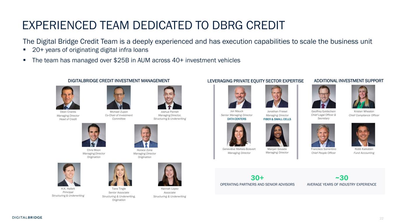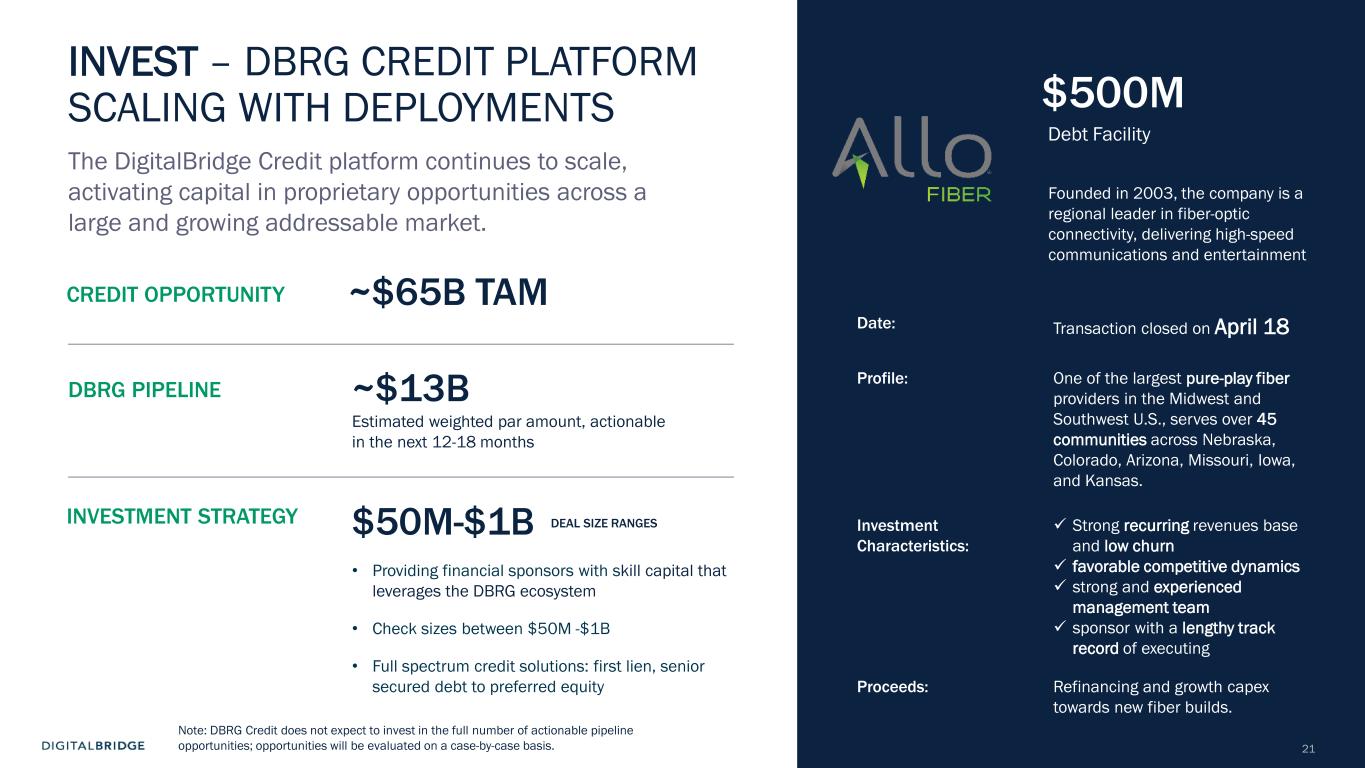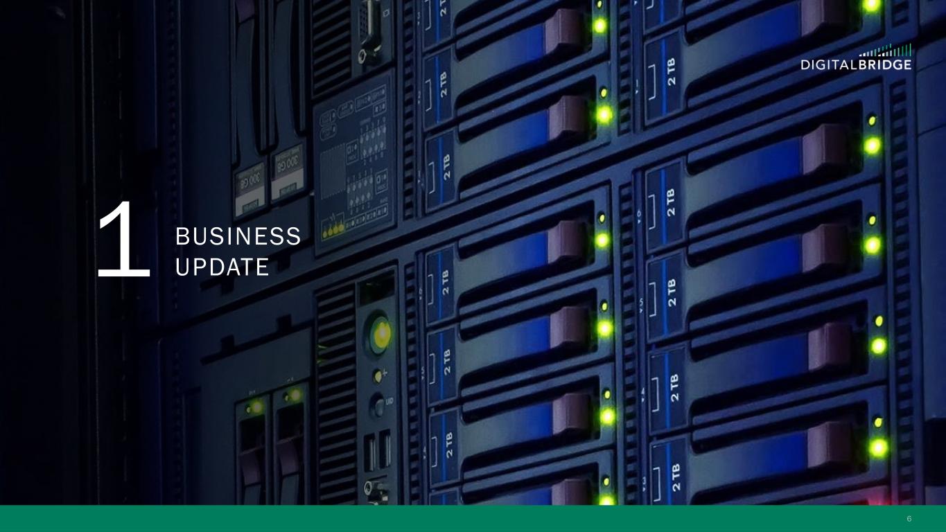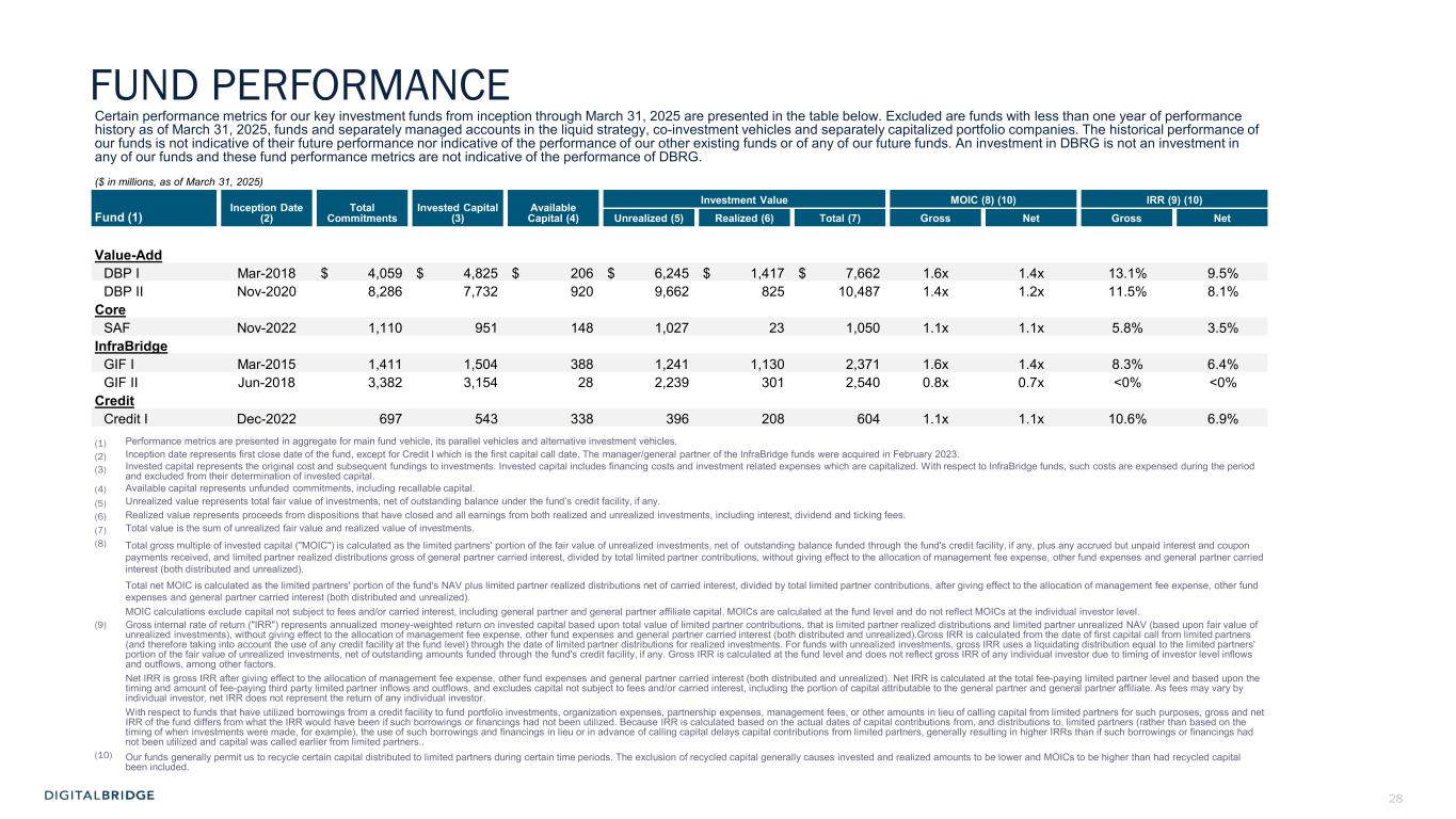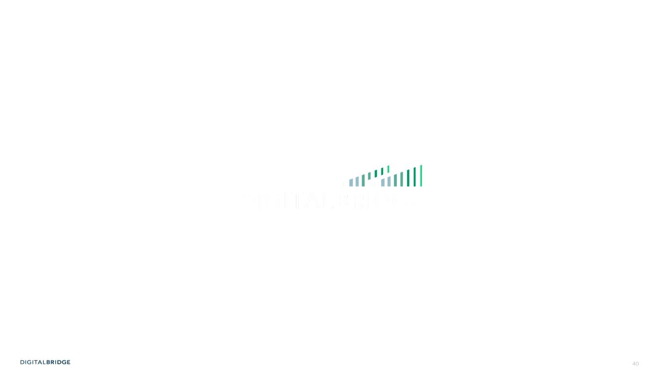 10 60 70 80 90 100 110 120 130 January-25 February-25 March-25 April-25 S&P 500 MS AI Index Towers Data Centers Digital REIT THE BENEFITS OF A DIVERSIFIED PORTFOLIO Even public markets reflect the defensive, lower vol performance of a diversified digital infrastructure portfolio, with a large cap Towers+Data Centers portfolio ‘up for the year’, widely outperforming the broader market and AI-centric indices 1) As of December 2024. Sources: TowerXchange Q4 2024 Tower League Table (excluding China) and Company websites as of December 2024, reflecting: Altius (Summit Digitel) 257,000, American Tower 149,000+, Cellnex Telecom 110,162, DigitalBridge 96,000+, Crown Castle 40,000, SBA Communications 38,082. 2) As of December 2024, proforma for Yondr acquisition. Completion of the acquisition of Yondr by a DigitalBridge managed fund remains subject to satisfaction of customary conditions precedent, and there can be no assurance that the transaction will be completed in the timeframe anticipated or at all. Sources: Company websites and Data Center Map as of December 2024, reflecting: Digital Realty 300+ data centers; Equinix 260+ data centers; DigitalBridge global data center portco count 200+ data centers; NTT Data Centers 150+; Iron Mountain 30+ data centers; CoreSite 30+ data centers. Ranking based on DigitalBridge internal analysis. +18% -6% -11% -21% S&P 500 +6% + IN D EX T O 12 /3 1/ 24 Global Data Center Platforms Data Centers Markets 7 200+ 90+ 16GW Global Secured Power DBRG TOWERS DBRG DATA CENTERS Tower Companies Globally Active Sites CountriesTotal Owned and Master Lease Tower Sites 10 500K+ 96K+ 15+ Top 4 Independent Global Tower Portfolio(1) Top 3 Data Center Provider in the World(2) Source: Bloomberg; Towers: AMT, CCI, SBAC, Data Centers: DLR, EQIX, Digital REIT: AMT, CCI, DLR, EQIX, SBAC Note: An investment in DBRG is not a direct investment in any of our portfolio companies Note: Diversification is not a guarantee against risk of loss.