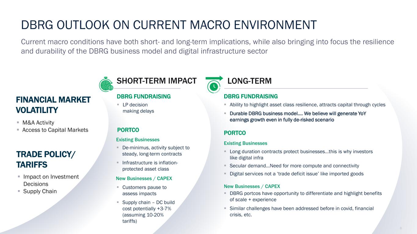 7 BUSINESS UPDATE (1) Inclusive of all capital committed to DigitalBridge managed investment vehicles, measured as of March 31, 2025. Strategic Growth Across Our Portfolio • DigitalBridge portfolio company Zayo announced $4.5 billion acquisition of Crown Castle Fiber business • Transaction will position Zayo to serve growing AI-led connectivity demand, particularly in key metro markets • Accretive transaction lowers effective entry multiple Strong Financial Performance with Solid Revenue and Earnings Growth • Fee Revenues of $90 million grew +24% YoY in 1Q25, supported by fundraising for DBP Flagship. • Fee-Related Earnings (FRE) of $35 million +79% YoY in 1Q25. • Continued margin improvement, supported by catch-up fee flow-through. $$$ DBRG delivered 1Q25 financial performance and fundraising in line with our objectives and continues to benefit from the resilience of digital infrastructure and its diversified portfolio Note: Readers should refer to the discussion in the Cautionary Statement Regarding Forward-Looking Statements section at the beginning of this presentation. There is no guarantee that margins will expand as expected. Diversification is not a guarantee against risk of loss. New capital formation of $1.2b in 1Q25 • Led by continuing commitments to our flagship DBP III of $0.8 billion representing 72% of total. INVESTSCALE FUNDRAISE INVEST FUNDRAISE SCALE - DBRG $0.8 DBP Series Co-Invest Core, Credit, Liquid 1Q 2025(1) Average Fee Rate of >1% DBP $1.2 billion