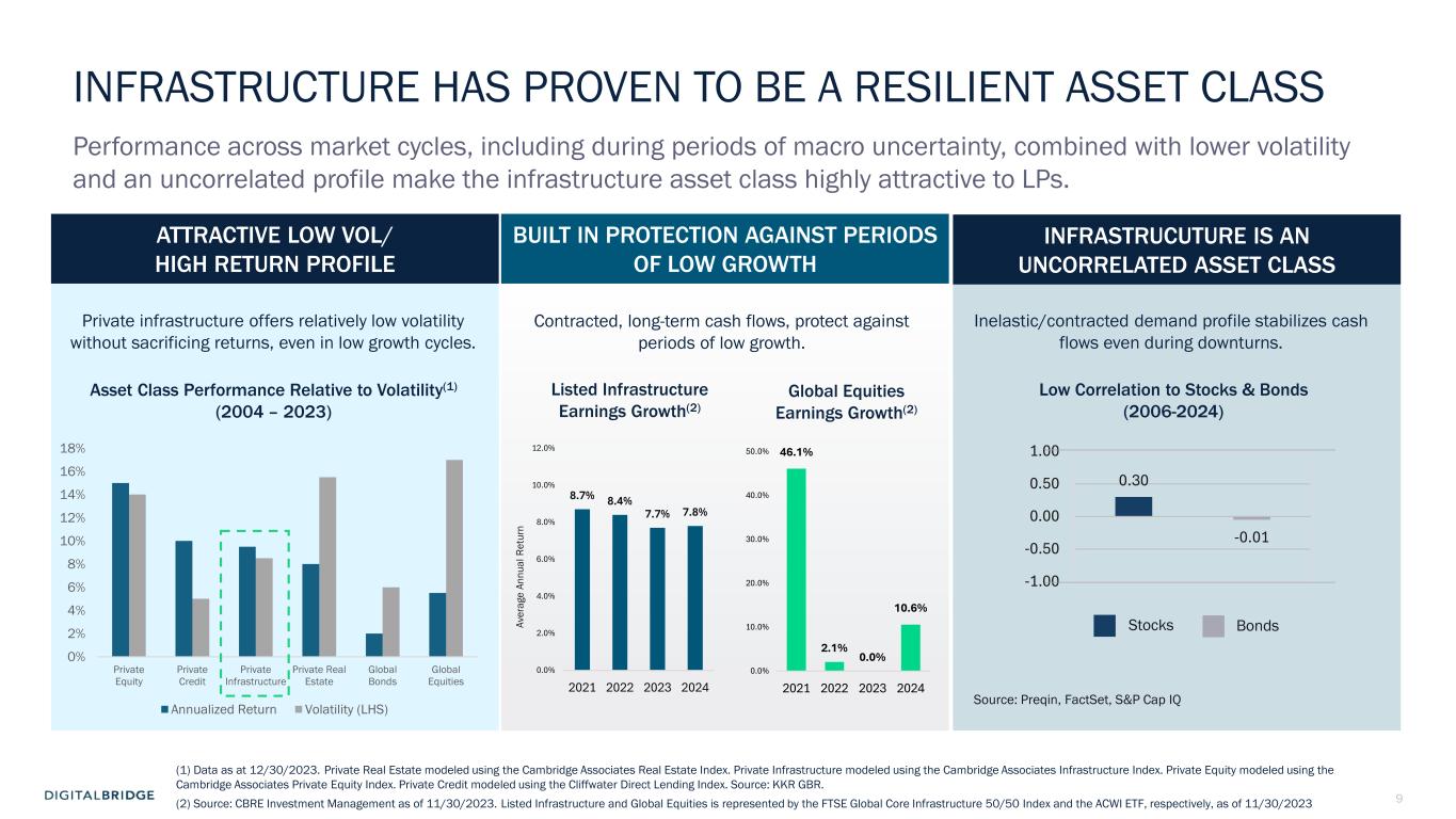 8 LONG-TERM DBRG OUTLOOK ON CURRENT MACRO ENVIRONMENT SHORT-TERM IMPACT Current macro conditions have both short- and long-term implications, while also bringing into focus the resilience and durability of the DBRG business model and digital infrastructure sector TRADE POLICY/ TARIFFS FINANCIAL MARKET VOLATILITY Impact on Investment Decisions Supply Chain M&A Activity Access to Capital Markets Customers pause to assess impacts Supply chain – DC build cost potentially +3-7% (assuming 10-20% tariffs) PORTCO New Businesses / CAPEX DBRG FUNDRAISING LP decision making delays De-minimus, activity subject to steady, long-term contracts Infrastructure is inflation- protected asset class Existing Businesses PORTCO DBRG FUNDRAISING Ability to highlight asset class resilience, attracts capital through cycles Durable DBRG business model…. We believe will generate YoY earnings growth even in fully de-risked scenario Long duration contracts protect businesses...this is why investors like digital infra Secular demand…Need for more compute and connectivity Digital services not a ‘trade deficit issue’ like imported goods DBRG portcos have opportunity to differentiate and highlight benefits of scale + experience Similar challenges have been addressed before in covid, financial crisis, etc. New Businesses / CAPEX Existing Businesses