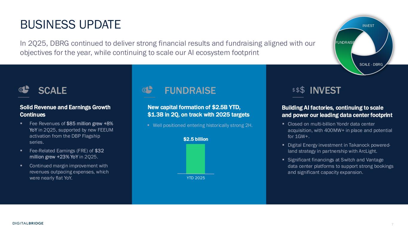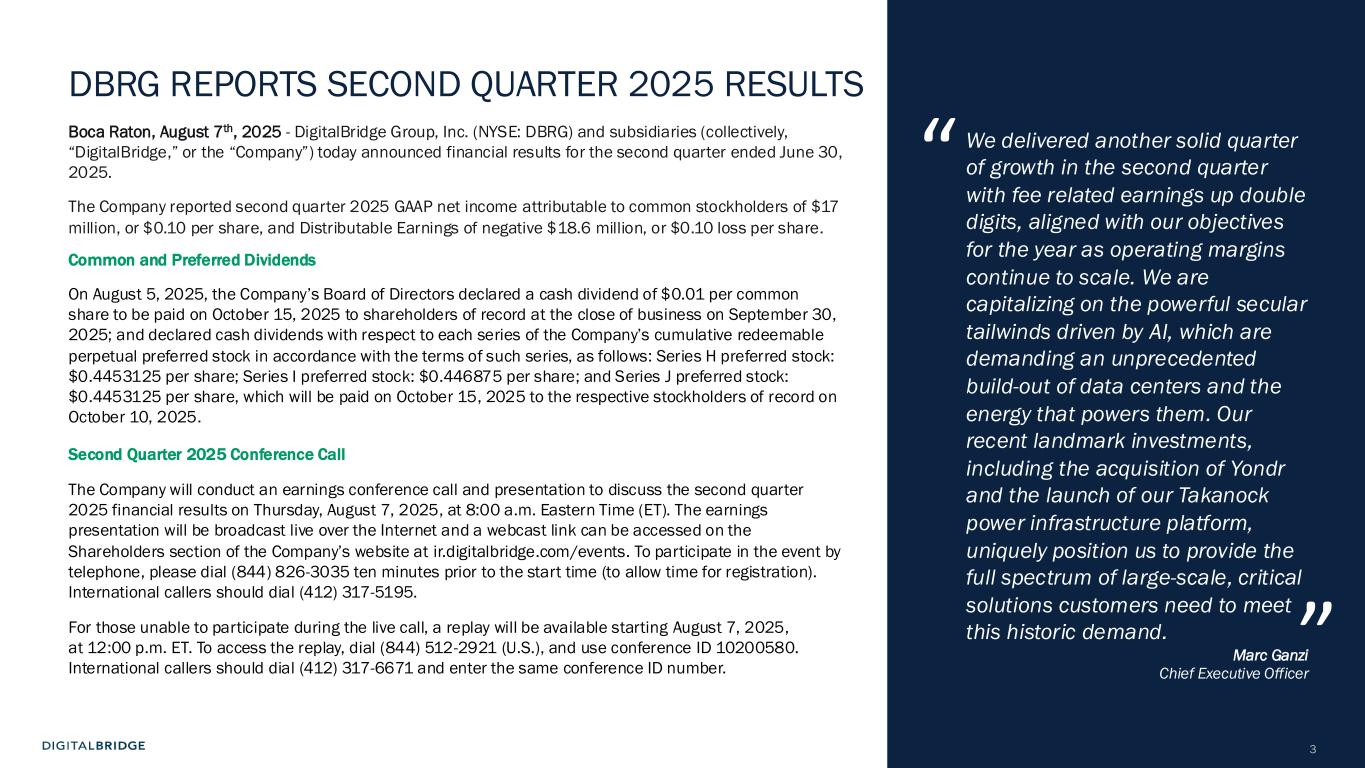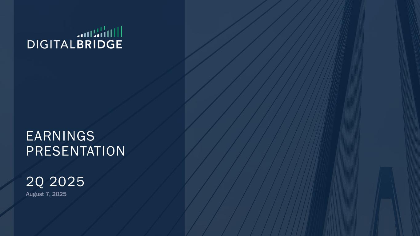 3 DBRG REPORTS SECOND QUARTER 2025 RESULTS Boca Raton, August 7th, 2025 - DigitalBridge Group, Inc. (NYSE: DBRG) and subsidiaries (collectively, “DigitalBridge,” or the “Company”) today announced financial results for the second quarter ended June 30, 2025. The Company reported second quarter 2025 GAAP net income attributable to common stockholders of $17 million, or $0.10 per share, and Distributable Earnings of negative $18.6 million, or $0.10 loss per share. Common and Preferred Dividends On August 5, 2025, the Company’s Board of Directors declared a cash dividend of $0.01 per common share to be paid on October 15, 2025 to shareholders of record at the close of business on September 30, 2025; and declared cash dividends with respect to each series of the Company’s cumulative redeemable perpetual preferred stock in accordance with the terms of such series, as follows: Series H preferred stock: $0.4453125 per share; Series I preferred stock: $0.446875 per share; and Series J preferred stock: $0.4453125 per share, which will be paid on October 15, 2025 to the respective stockholders of record on October 10, 2025. Second Quarter 2025 Conference Call The Company will conduct an earnings conference call and presentation to discuss the second quarter 2025 financial results on Thursday, August 7, 2025, at 8:00 a.m. Eastern Time (ET). The earnings presentation will be broadcast live over the Internet and a webcast link can be accessed on the Shareholders section of the Company’s website at ir.digitalbridge.com/events. To participate in the event by telephone, please dial (844) 826-3035 ten minutes prior to the start time (to allow time for registration). International callers should dial (412) 317-5195. For those unable to participate during the live call, a replay will be available starting August 7, 2025, at 12:00 p.m. ET. To access the replay, dial (844) 512-2921 (U.S.), and use conference ID 10200580. International callers should dial (412) 317-6671 and enter the same conference ID number. We delivered another solid quarter of growth in the second quarter with fee related earnings up double digits, aligned with our objectives for the year as operating margins continue to scale. We are capitalizing on the powerful secular tailwinds driven by AI, which are demanding an unprecedented build-out of data centers and the energy that powers them. Our recent landmark investments, including the acquisition of Yondr and the launch of our Takanock power infrastructure platform, uniquely position us to provide the full spectrum of large-scale, critical solutions customers need to meet this historic demand. Marc Ganzi Chief Executive Officer “ ”