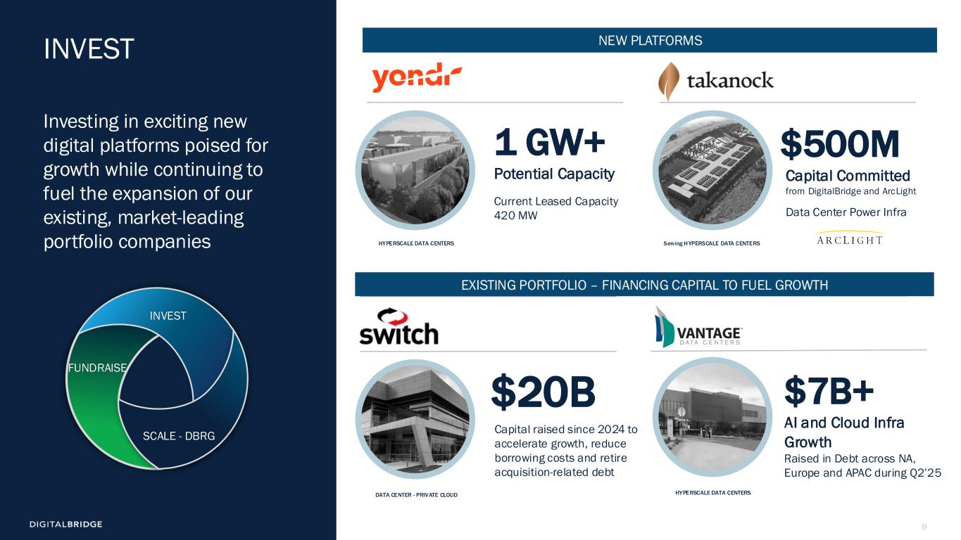 8 2025 YTD FUNDRAISING ON TRACK TO FULL-YEAR OBJECTIVE FEEUM PROGRESS TOWARD 2025 GUIDANCE $40B Target DBP III UPDATE $39.7B $2.5B 2Q 2025 July 31, 2025 DBP Series Co-Invest Core, Credit, Liquid 2Q 2025 $6.6B 6/30/25 $6.9B1 $2.5B CAPITAL FORMATION METRICS POSITIONED TO ACHIEVE TARGETS ▪ Additional 3Q25 capital from DBP Series and contribution from new strategies to continue to drive 2H25 capital formation ▪ Co-invest fee rate 30% higher than average At mid-year, fundraising is tracking to our objectives, from new capital formation to FEEUM growth. Notably, average fees on co-invest expanded as DBRG platforms mature and AI infrastructure continues to attract LPs ▪ Activated FEEUM, key metric to drive revenue and earnings, set to achieve 2025 targets ▪ Raised $6.9 billion to date 1) Includes sponsor commitments. Note: There can be no assurance that actual amounts will not be materially higher or lower than expectations. Readers should refer to the discussion in the Cautionary Statement Regarding Forward-Looking Statements section at the beginning of this presentation. The Company undertakes no obligation to prov ide updated projections on a quarterly or other basis.