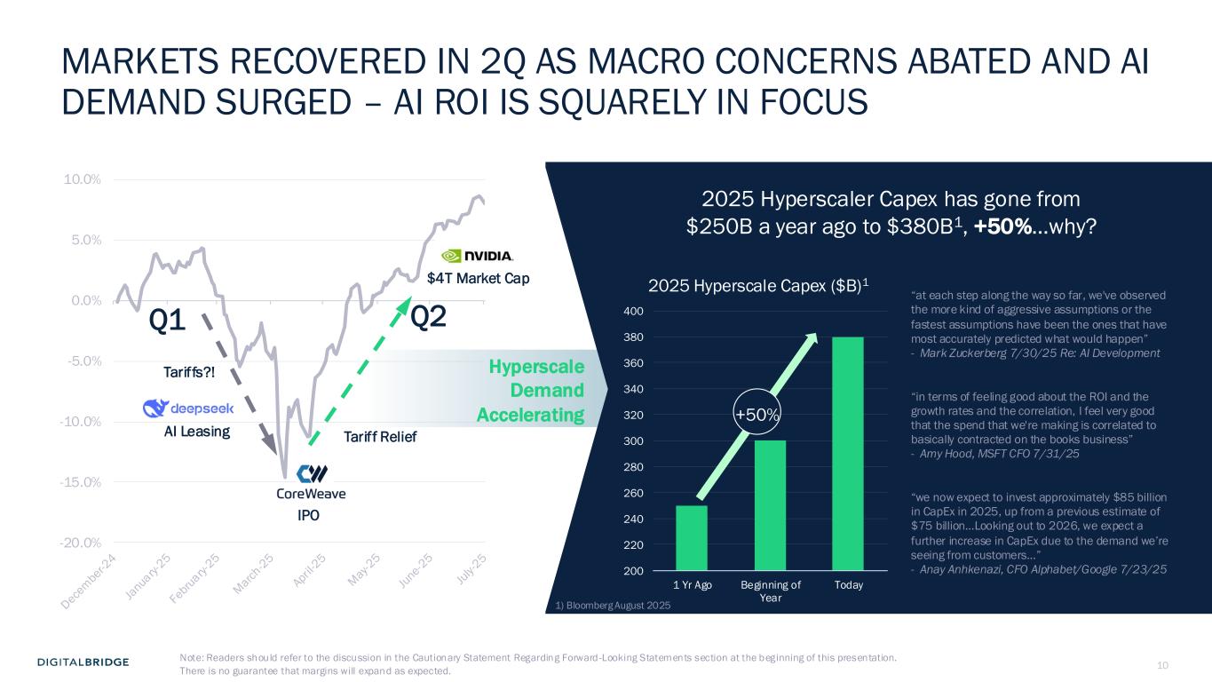 9 INVEST Investing in exciting new digital platforms poised for growth while continuing to fuel the expansion of our existing, market-leading portfolio companies $20B 1 GW+ Potential Capacity DATA CENTER - PRIVATE CLOUD Capital Committed from DigitalBridge and ArcLight Data Center Power Infra $500M Serving HYPERSCALE DATA CENTERS INVEST FUNDRAISE SCALE - DBRG Current Leased Capacity 420 MW HYPERSCALE DATA CENTERS Raised in Debt across NA, Europe and APAC during Q2’25 HYPERSCALE DATA CENTERS $7B+ AI and Cloud Infra Growth EXISTING PORTFOLIO – FINANCING CAPITAL TO FUEL GROWTH NEW PLATFORMS Capital raised since 2024 to accelerate growth, reduce borrowing costs and retire acquisition-related debt