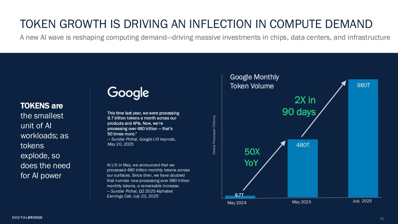11 This time last year, we were processing 9.7 trillion tokens a month across our products and APIs. Now, we’re processing over 480 trillion — that’s 50 times more.” — Sundar Pichai, Google I/O keynote, May 20, 2025 A new AI wave is reshaping computing demand—driving massive investments in chips, data centers, and infrastructure TOKEN GROWTH IS DRIVING AN INFLECTION IN COMPUTE DEMAND Google Monthly Token Volume At I/O in May, we announced that we processed 480 trillion monthly tokens across our surfaces. Since then, we have doubled that number now processing over 980 trillion monthly tokens, a remarkable increase. — Sundar Pichai, Q2 2025 Alphabet Earnings Call, July 23, 2025 50X YoY May 2025May 2024 T o k e n s P ro c e s s e d ( T ri ll io n s ) July 2025 980T 480T 9.7T 2X in 90 days TOKENS are the smallest unit of AI workloads; as tokens explode, so does the need for AI power